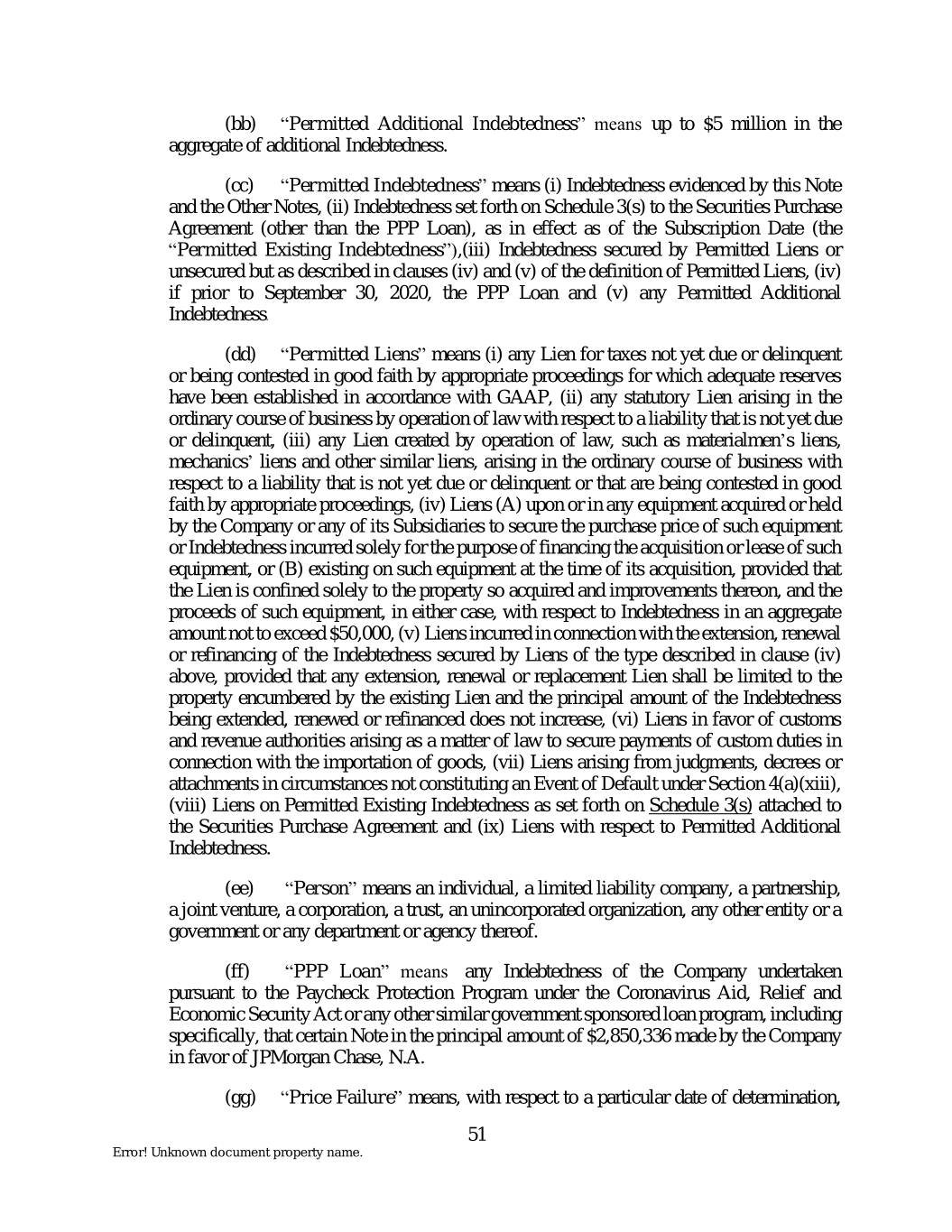 (bb) “Permitted Additional Indebtedness” means up to $5 million in the aggregate of additional Indebtedness. (cc) “Permitted Indebtedness” means (i) Indebtedness evidenced by this Note and the Other Notes, (ii) Indebtedness set forth on Schedule 3(s) to the Securities Purchase Agreement (other than the PPP Loan), as in effect as of the Subscription Date (the “Permitted Existing Indebtedness”),(iii) Indebtedness secured by Permitted Liens or unsecured but as described in clauses (iv) and (v) of the definition of Permitted Liens, (iv) if prior to September 30, 2020, the PPP Loan and (v) any Permitted Additional Indebtedness. (dd) “Permitted Liens” means (i) any Lien for taxes not yet due or delinquent or being contested in good faith by appropriate proceedings for which adequate reserves have been established in accordance with GAAP, (ii) any statutory Lien arising in the ordinary course of business by operation of law with respect to a liability that is not yet due or delinquent, (iii) any Lien created by operation of law, such as materialmen’s liens, mechanics’ liens and other similar liens, arising in the ordinary course of business with respect to a liability that is not yet due or delinquent or that are being contested in good faith by appropriate proceedings, (iv) Liens (A) upon or in any equipment acquired or held by the Company or any of its Subsidiaries to secure the purchase price of such equipment or Indebtedness incurred solely for the purpose of financing the acquisition or lease of such equipment, or (B) existing on such equipment at the time of its acquisition, provided that the Lien is confined solely to the property so acquired and improvements thereon, and the proceeds of such equipment, in either case, with respect to Indebtedness in an aggregate amount not to exceed $50,000, (v) Liens incurred in connection with the extension, renewal or refinancing of the Indebtedness secured by Liens of the type described in clause (iv) above, provided that any extension, renewal or replacement Lien shall be limited to the property encumbered by the existing Lien and the principal amount of the Indebtedness being extended, renewed or refinanced does not increase, (vi) Liens in favor of customs and revenue authorities arising as a matter of law to secure payments of custom duties in connection with the importation of goods, (vii) Liens arising from judgments, decrees or attachments in circumstances not constituting an Event of Default under Section 4(a)(xiii), (viii) Liens on Permitted Existing Indebtedness as set forth on Schedule 3(s) attached to the Securities Purchase Agreement and (ix) Liens with respect to Permitted Additional Indebtedness. (ee) “Person” means an individual, a limited liability company, a partnership, a joint venture, a corporation, a trust, an unincorporated organization, any other entity or a government or any department or agency thereof. (ff) “PPP Loan” means any Indebtedness of the Company undertaken pursuant to the Paycheck Protection Program under the Coronavirus Aid, Relief and Economic Security Act or any other similar government sponsored loan program, including specifically, that certain Note in the principal amount of $2,850,336 made by the Company in favor of JPMorgan Chase, N.A. (gg) “Price Failure” means, with respect to a particular date of determination, 51 Error! Unknown document property name.