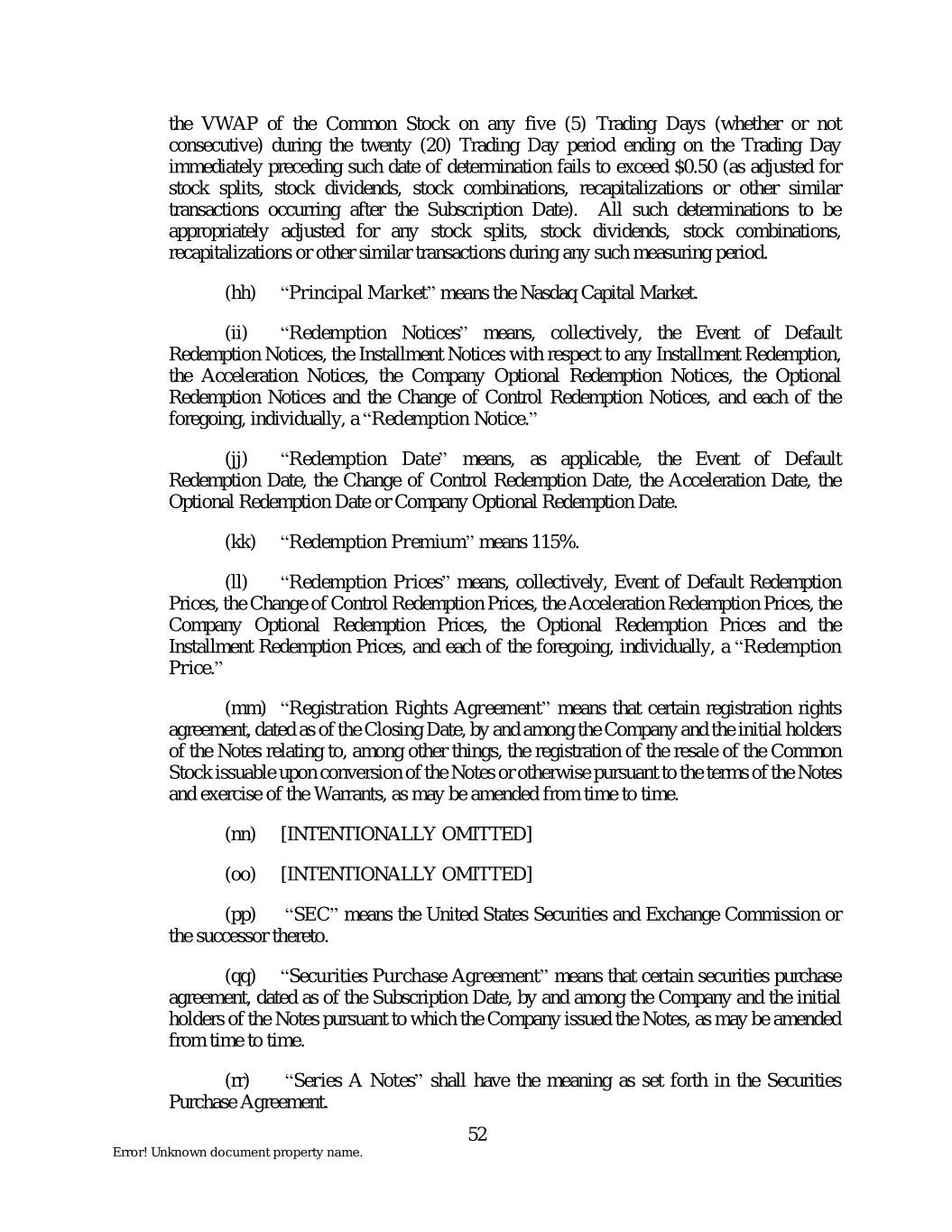 the VWAP of the Common Stock on any five (5) Trading Days (whether or not consecutive) during the twenty (20) Trading Day period ending on the Trading Day immediately preceding such date of determination fails to exceed $0.50 (as adjusted for stock splits, stock dividends, stock combinations, recapitalizations or other similar transactions occurring after the Subscription Date). All such determinations to be appropriately adjusted for any stock splits, stock dividends, stock combinations, recapitalizations or other similar transactions during any such measuring period. (hh) “Principal Market” means the Nasdaq Capital Market. (ii) “Redemption Notices” means, collectively, the Event of Default Redemption Notices, the Installment Notices with respect to any Installment Redemption, the Acceleration Notices, the Company Optional Redemption Notices, the Optional Redemption Notices and the Change of Control Redemption Notices, and each of the foregoing, individually, a “Redemption Notice.” (jj) “Redemption Date” means, as applicable, the Event of Default Redemption Date, the Change of Control Redemption Date, the Acceleration Date, the Optional Redemption Date or Company Optional Redemption Date. (kk) “Redemption Premium” means 115%. (ll) “Redemption Prices” means, collectively, Event of Default Redemption Prices, the Change of Control Redemption Prices, the Acceleration Redemption Prices, the Company Optional Redemption Prices, the Optional Redemption Prices and the Installment Redemption Prices, and each of the foregoing, individually, a “Redemption Price.” (mm) “Registration Rights Agreement” means that certain registration rights agreement, dated as of the Closing Date, by and among the Company and the initial holders of the Notes relating to, among other things, the registration of the resale of the Common Stock issuable upon conversion of the Notes or otherwise pursuant to the terms of the Notes and exercise of the Warrants, as may be amended from time to time. (nn) [INTENTIONALLY OMITTED] (oo) [INTENTIONALLY OMITTED] (pp) “SEC” means the United States Securities and Exchange Commission or the successor thereto. (qq) “Securities Purchase Agreement” means that certain securities purchase agreement, dated as of the Subscription Date, by and among the Company and the initial holders of the Notes pursuant to which the Company issued the Notes, as may be amended from time to time. (rr) “Series A Notes” shall have the meaning as set forth in the Securities Purchase Agreement. 52 Error! Unknown document property name.