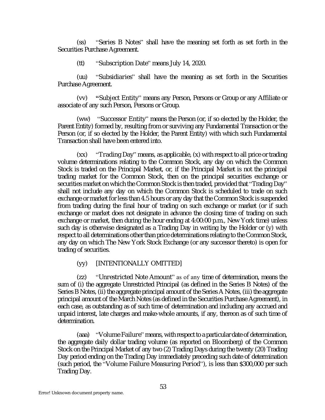 (ss) “Series B Notes” shall have the meaning set forth as set forth in the Securities Purchase Agreement. (tt) “Subscription Date” means July 14, 2020. (uu) “Subsidiaries” shall have the meaning as set forth in the Securities Purchase Agreement. (vv) “Subject Entity” means any Person, Persons or Group or any Affiliate or associate of any such Person, Persons or Group. (ww) “Successor Entity” means the Person (or, if so elected by the Holder, the Parent Entity) formed by, resulting from or surviving any Fundamental Transaction or the Person (or, if so elected by the Holder, the Parent Entity) with which such Fundamental Transaction shall have been entered into. (xx) “Trading Day” means, as applicable, (x) with respect to all price or trading volume determinations relating to the Common Stock, any day on which the Common Stock is traded on the Principal Market, or, if the Principal Market is not the principal trading market for the Common Stock, then on the principal securities exchange or securities market on which the Common Stock is then traded, provided that “Trading Day” shall not include any day on which the Common Stock is scheduled to trade on such exchange or market for less than 4.5 hours or any day that the Common Stock is suspended from trading during the final hour of trading on such exchange or market (or if such exchange or market does not designate in advance the closing time of trading on such exchange or market, then during the hour ending at 4:00:00 p.m., New York time) unless such day is otherwise designated as a Trading Day in writing by the Holder or (y) with respect to all determinations other than price determinations relating to the Common Stock, any day on which The New York Stock Exchange (or any successor thereto) is open for trading of securities. (yy) [INTENTIONALLY OMITTED] (zz) “Unrestricted Note Amount” as of any time of determination, means the sum of (i) the aggregate Unrestricted Principal (as defined in the Series B Notes) of the Series B Notes, (ii) the aggregate principal amount of the Series A Notes, (iii) the aggregate principal amount of the March Notes (as defined in the Securities Purchase Agreement), in each case, as outstanding as of such time of determination and including any accrued and unpaid interest, late charges and make-whole amounts, if any, thereon as of such time of determination. (aaa) “Volume Failure” means, with respect to a particular date of determination, the aggregate daily dollar trading volume (as reported on Bloomberg) of the Common Stock on the Principal Market of any two (2) Trading Days during the twenty (20) Trading Day period ending on the Trading Day immediately preceding such date of determination (such period, the “Volume Failure Measuring Period”), is less than $300,000 per such Trading Day. 53 Error! Unknown document property name.