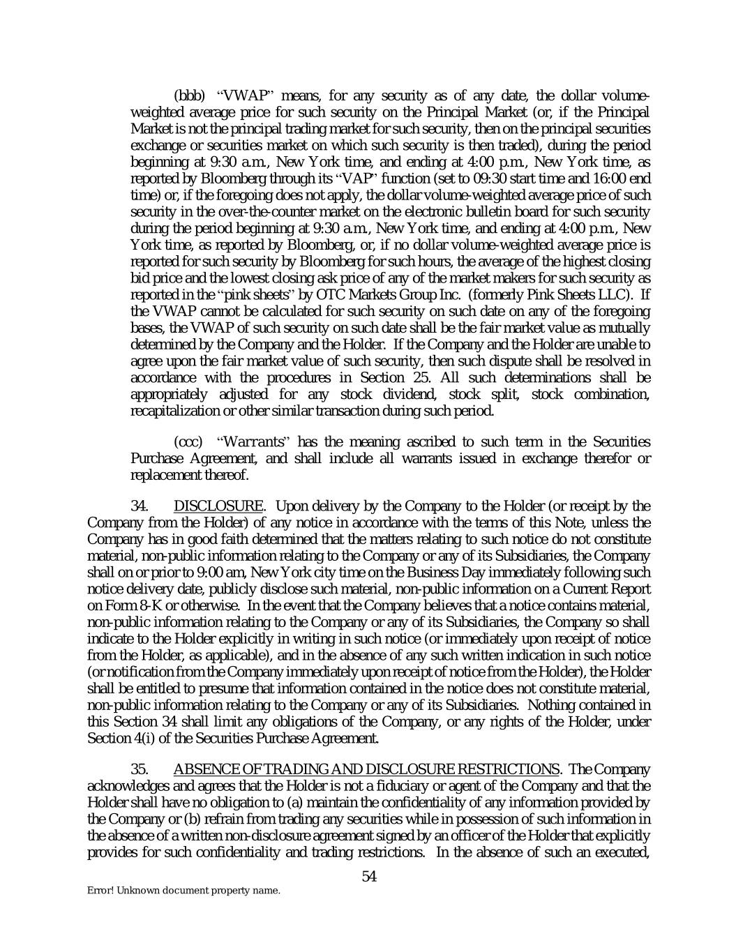 (bbb) “VWAP” means, for any security as of any date, the dollar volume- weighted average price for such security on the Principal Market (or, if the Principal Market is not the principal trading market for such security, then on the principal securities exchange or securities market on which such security is then traded), during the period beginning at 9:30 a.m., New York time, and ending at 4:00 p.m., New York time, as reported by Bloomberg through its “VAP” function (set to 09:30 start time and 16:00 end time) or, if the foregoing does not apply, the dollar volume-weighted average price of such security in the over-the-counter market on the electronic bulletin board for such security during the period beginning at 9:30 a.m., New York time, and ending at 4:00 p.m., New York time, as reported by Bloomberg, or, if no dollar volume-weighted average price is reported for such security by Bloomberg for such hours, the average of the highest closing bid price and the lowest closing ask price of any of the market makers for such security as reported in the “pink sheets” by OTC Markets Group Inc. (formerly Pink Sheets LLC). If the VWAP cannot be calculated for such security on such date on any of the foregoing bases, the VWAP of such security on such date shall be the fair market value as mutually determined by the Company and the Holder. If the Company and the Holder are unable to agree upon the fair market value of such security, then such dispute shall be resolved in accordance with the procedures in Section 25. All such determinations shall be appropriately adjusted for any stock dividend, stock split, stock combination, recapitalization or other similar transaction during such period. (ccc) “Warrants” has the meaning ascribed to such term in the Securities Purchase Agreement, and shall include all warrants issued in exchange therefor or replacement thereof. 34. DISCLOSURE. Upon delivery by the Company to the Holder (or receipt by the Company from the Holder) of any notice in accordance with the terms of this Note, unless the Company has in good faith determined that the matters relating to such notice do not constitute material, non-public information relating to the Company or any of its Subsidiaries, the Company shall on or prior to 9:00 am, New York city time on the Business Day immediately following such notice delivery date, publicly disclose such material, non-public information on a Current Report on Form 8-K or otherwise. In the event that the Company believes that a notice contains material, non-public information relating to the Company or any of its Subsidiaries, the Company so shall indicate to the Holder explicitly in writing in such notice (or immediately upon receipt of notice from the Holder, as applicable), and in the absence of any such written indication in such notice (or notification from the Company immediately upon receipt of notice from the Holder), the Holder shall be entitled to presume that information contained in the notice does not constitute material, non-public information relating to the Company or any of its Subsidiaries. Nothing contained in this Section 34 shall limit any obligations of the Company, or any rights of the Holder, under Section 4(i) of the Securities Purchase Agreement. 35. ABSENCE OF TRADING AND DISCLOSURE RESTRICTIONS. The Company acknowledges and agrees that the Holder is not a fiduciary or agent of the Company and that the Holder shall have no obligation to (a) maintain the confidentiality of any information provided by the Company or (b) refrain from trading any securities while in possession of such information in the absence of a written non-disclosure agreement signed by an officer of the Holder that explicitly provides for such confidentiality and trading restrictions. In the absence of such an executed, 54 Error! Unknown document property name.
