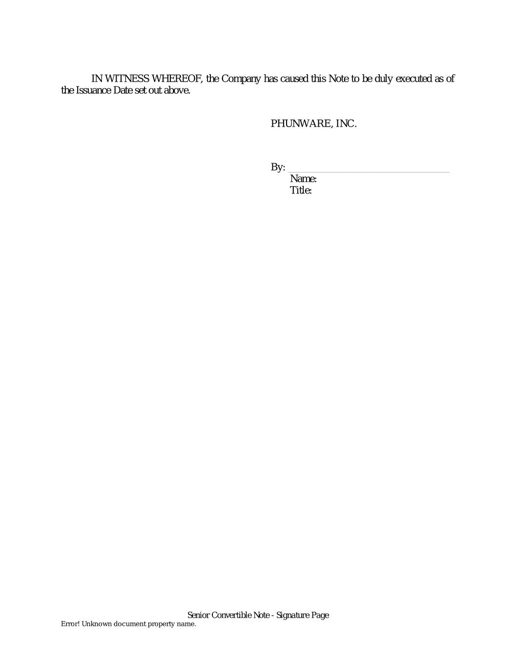 IN WITNESS WHEREOF, the Company has caused this Note to be duly executed as of the Issuance Date set out above. PHUNWARE, INC. By: ________________________________ Name: Title: Senior Convertible Note - Signature Page Error! Unknown document property name.