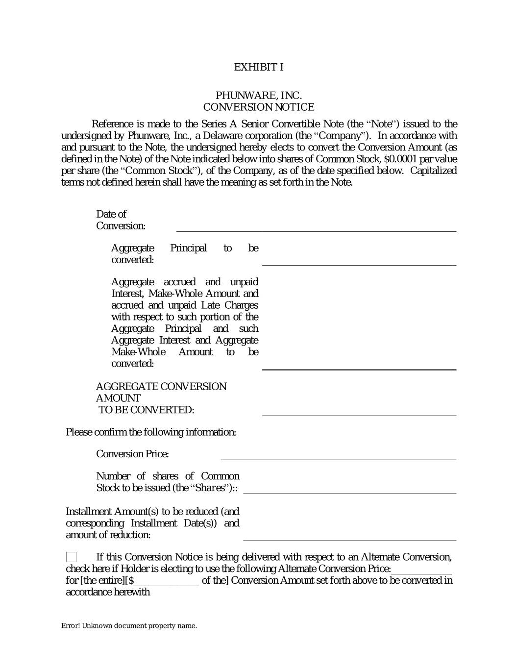 EXHIBIT I PHUNWARE, INC. CONVERSION NOTICE Reference is made to the Series A Senior Convertible Note (the “Note”) issued to the undersigned by Phunware, Inc., a Delaware corporation (the “Company”). In accordance with and pursuant to the Note, the undersigned hereby elects to convert the Conversion Amount (as defined in the Note) of the Note indicated below into shares of Common Stock, $0.0001 par value per share (the “Common Stock”), of the Company, as of the date specified below. Capitalized terms not defined herein shall have the meaning as set forth in the Note. Date of Conversion: Aggregate Principal to be converted: Aggregate accrued and unpaid Interest, Make-Whole Amount and accrued and unpaid Late Charges with respect to such portion of the Aggregate Principal and such Aggregate Interest and Aggregate Make-Whole Amount to be converted: AGGREGATE CONVERSION AMOUNT TO BE CONVERTED: Please confirm the following information: Conversion Price: Number of shares of Common Stock to be issued (the “Shares”):: Installment Amount(s) to be reduced (and corresponding Installment Date(s)) and amount of reduction: If this Conversion Notice is being delivered with respect to an Alternate Conversion, check here if Holder is electing to use the following Alternate Conversion Price:____________ for [the entire][$_____________ of the] Conversion Amount set forth above to be converted in accordance herewith Error! Unknown document property name.