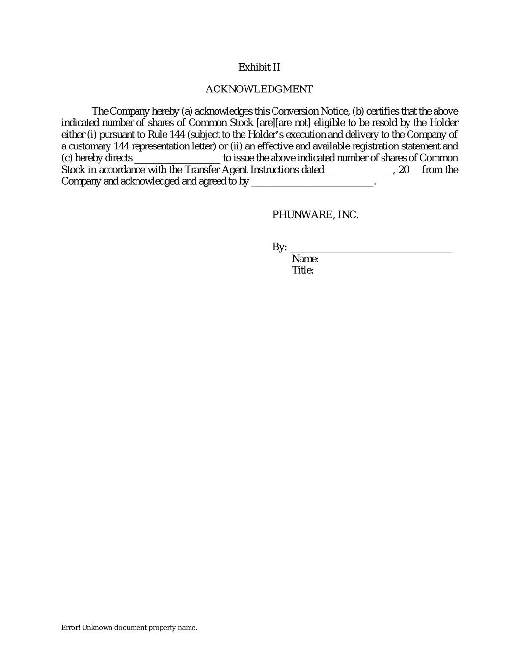 Exhibit II ACKNOWLEDGMENT The Company hereby (a) acknowledges this Conversion Notice, (b) certifies that the above indicated number of shares of Common Stock [are][are not] eligible to be resold by the Holder either (i) pursuant to Rule 144 (subject to the Holder’s execution and delivery to the Company of a customary 144 representation letter) or (ii) an effective and available registration statement and (c) hereby directs _________________ to issue the above indicated number of shares of Common Stock in accordance with the Transfer Agent Instructions dated _____________, 20__ from the Company and acknowledged and agreed to by ________________________. PHUNWARE, INC. By: ________________________________ Name: Title: Error! Unknown document property name.