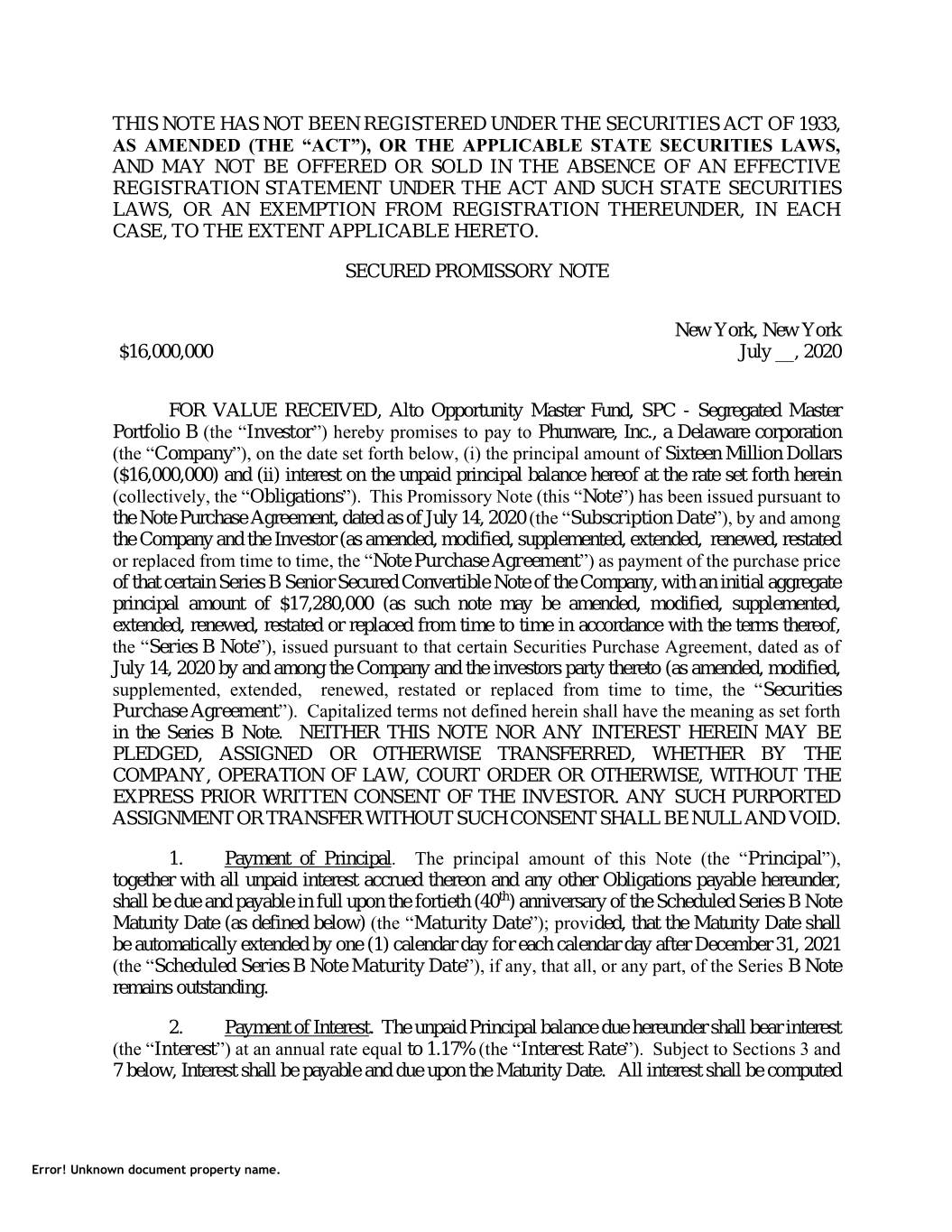 THIS NOTE HAS NOT BEEN REGISTERED UNDER THE SECURITIES ACT OF 1933, AS AMENDED (THE “ACT”), OR THE APPLICABLE STATE SECURITIES LAWS, AND MAY NOT BE OFFERED OR SOLD IN THE ABSENCE OF AN EFFECTIVE REGISTRATION STATEMENT UNDER THE ACT AND SUCH STATE SECURITIES LAWS, OR AN EXEMPTION FROM REGISTRATION THEREUNDER, IN EACH CASE, TO THE EXTENT APPLICABLE HERETO. SECURED PROMISSORY NOTE New York, New York $16,000,000 July __, 2020 FOR VALUE RECEIVED, Alto Opportunity Master Fund, SPC - Segregated Master Portfolio B (the “Investor”) hereby promises to pay to Phunware, Inc., a Delaware corporation (the “Company”), on the date set forth below, (i) the principal amount of Sixteen Million Dollars ($16,000,000) and (ii) interest on the unpaid principal balance hereof at the rate set forth herein (collectively, the “Obligations”). This Promissory Note (this “Note”) has been issued pursuant to the Note Purchase Agreement, dated as of July 14, 2020 (the “Subscription Date”), by and among the Company and the Investor (as amended, modified, supplemented, extended, renewed, restated or replaced from time to time, the “Note Purchase Agreement”) as payment of the purchase price of that certain Series B Senior Secured Convertible Note of the Company, with an initial aggregate principal amount of $17,280,000 (as such note may be amended, modified, supplemented, extended, renewed, restated or replaced from time to time in accordance with the terms thereof, the “Series B Note”), issued pursuant to that certain Securities Purchase Agreement, dated as of July 14, 2020 by and among the Company and the investors party thereto (as amended, modified, supplemented, extended, renewed, restated or replaced from time to time, the “Securities Purchase Agreement”). Capitalized terms not defined herein shall have the meaning as set forth in the Series B Note. NEITHER THIS NOTE NOR ANY INTEREST HEREIN MAY BE PLEDGED, ASSIGNED OR OTHERWISE TRANSFERRED, WHETHER BY THE COMPANY, OPERATION OF LAW, COURT ORDER OR OTHERWISE, WITHOUT THE EXPRESS PRIOR WRITTEN CONSENT OF THE INVESTOR. ANY SUCH PURPORTED ASSIGNMENT OR TRANSFER WITHOUT SUCH CONSENT SHALL BE NULL AND VOID. 1. Payment of Principal. The principal amount of this Note (the “Principal”), together with all unpaid interest accrued thereon and any other Obligations payable hereunder, shall be due and payable in full upon the fortieth (40th) anniversary of the Scheduled Series B Note Maturity Date (as defined below) (the “Maturity Date”); provided, that the Maturity Date shall be automatically extended by one (1) calendar day for each calendar day after December 31, 2021 (the “Scheduled Series B Note Maturity Date”), if any, that all, or any part, of the Series B Note remains outstanding. 2. Payment of Interest. The unpaid Principal balance due hereunder shall bear interest (the “Interest”) at an annual rate equal to 1.17% (the “Interest Rate”). Subject to Sections 3 and 7 below, Interest shall be payable and due upon the Maturity Date. All interest shall be computed Error! Unknown document property name.