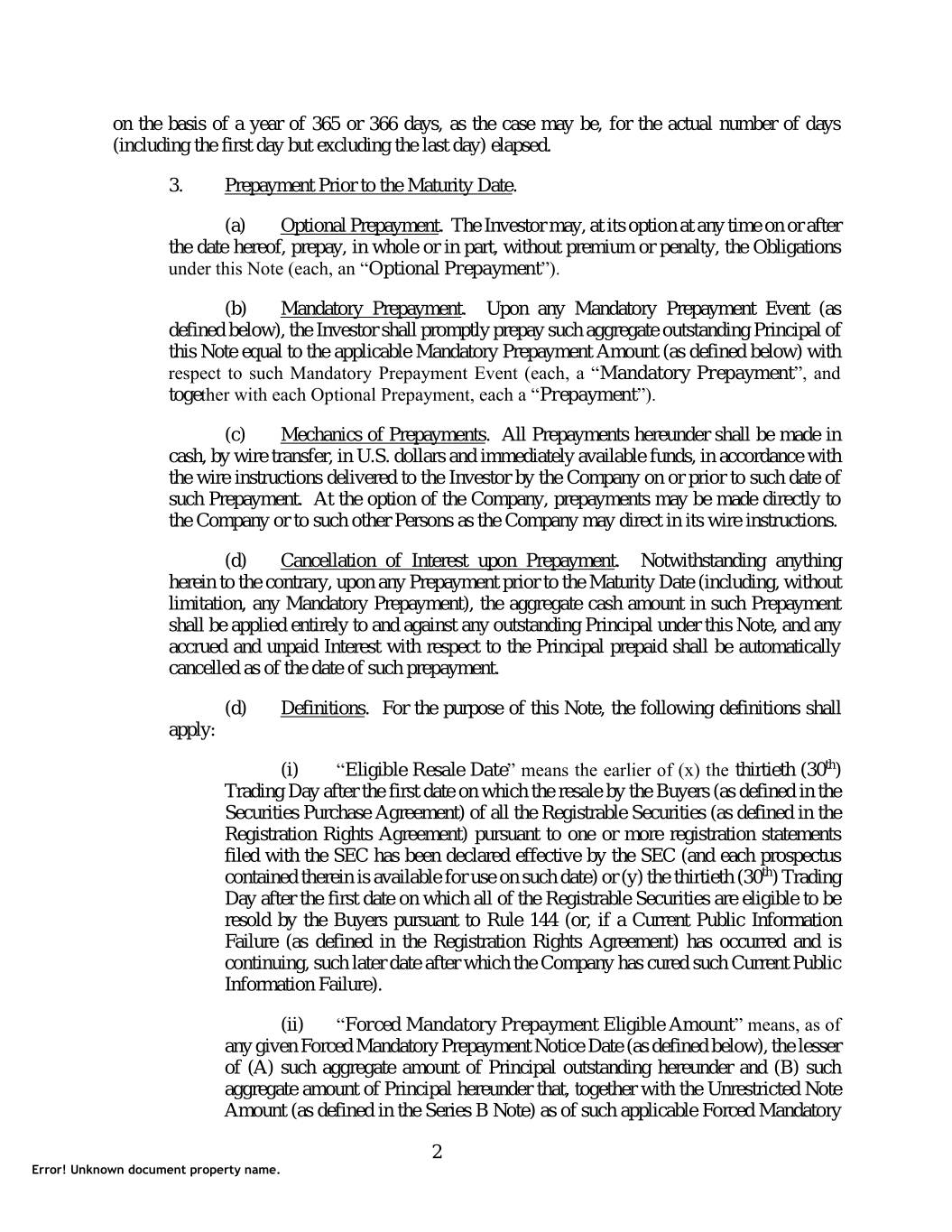 on the basis of a year of 365 or 366 days, as the case may be, for the actual number of days (including the first day but excluding the last day) elapsed. 3. Prepayment Prior to the Maturity Date. (a) Optional Prepayment. The Investor may, at its option at any time on or after the date hereof, prepay, in whole or in part, without premium or penalty, the Obligations under this Note (each, an “Optional Prepayment”). (b) Mandatory Prepayment. Upon any Mandatory Prepayment Event (as defined below), the Investor shall promptly prepay such aggregate outstanding Principal of this Note equal to the applicable Mandatory Prepayment Amount (as defined below) with respect to such Mandatory Prepayment Event (each, a “Mandatory Prepayment”, and together with each Optional Prepayment, each a “Prepayment”). (c) Mechanics of Prepayments. All Prepayments hereunder shall be made in cash, by wire transfer, in U.S. dollars and immediately available funds, in accordance with the wire instructions delivered to the Investor by the Company on or prior to such date of such Prepayment. At the option of the Company, prepayments may be made directly to the Company or to such other Persons as the Company may direct in its wire instructions. (d) Cancellation of Interest upon Prepayment. Notwithstanding anything herein to the contrary, upon any Prepayment prior to the Maturity Date (including, without limitation, any Mandatory Prepayment), the aggregate cash amount in such Prepayment shall be applied entirely to and against any outstanding Principal under this Note, and any accrued and unpaid Interest with respect to the Principal prepaid shall be automatically cancelled as of the date of such prepayment. (d) Definitions. For the purpose of this Note, the following definitions shall apply: (i) “Eligible Resale Date” means the earlier of (x) the thirtieth (30th) Trading Day after the first date on which the resale by the Buyers (as defined in the Securities Purchase Agreement) of all the Registrable Securities (as defined in the Registration Rights Agreement) pursuant to one or more registration statements filed with the SEC has been declared effective by the SEC (and each prospectus contained therein is available for use on such date) or (y) the thirtieth (30th) Trading Day after the first date on which all of the Registrable Securities are eligible to be resold by the Buyers pursuant to Rule 144 (or, if a Current Public Information Failure (as defined in the Registration Rights Agreement) has occurred and is continuing, such later date after which the Company has cured such Current Public Information Failure). (ii) “Forced Mandatory Prepayment Eligible Amount” means, as of any given Forced Mandatory Prepayment Notice Date (as defined below), the lesser of (A) such aggregate amount of Principal outstanding hereunder and (B) such aggregate amount of Principal hereunder that, together with the Unrestricted Note Amount (as defined in the Series B Note) as of such applicable Forced Mandatory 2 Error! Unknown document property name.