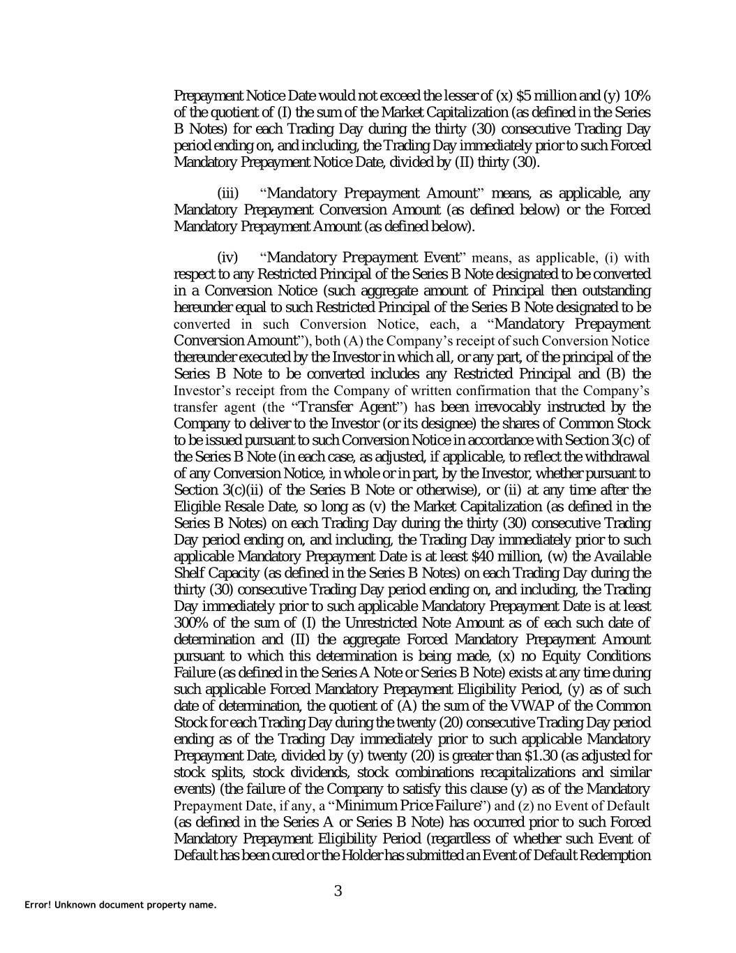 Prepayment Notice Date would not exceed the lesser of (x) $5 million and (y) 10% of the quotient of (I) the sum of the Market Capitalization (as defined in the Series B Notes) for each Trading Day during the thirty (30) consecutive Trading Day period ending on, and including, the Trading Day immediately prior to such Forced Mandatory Prepayment Notice Date, divided by (II) thirty (30). (iii) “Mandatory Prepayment Amount” means, as applicable, any Mandatory Prepayment Conversion Amount (as defined below) or the Forced Mandatory Prepayment Amount (as defined below). (iv) “Mandatory Prepayment Event” means, as applicable, (i) with respect to any Restricted Principal of the Series B Note designated to be converted in a Conversion Notice (such aggregate amount of Principal then outstanding hereunder equal to such Restricted Principal of the Series B Note designated to be converted in such Conversion Notice, each, a “Mandatory Prepayment Conversion Amount”), both (A) the Company’s receipt of such Conversion Notice thereunder executed by the Investor in which all, or any part, of the principal of the Series B Note to be converted includes any Restricted Principal and (B) the Investor’s receipt from the Company of written confirmation that the Company’s transfer agent (the “Transfer Agent”) has been irrevocably instructed by the Company to deliver to the Investor (or its designee) the shares of Common Stock to be issued pursuant to such Conversion Notice in accordance with Section 3(c) of the Series B Note (in each case, as adjusted, if applicable, to reflect the withdrawal of any Conversion Notice, in whole or in part, by the Investor, whether pursuant to Section 3(c)(ii) of the Series B Note or otherwise), or (ii) at any time after the Eligible Resale Date, so long as (v) the Market Capitalization (as defined in the Series B Notes) on each Trading Day during the thirty (30) consecutive Trading Day period ending on, and including, the Trading Day immediately prior to such applicable Mandatory Prepayment Date is at least $40 million, (w) the Available Shelf Capacity (as defined in the Series B Notes) on each Trading Day during the thirty (30) consecutive Trading Day period ending on, and including, the Trading Day immediately prior to such applicable Mandatory Prepayment Date is at least 300% of the sum of (I) the Unrestricted Note Amount as of each such date of determination and (II) the aggregate Forced Mandatory Prepayment Amount pursuant to which this determination is being made, (x) no Equity Conditions Failure (as defined in the Series A Note or Series B Note) exists at any time during such applicable Forced Mandatory Prepayment Eligibility Period, (y) as of such date of determination, the quotient of (A) the sum of the VWAP of the Common Stock for each Trading Day during the twenty (20) consecutive Trading Day period ending as of the Trading Day immediately prior to such applicable Mandatory Prepayment Date, divided by (y) twenty (20) is greater than $1.30 (as adjusted for stock splits, stock dividends, stock combinations recapitalizations and similar events) (the failure of the Company to satisfy this clause (y) as of the Mandatory Prepayment Date, if any, a “Minimum Price Failure”) and (z) no Event of Default (as defined in the Series A or Series B Note) has occurred prior to such Forced Mandatory Prepayment Eligibility Period (regardless of whether such Event of Default has been cured or the Holder has submitted an Event of Default Redemption 3 Error! Unknown document property name.