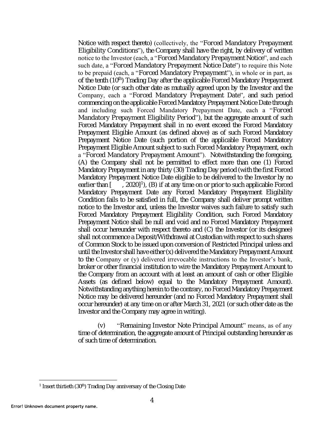 Notice with respect thereto) (collectively, the “Forced Mandatory Prepayment Eligibility Conditions”), the Company shall have the right, by delivery of written notice to the Investor (each, a “Forced Mandatory Prepayment Notice”, and each such date, a “Forced Mandatory Prepayment Notice Date”) to require this Note to be prepaid (each, a “Forced Mandatory Prepayment”), in whole or in part, as of the tenth (10th) Trading Day after the applicable Forced Mandatory Prepayment Notice Date (or such other date as mutually agreed upon by the Investor and the Company, each a “Forced Mandatory Prepayment Date”, and such period commencing on the applicable Forced Mandatory Prepayment Notice Date through and including such Forced Mandatory Prepayment Date, each a “Forced Mandatory Prepayment Eligibility Period”), but the aggregate amount of such Forced Mandatory Prepayment shall in no event exceed the Forced Mandatory Prepayment Eligible Amount (as defined above) as of such Forced Mandatory Prepayment Notice Date (such portion of the applicable Forced Mandatory Prepayment Eligible Amount subject to such Forced Mandatory Prepayment, each a “Forced Mandatory Prepayment Amount”). Notwithstanding the foregoing, (A) the Company shall not be permitted to effect more than one (1) Forced Mandatory Prepayment in any thirty (30) Trading Day period (with the first Forced Mandatory Prepayment Notice Date eligible to be delivered to the Investor by no earlier than [ , 2020]1), (B) if at any time on or prior to such applicable Forced Mandatory Prepayment Date any Forced Mandatory Prepayment Eligibility Condition fails to be satisfied in full, the Company shall deliver prompt written notice to the Investor and, unless the Investor waives such failure to satisfy such Forced Mandatory Prepayment Eligibility Condition, such Forced Mandatory Prepayment Notice shall be null and void and no Forced Mandatory Prepayment shall occur hereunder with respect thereto and (C) the Investor (or its designee) shall not commence a Deposit/Withdrawal at Custodian with respect to such shares of Common Stock to be issued upon conversion of Restricted Principal unless and until the Investor shall have either (x) delivered the Mandatory Prepayment Amount to the Company or (y) delivered irrevocable instructions to the Investor’s bank, broker or other financial institution to wire the Mandatory Prepayment Amount to the Company from an account with at least an amount of cash or other Eligible Assets (as defined below) equal to the Mandatory Prepayment Amount). Notwithstanding anything herein to the contrary, no Forced Mandatory Prepayment Notice may be delivered hereunder (and no Forced Mandatory Prepayment shall occur hereunder) at any time on or after March 31, 2021 (or such other date as the Investor and the Company may agree in writing). (v) “Remaining Investor Note Principal Amount” means, as of any time of determination, the aggregate amount of Principal outstanding hereunder as of such time of determination. 1 Insert thirtieth (30th) Trading Day anniversary of the Closing Date 4 Error! Unknown document property name.