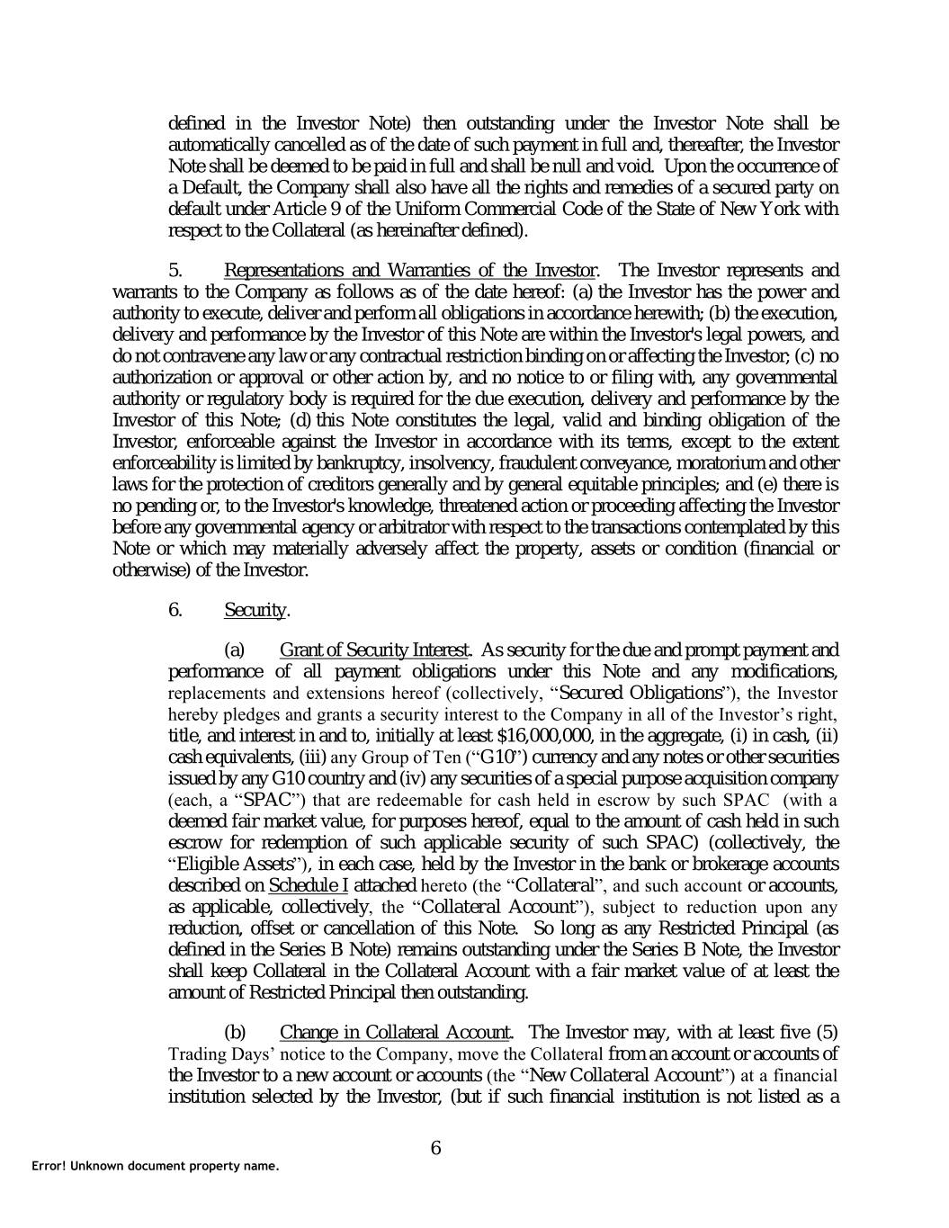 defined in the Investor Note) then outstanding under the Investor Note shall be automatically cancelled as of the date of such payment in full and, thereafter, the Investor Note shall be deemed to be paid in full and shall be null and void. Upon the occurrence of a Default, the Company shall also have all the rights and remedies of a secured party on default under Article 9 of the Uniform Commercial Code of the State of New York with respect to the Collateral (as hereinafter defined). 5. Representations and Warranties of the Investor. The Investor represents and warrants to the Company as follows as of the date hereof: (a) the Investor has the power and authority to execute, deliver and perform all obligations in accordance herewith; (b) the execution, delivery and performance by the Investor of this Note are within the Investor's legal powers, and do not contravene any law or any contractual restriction binding on or affecting the Investor; (c) no authorization or approval or other action by, and no notice to or filing with, any governmental authority or regulatory body is required for the due execution, delivery and performance by the Investor of this Note; (d) this Note constitutes the legal, valid and binding obligation of the Investor, enforceable against the Investor in accordance with its terms, except to the extent enforceability is limited by bankruptcy, insolvency, fraudulent conveyance, moratorium and other laws for the protection of creditors generally and by general equitable principles; and (e) there is no pending or, to the Investor's knowledge, threatened action or proceeding affecting the Investor before any governmental agency or arbitrator with respect to the transactions contemplated by this Note or which may materially adversely affect the property, assets or condition (financial or otherwise) of the Investor. 6. Security. (a) Grant of Security Interest. As security for the due and prompt payment and performance of all payment obligations under this Note and any modifications, replacements and extensions hereof (collectively, “Secured Obligations”), the Investor hereby pledges and grants a security interest to the Company in all of the Investor’s right, title, and interest in and to, initially at least $16,000,000, in the aggregate, (i) in cash, (ii) cash equivalents, (iii) any Group of Ten (“G10”) currency and any notes or other securities issued by any G10 country and (iv) any securities of a special purpose acquisition company (each, a “SPAC”) that are redeemable for cash held in escrow by such SPAC (with a deemed fair market value, for purposes hereof, equal to the amount of cash held in such escrow for redemption of such applicable security of such SPAC) (collectively, the “Eligible Assets”), in each case, held by the Investor in the bank or brokerage accounts described on Schedule I attached hereto (the “Collateral”, and such account or accounts, as applicable, collectively, the “Collateral Account”), subject to reduction upon any reduction, offset or cancellation of this Note. So long as any Restricted Principal (as defined in the Series B Note) remains outstanding under the Series B Note, the Investor shall keep Collateral in the Collateral Account with a fair market value of at least the amount of Restricted Principal then outstanding. (b) Change in Collateral Account. The Investor may, with at least five (5) Trading Days’ notice to the Company, move the Collateral from an account or accounts of the Investor to a new account or accounts (the “New Collateral Account”) at a financial institution selected by the Investor, (but if such financial institution is not listed as a 6 Error! Unknown document property name.
