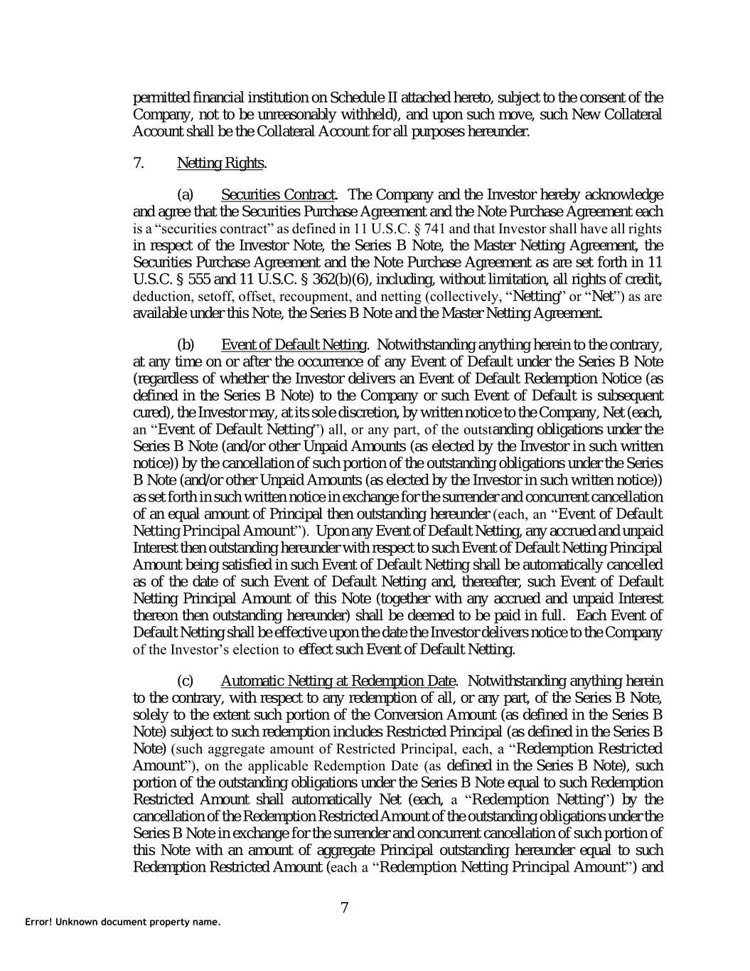 permitted financial institution on Schedule II attached hereto, subject to the consent of the Company, not to be unreasonably withheld), and upon such move, such New Collateral Account shall be the Collateral Account for all purposes hereunder. 7. Netting Rights. (a) Securities Contract. The Company and the Investor hereby acknowledge and agree that the Securities Purchase Agreement and the Note Purchase Agreement each is a “securities contract” as defined in 11 U.S.C. § 741 and that Investor shall have all rights in respect of the Investor Note, the Series B Note, the Master Netting Agreement, the Securities Purchase Agreement and the Note Purchase Agreement as are set forth in 11 U.S.C. § 555 and 11 U.S.C. § 362(b)(6), including, without limitation, all rights of credit, deduction, setoff, offset, recoupment, and netting (collectively, “Netting” or “Net”) as are available under this Note, the Series B Note and the Master Netting Agreement. (b) Event of Default Netting. Notwithstanding anything herein to the contrary, at any time on or after the occurrence of any Event of Default under the Series B Note (regardless of whether the Investor delivers an Event of Default Redemption Notice (as defined in the Series B Note) to the Company or such Event of Default is subsequent cured), the Investor may, at its sole discretion, by written notice to the Company, Net (each, an “Event of Default Netting”) all, or any part, of the outstanding obligations under the Series B Note (and/or other Unpaid Amounts (as elected by the Investor in such written notice)) by the cancellation of such portion of the outstanding obligations under the Series B Note (and/or other Unpaid Amounts (as elected by the Investor in such written notice)) as set forth in such written notice in exchange for the surrender and concurrent cancellation of an equal amount of Principal then outstanding hereunder (each, an “Event of Default Netting Principal Amount”). Upon any Event of Default Netting, any accrued and unpaid Interest then outstanding hereunder with respect to such Event of Default Netting Principal Amount being satisfied in such Event of Default Netting shall be automatically cancelled as of the date of such Event of Default Netting and, thereafter, such Event of Default Netting Principal Amount of this Note (together with any accrued and unpaid Interest thereon then outstanding hereunder) shall be deemed to be paid in full. Each Event of Default Netting shall be effective upon the date the Investor delivers notice to the Company of the Investor’s election to effect such Event of Default Netting. (c) Automatic Netting at Redemption Date. Notwithstanding anything herein to the contrary, with respect to any redemption of all, or any part, of the Series B Note, solely to the extent such portion of the Conversion Amount (as defined in the Series B Note) subject to such redemption includes Restricted Principal (as defined in the Series B Note) (such aggregate amount of Restricted Principal, each, a “Redemption Restricted Amount”), on the applicable Redemption Date (as defined in the Series B Note), such portion of the outstanding obligations under the Series B Note equal to such Redemption Restricted Amount shall automatically Net (each, a “Redemption Netting”) by the cancellation of the Redemption Restricted Amount of the outstanding obligations under the Series B Note in exchange for the surrender and concurrent cancellation of such portion of this Note with an amount of aggregate Principal outstanding hereunder equal to such Redemption Restricted Amount (each a “Redemption Netting Principal Amount”) and 7 Error! Unknown document property name.