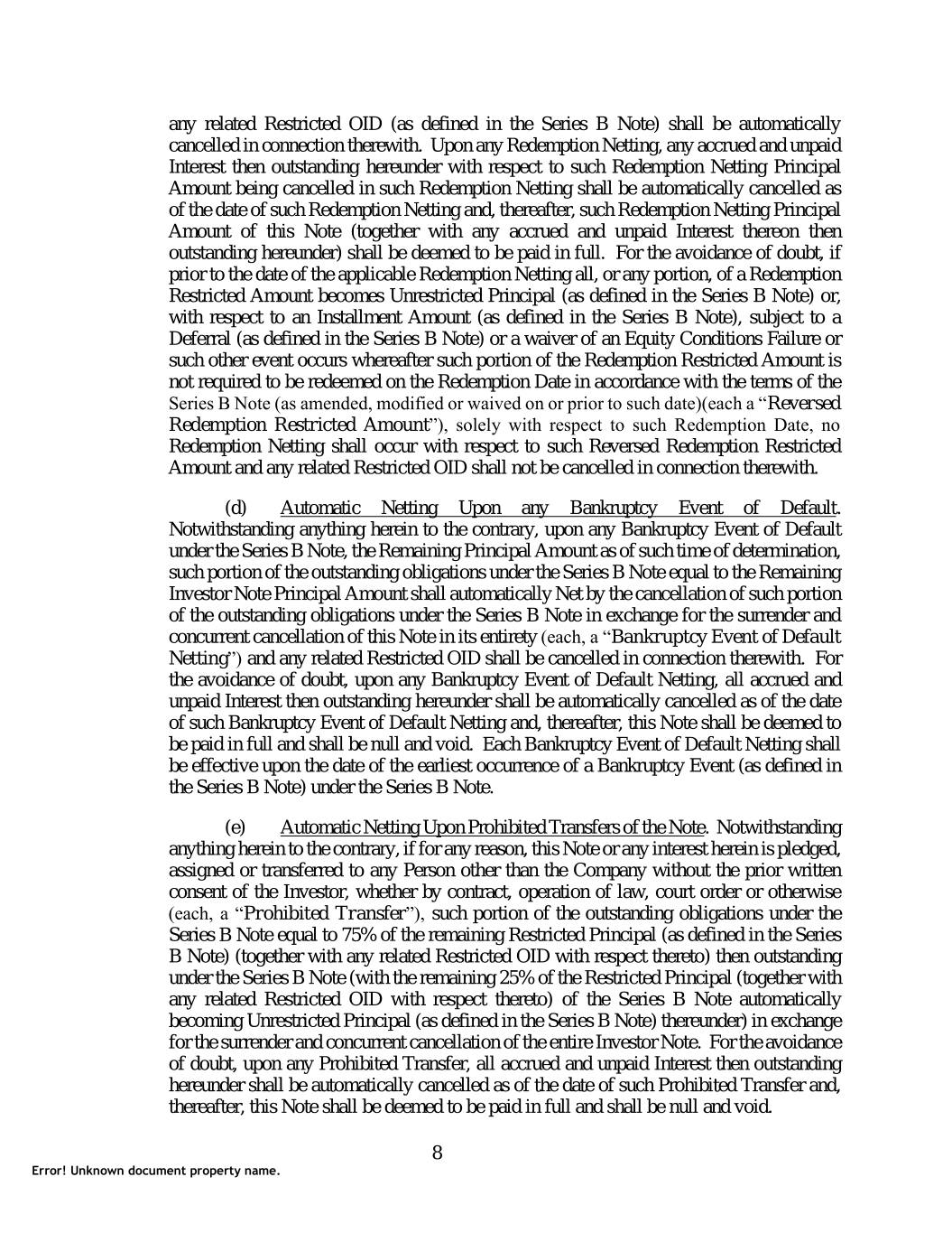 any related Restricted OID (as defined in the Series B Note) shall be automatically cancelled in connection therewith. Upon any Redemption Netting, any accrued and unpaid Interest then outstanding hereunder with respect to such Redemption Netting Principal Amount being cancelled in such Redemption Netting shall be automatically cancelled as of the date of such Redemption Netting and, thereafter, such Redemption Netting Principal Amount of this Note (together with any accrued and unpaid Interest thereon then outstanding hereunder) shall be deemed to be paid in full. For the avoidance of doubt, if prior to the date of the applicable Redemption Netting all, or any portion, of a Redemption Restricted Amount becomes Unrestricted Principal (as defined in the Series B Note) or, with respect to an Installment Amount (as defined in the Series B Note), subject to a Deferral (as defined in the Series B Note) or a waiver of an Equity Conditions Failure or such other event occurs whereafter such portion of the Redemption Restricted Amount is not required to be redeemed on the Redemption Date in accordance with the terms of the Series B Note (as amended, modified or waived on or prior to such date)(each a “Reversed Redemption Restricted Amount”), solely with respect to such Redemption Date, no Redemption Netting shall occur with respect to such Reversed Redemption Restricted Amount and any related Restricted OID shall not be cancelled in connection therewith. (d) Automatic Netting Upon any Bankruptcy Event of Default. Notwithstanding anything herein to the contrary, upon any Bankruptcy Event of Default under the Series B Note, the Remaining Principal Amount as of such time of determination, such portion of the outstanding obligations under the Series B Note equal to the Remaining Investor Note Principal Amount shall automatically Net by the cancellation of such portion of the outstanding obligations under the Series B Note in exchange for the surrender and concurrent cancellation of this Note in its entirety (each, a “Bankruptcy Event of Default Netting”) and any related Restricted OID shall be cancelled in connection therewith. For the avoidance of doubt, upon any Bankruptcy Event of Default Netting, all accrued and unpaid Interest then outstanding hereunder shall be automatically cancelled as of the date of such Bankruptcy Event of Default Netting and, thereafter, this Note shall be deemed to be paid in full and shall be null and void. Each Bankruptcy Event of Default Netting shall be effective upon the date of the earliest occurrence of a Bankruptcy Event (as defined in the Series B Note) under the Series B Note. (e) Automatic Netting Upon Prohibited Transfers of the Note. Notwithstanding anything herein to the contrary, if for any reason, this Note or any interest herein is pledged, assigned or transferred to any Person other than the Company without the prior written consent of the Investor, whether by contract, operation of law, court order or otherwise (each, a “Prohibited Transfer”), such portion of the outstanding obligations under the Series B Note equal to 75% of the remaining Restricted Principal (as defined in the Series B Note) (together with any related Restricted OID with respect thereto) then outstanding under the Series B Note (with the remaining 25% of the Restricted Principal (together with any related Restricted OID with respect thereto) of the Series B Note automatically becoming Unrestricted Principal (as defined in the Series B Note) thereunder) in exchange for the surrender and concurrent cancellation of the entire Investor Note. For the avoidance of doubt, upon any Prohibited Transfer, all accrued and unpaid Interest then outstanding hereunder shall be automatically cancelled as of the date of such Prohibited Transfer and, thereafter, this Note shall be deemed to be paid in full and shall be null and void. 8 Error! Unknown document property name.