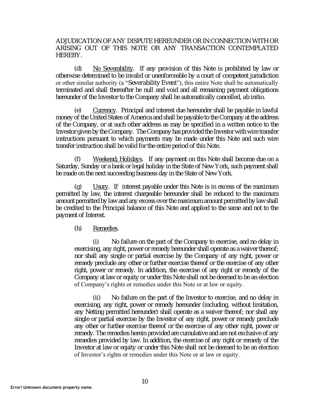 ADJUDICATION OF ANY DISPUTE HEREUNDER OR IN CONNECTION WITH OR ARISING OUT OF THIS NOTE OR ANY TRANSACTION CONTEMPLATED HEREBY. (d) No Severability. If any provision of this Note is prohibited by law or otherwise determined to be invalid or unenforceable by a court of competent jurisdiction or other similar authority (a “Severability Event”), this entire Note shall be automatically terminated and shall thereafter be null and void and all remaining payment obligations hereunder of the Investor to the Company shall be automatically cancelled, ab initio. (e) Currency. Principal and interest due hereunder shall be payable in lawful money of the United States of America and shall be payable to the Company at the address of the Company, or at such other address as may be specified in a written notice to the Investor given by the Company. The Company has provided the Investor with wire transfer instructions pursuant to which payments may be made under this Note and such wire transfer instruction shall be valid for the entire period of this Note. (f) Weekend; Holidays. If any payment on this Note shall become due on a Saturday, Sunday or a bank or legal holiday in the State of New York, such payment shall be made on the next succeeding business day in the State of New York. (g) Usury. If interest payable under this Note is in excess of the maximum permitted by law, the interest chargeable hereunder shall be reduced to the maximum amount permitted by law and any excess over the maximum amount permitted by law shall be credited to the Principal balance of this Note and applied to the same and not to the payment of Interest. (h) Remedies. (i) No failure on the part of the Company to exercise, and no delay in exercising, any right, power or remedy hereunder shall operate as a waiver thereof; nor shall any single or partial exercise by the Company of any right, power or remedy preclude any other or further exercise thereof or the exercise of any other right, power or remedy. In addition, the exercise of any right or remedy of the Company at law or equity or under this Note shall not be deemed to be an election of Company’s rights or remedies under this Note or at law or equity. (ii) No failure on the part of the Investor to exercise, and no delay in exercising, any right, power or remedy hereunder (including, without limitation, any Netting permitted hereunder) shall operate as a waiver thereof; nor shall any single or partial exercise by the Investor of any right, power or remedy preclude any other or further exercise thereof or the exercise of any other right, power or remedy. The remedies herein provided are cumulative and are not exclusive of any remedies provided by law. In addition, the exercise of any right or remedy of the Investor at law or equity or under this Note shall not be deemed to be an election of Investor’s rights or remedies under this Note or at law or equity. 10 Error! Unknown document property name.