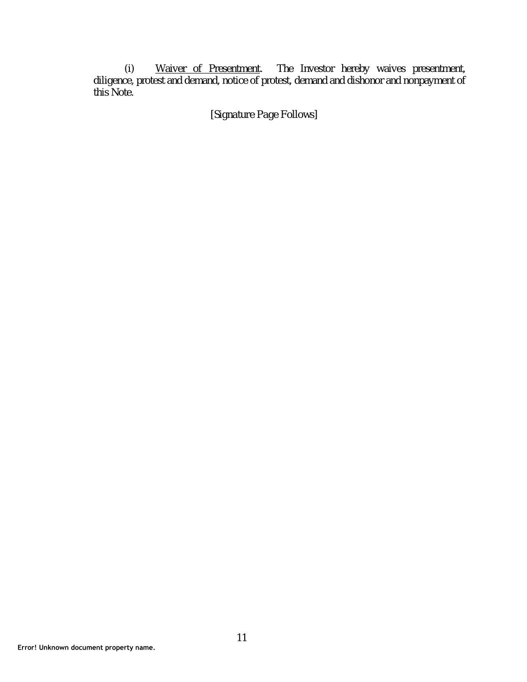 (i) Waiver of Presentment. The Investor hereby waives presentment, diligence, protest and demand, notice of protest, demand and dishonor and nonpayment of this Note. [Signature Page Follows] 11 Error! Unknown document property name.