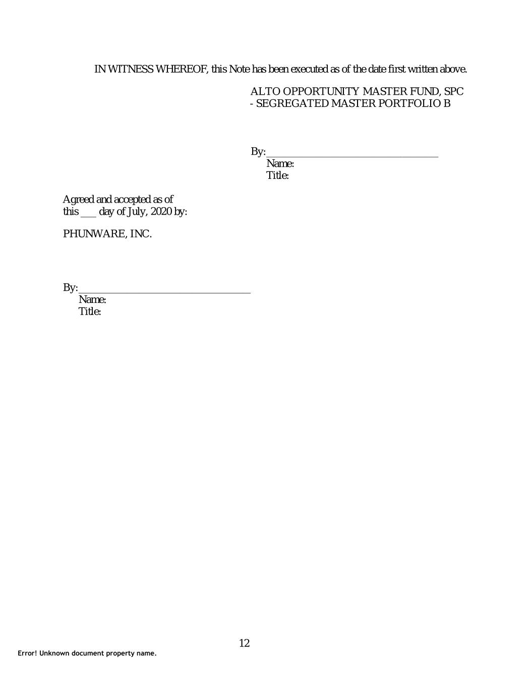 IN WITNESS WHEREOF, this Note has been executed as of the date first written above. ALTO OPPORTUNITY MASTER FUND, SPC - SEGREGATED MASTER PORTFOLIO B By: _________________________________ Name: Title: Agreed and accepted as of this ___ day of July, 2020 by: PHUNWARE, INC. By: _________________________________ Name: Title: 12 Error! Unknown document property name.
