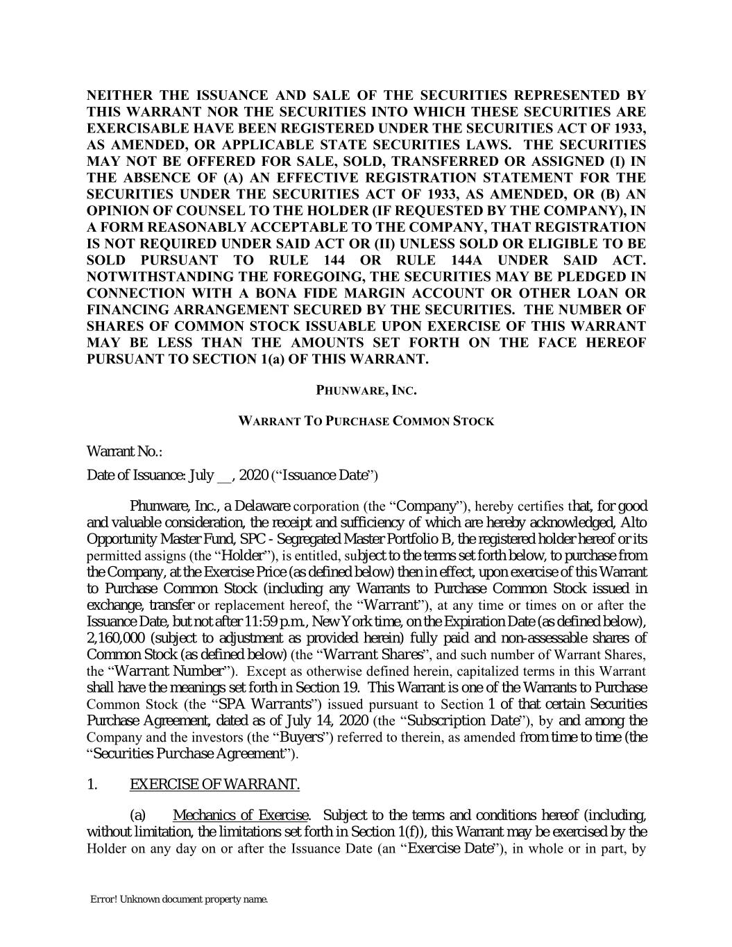 NEITHER THE ISSUANCE AND SALE OF THE SECURITIES REPRESENTED BY THIS WARRANT NOR THE SECURITIES INTO WHICH THESE SECURITIES ARE EXERCISABLE HAVE BEEN REGISTERED UNDER THE SECURITIES ACT OF 1933, AS AMENDED, OR APPLICABLE STATE SECURITIES LAWS. THE SECURITIES MAY NOT BE OFFERED FOR SALE, SOLD, TRANSFERRED OR ASSIGNED (I) IN THE ABSENCE OF (A) AN EFFECTIVE REGISTRATION STATEMENT FOR THE SECURITIES UNDER THE SECURITIES ACT OF 1933, AS AMENDED, OR (B) AN OPINION OF COUNSEL TO THE HOLDER (IF REQUESTED BY THE COMPANY), IN A FORM REASONABLY ACCEPTABLE TO THE COMPANY, THAT REGISTRATION IS NOT REQUIRED UNDER SAID ACT OR (II) UNLESS SOLD OR ELIGIBLE TO BE SOLD PURSUANT TO RULE 144 OR RULE 144A UNDER SAID ACT. NOTWITHSTANDING THE FOREGOING, THE SECURITIES MAY BE PLEDGED IN CONNECTION WITH A BONA FIDE MARGIN ACCOUNT OR OTHER LOAN OR FINANCING ARRANGEMENT SECURED BY THE SECURITIES. THE NUMBER OF SHARES OF COMMON STOCK ISSUABLE UPON EXERCISE OF THIS WARRANT MAY BE LESS THAN THE AMOUNTS SET FORTH ON THE FACE HEREOF PURSUANT TO SECTION 1(a) OF THIS WARRANT. PHUNWARE, INC. WARRANT TO PURCHASE COMMON STOCK Warrant No.: Date of Issuance: July __, 2020 (“Issuance Date”) Phunware, Inc., a Delaware corporation (the “Company”), hereby certifies that, for good and valuable consideration, the receipt and sufficiency of which are hereby acknowledged, Alto Opportunity Master Fund, SPC - Segregated Master Portfolio B, the registered holder hereof or its permitted assigns (the “Holder”), is entitled, subject to the terms set forth below, to purchase from the Company, at the Exercise Price (as defined below) then in effect, upon exercise of this Warrant to Purchase Common Stock (including any Warrants to Purchase Common Stock issued in exchange, transfer or replacement hereof, the “Warrant”), at any time or times on or after the Issuance Date, but not after 11:59 p.m., New York time, on the Expiration Date (as defined below), 2,160,000 (subject to adjustment as provided herein) fully paid and non-assessable shares of Common Stock (as defined below) (the “Warrant Shares”, and such number of Warrant Shares, the “Warrant Number”). Except as otherwise defined herein, capitalized terms in this Warrant shall have the meanings set forth in Section 19. This Warrant is one of the Warrants to Purchase Common Stock (the “SPA Warrants”) issued pursuant to Section 1 of that certain Securities Purchase Agreement, dated as of July 14, 2020 (the “Subscription Date”), by and among the Company and the investors (the “Buyers”) referred to therein, as amended from time to time (the “Securities Purchase Agreement”). 1. EXERCISE OF WARRANT. (a) Mechanics of Exercise. Subject to the terms and conditions hereof (including, without limitation, the limitations set forth in Section 1(f)), this Warrant may be exercised by the Holder on any day on or after the Issuance Date (an “Exercise Date”), in whole or in part, by Error! Unknown document property name.