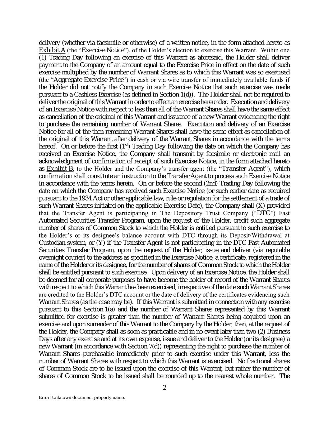 delivery (whether via facsimile or otherwise) of a written notice, in the form attached hereto as Exhibit A (the “Exercise Notice”), of the Holder’s election to exercise this Warrant. Within one (1) Trading Day following an exercise of this Warrant as aforesaid, the Holder shall deliver payment to the Company of an amount equal to the Exercise Price in effect on the date of such exercise multiplied by the number of Warrant Shares as to which this Warrant was so exercised (the “Aggregate Exercise Price”) in cash or via wire transfer of immediately available funds if the Holder did not notify the Company in such Exercise Notice that such exercise was made pursuant to a Cashless Exercise (as defined in Section 1(d)). The Holder shall not be required to deliver the original of this Warrant in order to effect an exercise hereunder. Execution and delivery of an Exercise Notice with respect to less than all of the Warrant Shares shall have the same effect as cancellation of the original of this Warrant and issuance of a new Warrant evidencing the right to purchase the remaining number of Warrant Shares. Execution and delivery of an Exercise Notice for all of the then-remaining Warrant Shares shall have the same effect as cancellation of the original of this Warrant after delivery of the Warrant Shares in accordance with the terms hereof. On or before the first (1st) Trading Day following the date on which the Company has received an Exercise Notice, the Company shall transmit by facsimile or electronic mail an acknowledgment of confirmation of receipt of such Exercise Notice, in the form attached hereto as Exhibit B, to the Holder and the Company’s transfer agent (the “Transfer Agent”), which confirmation shall constitute an instruction to the Transfer Agent to process such Exercise Notice in accordance with the terms herein. On or before the second (2nd) Trading Day following the date on which the Company has received such Exercise Notice (or such earlier date as required pursuant to the 1934 Act or other applicable law, rule or regulation for the settlement of a trade of such Warrant Shares initiated on the applicable Exercise Date), the Company shall (X) provided that the Transfer Agent is participating in The Depository Trust Company (“DTC”) Fast Automated Securities Transfer Program, upon the request of the Holder, credit such aggregate number of shares of Common Stock to which the Holder is entitled pursuant to such exercise to the Holder’s or its designee’s balance account with DTC through its Deposit/Withdrawal at Custodian system, or (Y) if the Transfer Agent is not participating in the DTC Fast Automated Securities Transfer Program, upon the request of the Holder, issue and deliver (via reputable overnight courier) to the address as specified in the Exercise Notice, a certificate, registered in the name of the Holder or its designee, for the number of shares of Common Stock to which the Holder shall be entitled pursuant to such exercise. Upon delivery of an Exercise Notice, the Holder shall be deemed for all corporate purposes to have become the holder of record of the Warrant Shares with respect to which this Warrant has been exercised, irrespective of the date such Warrant Shares are credited to the Holder’s DTC account or the date of delivery of the certificates evidencing such Warrant Shares (as the case may be). If this Warrant is submitted in connection with any exercise pursuant to this Section 1(a) and the number of Warrant Shares represented by this Warrant submitted for exercise is greater than the number of Warrant Shares being acquired upon an exercise and upon surrender of this Warrant to the Company by the Holder, then, at the request of the Holder, the Company shall as soon as practicable and in no event later than two (2) Business Days after any exercise and at its own expense, issue and deliver to the Holder (or its designee) a new Warrant (in accordance with Section 7(d)) representing the right to purchase the number of Warrant Shares purchasable immediately prior to such exercise under this Warrant, less the number of Warrant Shares with respect to which this Warrant is exercised. No fractional shares of Common Stock are to be issued upon the exercise of this Warrant, but rather the number of shares of Common Stock to be issued shall be rounded up to the nearest whole number. The 2 Error! Unknown document property name.