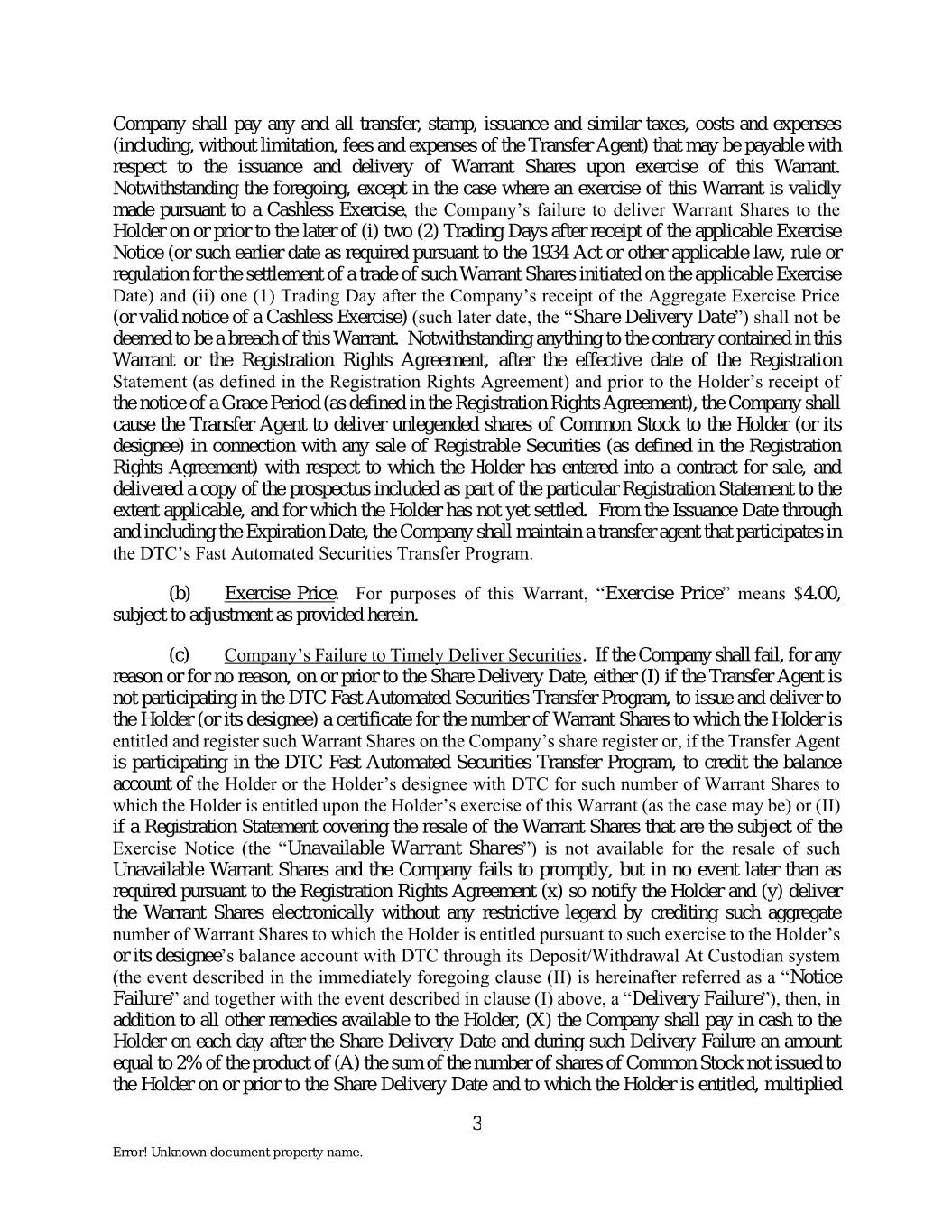 Company shall pay any and all transfer, stamp, issuance and similar taxes, costs and expenses (including, without limitation, fees and expenses of the Transfer Agent) that may be payable with respect to the issuance and delivery of Warrant Shares upon exercise of this Warrant. Notwithstanding the foregoing, except in the case where an exercise of this Warrant is validly made pursuant to a Cashless Exercise, the Company’s failure to deliver Warrant Shares to the Holder on or prior to the later of (i) two (2) Trading Days after receipt of the applicable Exercise Notice (or such earlier date as required pursuant to the 1934 Act or other applicable law, rule or regulation for the settlement of a trade of such Warrant Shares initiated on the applicable Exercise Date) and (ii) one (1) Trading Day after the Company’s receipt of the Aggregate Exercise Price (or valid notice of a Cashless Exercise) (such later date, the “Share Delivery Date”) shall not be deemed to be a breach of this Warrant. Notwithstanding anything to the contrary contained in this Warrant or the Registration Rights Agreement, after the effective date of the Registration Statement (as defined in the Registration Rights Agreement) and prior to the Holder’s receipt of the notice of a Grace Period (as defined in the Registration Rights Agreement), the Company shall cause the Transfer Agent to deliver unlegended shares of Common Stock to the Holder (or its designee) in connection with any sale of Registrable Securities (as defined in the Registration Rights Agreement) with respect to which the Holder has entered into a contract for sale, and delivered a copy of the prospectus included as part of the particular Registration Statement to the extent applicable, and for which the Holder has not yet settled. From the Issuance Date through and including the Expiration Date, the Company shall maintain a transfer agent that participates in the DTC’s Fast Automated Securities Transfer Program. (b) Exercise Price. For purposes of this Warrant, “Exercise Price” means $4.00, subject to adjustment as provided herein. (c) Company’s Failure to Timely Deliver Securities. If the Company shall fail, for any reason or for no reason, on or prior to the Share Delivery Date, either (I) if the Transfer Agent is not participating in the DTC Fast Automated Securities Transfer Program, to issue and deliver to the Holder (or its designee) a certificate for the number of Warrant Shares to which the Holder is entitled and register such Warrant Shares on the Company’s share register or, if the Transfer Agent is participating in the DTC Fast Automated Securities Transfer Program, to credit the balance account of the Holder or the Holder’s designee with DTC for such number of Warrant Shares to which the Holder is entitled upon the Holder’s exercise of this Warrant (as the case may be) or (II) if a Registration Statement covering the resale of the Warrant Shares that are the subject of the Exercise Notice (the “Unavailable Warrant Shares”) is not available for the resale of such Unavailable Warrant Shares and the Company fails to promptly, but in no event later than as required pursuant to the Registration Rights Agreement (x) so notify the Holder and (y) deliver the Warrant Shares electronically without any restrictive legend by crediting such aggregate number of Warrant Shares to which the Holder is entitled pursuant to such exercise to the Holder’s or its designee’s balance account with DTC through its Deposit/Withdrawal At Custodian system (the event described in the immediately foregoing clause (II) is hereinafter referred as a “Notice Failure” and together with the event described in clause (I) above, a “Delivery Failure”), then, in addition to all other remedies available to the Holder, (X) the Company shall pay in cash to the Holder on each day after the Share Delivery Date and during such Delivery Failure an amount equal to 2% of the product of (A) the sum of the number of shares of Common Stock not issued to the Holder on or prior to the Share Delivery Date and to which the Holder is entitled, multiplied 3 Error! Unknown document property name.