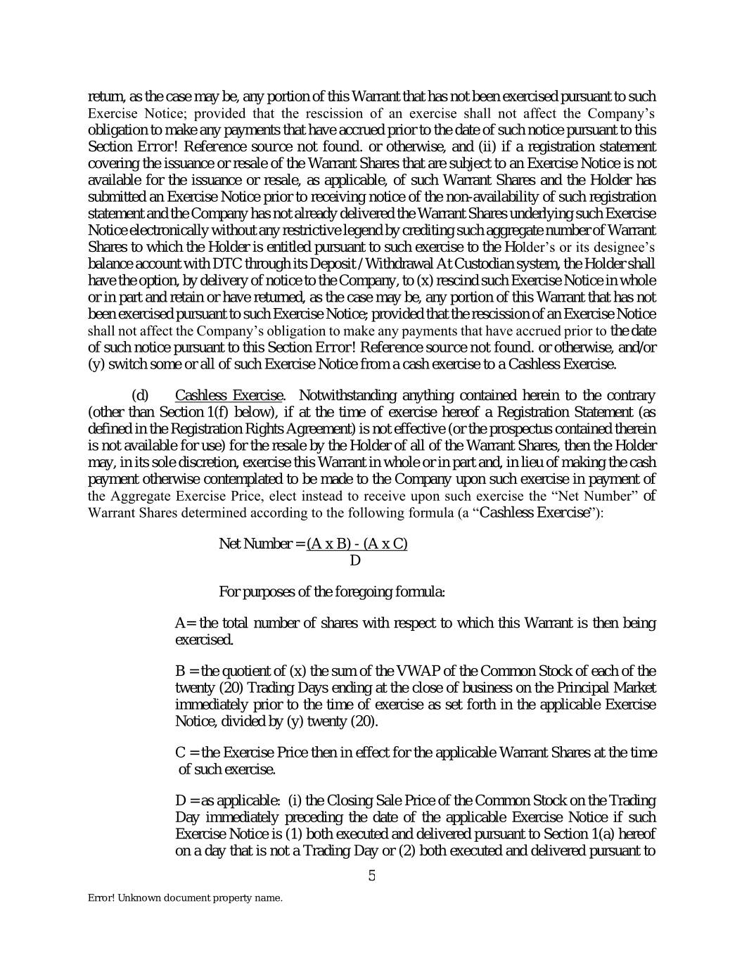return, as the case may be, any portion of this Warrant that has not been exercised pursuant to such Exercise Notice; provided that the rescission of an exercise shall not affect the Company’s obligation to make any payments that have accrued prior to the date of such notice pursuant to this Section Error! Reference source not found. or otherwise, and (ii) if a registration statement covering the issuance or resale of the Warrant Shares that are subject to an Exercise Notice is not available for the issuance or resale, as applicable, of such Warrant Shares and the Holder has submitted an Exercise Notice prior to receiving notice of the non-availability of such registration statement and the Company has not already delivered the Warrant Shares underlying such Exercise Notice electronically without any restrictive legend by crediting such aggregate number of Warrant Shares to which the Holder is entitled pursuant to such exercise to the Holder’s or its designee’s balance account with DTC through its Deposit / Withdrawal At Custodian system, the Holder shall have the option, by delivery of notice to the Company, to (x) rescind such Exercise Notice in whole or in part and retain or have returned, as the case may be, any portion of this Warrant that has not been exercised pursuant to such Exercise Notice; provided that the rescission of an Exercise Notice shall not affect the Company’s obligation to make any payments that have accrued prior to the date of such notice pursuant to this Section Error! Reference source not found. or otherwise, and/or (y) switch some or all of such Exercise Notice from a cash exercise to a Cashless Exercise. (d) Cashless Exercise. Notwithstanding anything contained herein to the contrary (other than Section 1(f) below), if at the time of exercise hereof a Registration Statement (as defined in the Registration Rights Agreement) is not effective (or the prospectus contained therein is not available for use) for the resale by the Holder of all of the Warrant Shares, then the Holder may, in its sole discretion, exercise this Warrant in whole or in part and, in lieu of making the cash payment otherwise contemplated to be made to the Company upon such exercise in payment of the Aggregate Exercise Price, elect instead to receive upon such exercise the “Net Number” of Warrant Shares determined according to the following formula (a “Cashless Exercise”): Net Number = (A x B) - (A x C) D For purposes of the foregoing formula: A= the total number of shares with respect to which this Warrant is then being exercised. B = the quotient of (x) the sum of the VWAP of the Common Stock of each of the twenty (20) Trading Days ending at the close of business on the Principal Market immediately prior to the time of exercise as set forth in the applicable Exercise Notice, divided by (y) twenty (20). C = the Exercise Price then in effect for the applicable Warrant Shares at the time of such exercise. D = as applicable: (i) the Closing Sale Price of the Common Stock on the Trading Day immediately preceding the date of the applicable Exercise Notice if such Exercise Notice is (1) both executed and delivered pursuant to Section 1(a) hereof on a day that is not a Trading Day or (2) both executed and delivered pursuant to 5 Error! Unknown document property name.