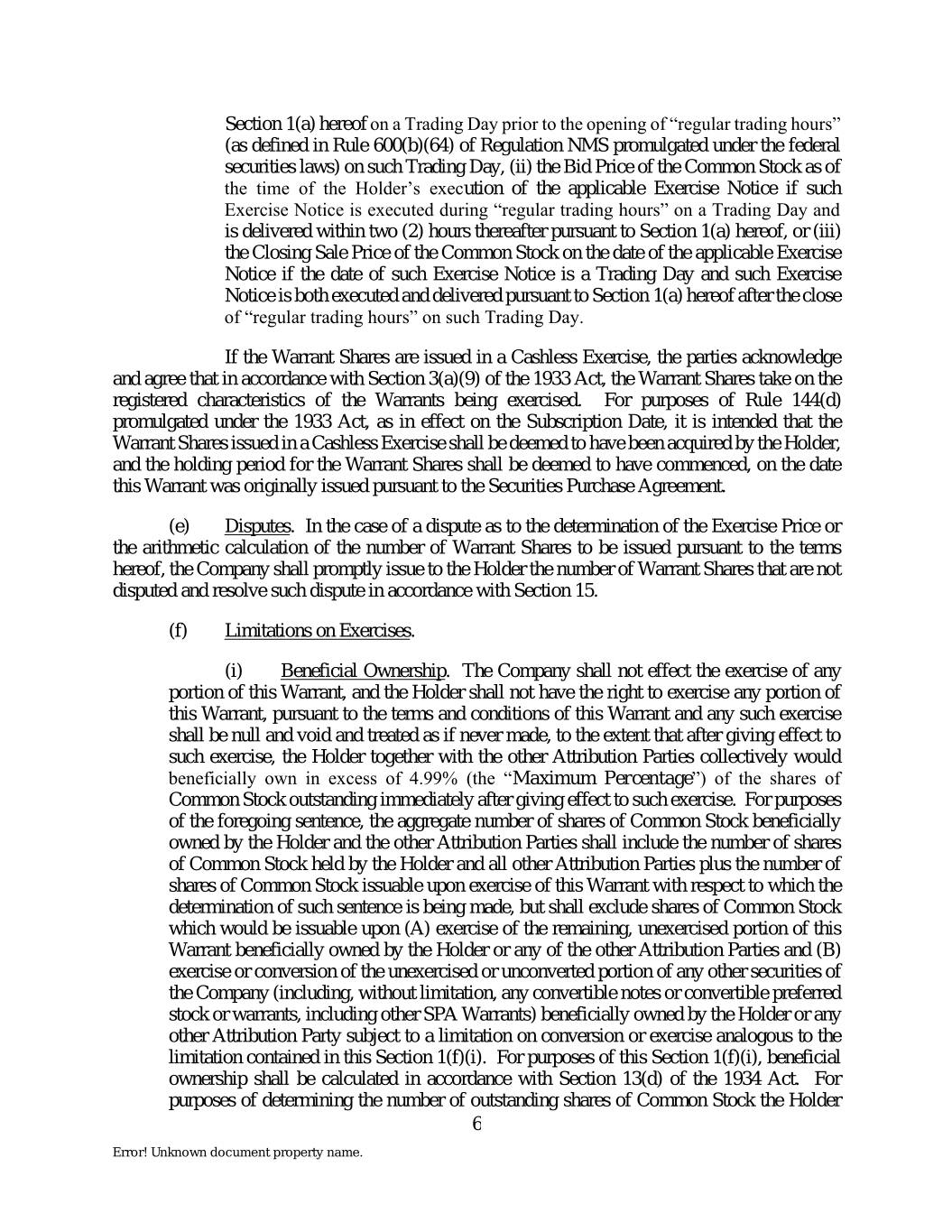 Section 1(a) hereof on a Trading Day prior to the opening of “regular trading hours” (as defined in Rule 600(b)(64) of Regulation NMS promulgated under the federal securities laws) on such Trading Day, (ii) the Bid Price of the Common Stock as of the time of the Holder’s execution of the applicable Exercise Notice if such Exercise Notice is executed during “regular trading hours” on a Trading Day and is delivered within two (2) hours thereafter pursuant to Section 1(a) hereof, or (iii) the Closing Sale Price of the Common Stock on the date of the applicable Exercise Notice if the date of such Exercise Notice is a Trading Day and such Exercise Notice is both executed and delivered pursuant to Section 1(a) hereof after the close of “regular trading hours” on such Trading Day. If the Warrant Shares are issued in a Cashless Exercise, the parties acknowledge and agree that in accordance with Section 3(a)(9) of the 1933 Act, the Warrant Shares take on the registered characteristics of the Warrants being exercised. For purposes of Rule 144(d) promulgated under the 1933 Act, as in effect on the Subscription Date, it is intended that the Warrant Shares issued in a Cashless Exercise shall be deemed to have been acquired by the Holder, and the holding period for the Warrant Shares shall be deemed to have commenced, on the date this Warrant was originally issued pursuant to the Securities Purchase Agreement. (e) Disputes. In the case of a dispute as to the determination of the Exercise Price or the arithmetic calculation of the number of Warrant Shares to be issued pursuant to the terms hereof, the Company shall promptly issue to the Holder the number of Warrant Shares that are not disputed and resolve such dispute in accordance with Section 15. (f) Limitations on Exercises. (i) Beneficial Ownership. The Company shall not effect the exercise of any portion of this Warrant, and the Holder shall not have the right to exercise any portion of this Warrant, pursuant to the terms and conditions of this Warrant and any such exercise shall be null and void and treated as if never made, to the extent that after giving effect to such exercise, the Holder together with the other Attribution Parties collectively would beneficially own in excess of 4.99% (the “Maximum Percentage”) of the shares of Common Stock outstanding immediately after giving effect to such exercise. For purposes of the foregoing sentence, the aggregate number of shares of Common Stock beneficially owned by the Holder and the other Attribution Parties shall include the number of shares of Common Stock held by the Holder and all other Attribution Parties plus the number of shares of Common Stock issuable upon exercise of this Warrant with respect to which the determination of such sentence is being made, but shall exclude shares of Common Stock which would be issuable upon (A) exercise of the remaining, unexercised portion of this Warrant beneficially owned by the Holder or any of the other Attribution Parties and (B) exercise or conversion of the unexercised or unconverted portion of any other securities of the Company (including, without limitation, any convertible notes or convertible preferred stock or warrants, including other SPA Warrants) beneficially owned by the Holder or any other Attribution Party subject to a limitation on conversion or exercise analogous to the limitation contained in this Section 1(f)(i). For purposes of this Section 1(f)(i), beneficial ownership shall be calculated in accordance with Section 13(d) of the 1934 Act. For purposes of determining the number of outstanding shares of Common Stock the Holder 6 Error! Unknown document property name.