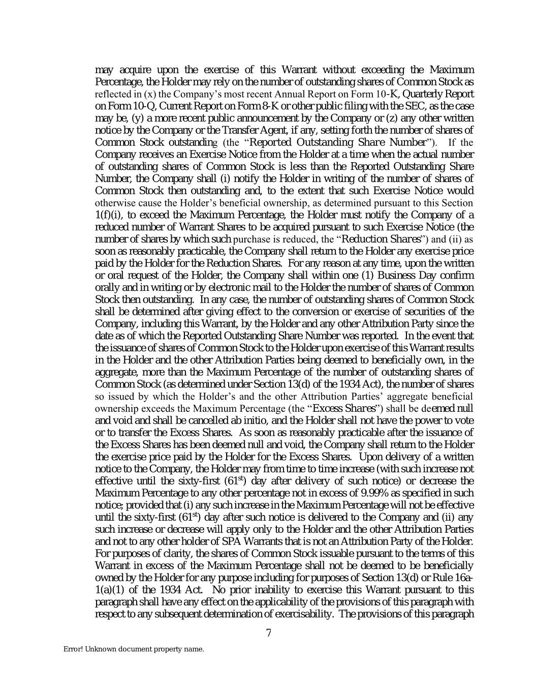 may acquire upon the exercise of this Warrant without exceeding the Maximum Percentage, the Holder may rely on the number of outstanding shares of Common Stock as reflected in (x) the Company’s most recent Annual Report on Form 10-K, Quarterly Report on Form 10-Q, Current Report on Form 8-K or other public filing with the SEC, as the case may be, (y) a more recent public announcement by the Company or (z) any other written notice by the Company or the Transfer Agent, if any, setting forth the number of shares of Common Stock outstanding (the “Reported Outstanding Share Number”). If the Company receives an Exercise Notice from the Holder at a time when the actual number of outstanding shares of Common Stock is less than the Reported Outstanding Share Number, the Company shall (i) notify the Holder in writing of the number of shares of Common Stock then outstanding and, to the extent that such Exercise Notice would otherwise cause the Holder’s beneficial ownership, as determined pursuant to this Section 1(f)(i), to exceed the Maximum Percentage, the Holder must notify the Company of a reduced number of Warrant Shares to be acquired pursuant to such Exercise Notice (the number of shares by which such purchase is reduced, the “Reduction Shares”) and (ii) as soon as reasonably practicable, the Company shall return to the Holder any exercise price paid by the Holder for the Reduction Shares. For any reason at any time, upon the written or oral request of the Holder, the Company shall within one (1) Business Day confirm orally and in writing or by electronic mail to the Holder the number of shares of Common Stock then outstanding. In any case, the number of outstanding shares of Common Stock shall be determined after giving effect to the conversion or exercise of securities of the Company, including this Warrant, by the Holder and any other Attribution Party since the date as of which the Reported Outstanding Share Number was reported. In the event that the issuance of shares of Common Stock to the Holder upon exercise of this Warrant results in the Holder and the other Attribution Parties being deemed to beneficially own, in the aggregate, more than the Maximum Percentage of the number of outstanding shares of Common Stock (as determined under Section 13(d) of the 1934 Act), the number of shares so issued by which the Holder’s and the other Attribution Parties’ aggregate beneficial ownership exceeds the Maximum Percentage (the “Excess Shares”) shall be deemed null and void and shall be cancelled ab initio, and the Holder shall not have the power to vote or to transfer the Excess Shares. As soon as reasonably practicable after the issuance of the Excess Shares has been deemed null and void, the Company shall return to the Holder the exercise price paid by the Holder for the Excess Shares. Upon delivery of a written notice to the Company, the Holder may from time to time increase (with such increase not effective until the sixty-first (61st) day after delivery of such notice) or decrease the Maximum Percentage to any other percentage not in excess of 9.99% as specified in such notice; provided that (i) any such increase in the Maximum Percentage will not be effective until the sixty-first (61st) day after such notice is delivered to the Company and (ii) any such increase or decrease will apply only to the Holder and the other Attribution Parties and not to any other holder of SPA Warrants that is not an Attribution Party of the Holder. For purposes of clarity, the shares of Common Stock issuable pursuant to the terms of this Warrant in excess of the Maximum Percentage shall not be deemed to be beneficially owned by the Holder for any purpose including for purposes of Section 13(d) or Rule 16a- 1(a)(1) of the 1934 Act. No prior inability to exercise this Warrant pursuant to this paragraph shall have any effect on the applicability of the provisions of this paragraph with respect to any subsequent determination of exercisability. The provisions of this paragraph 7 Error! Unknown document property name.