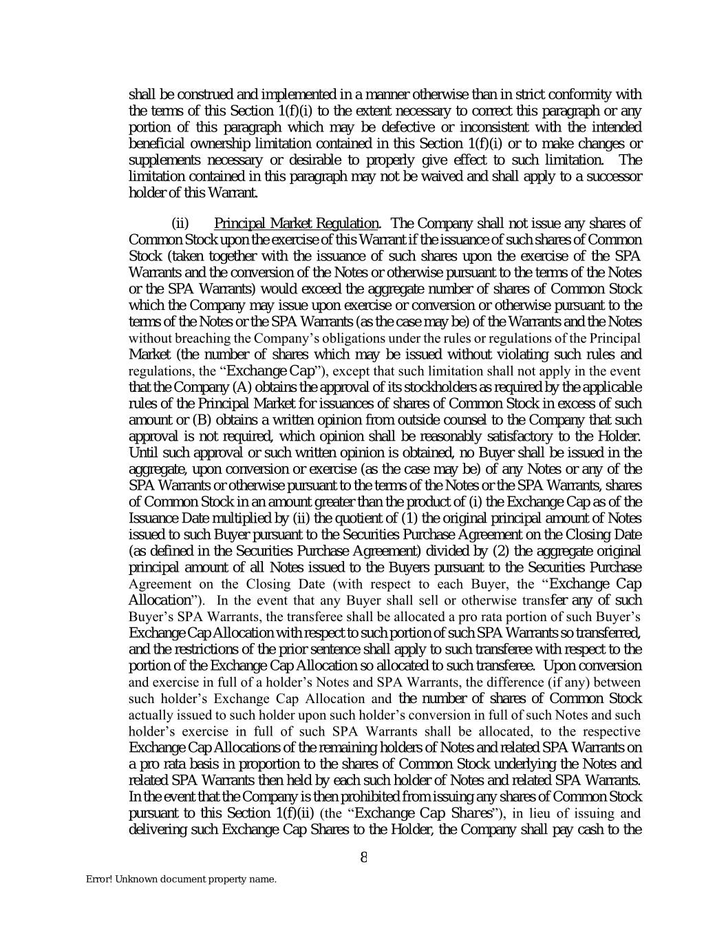 shall be construed and implemented in a manner otherwise than in strict conformity with the terms of this Section 1(f)(i) to the extent necessary to correct this paragraph or any portion of this paragraph which may be defective or inconsistent with the intended beneficial ownership limitation contained in this Section 1(f)(i) or to make changes or supplements necessary or desirable to properly give effect to such limitation. The limitation contained in this paragraph may not be waived and shall apply to a successor holder of this Warrant. (ii) Principal Market Regulation. The Company shall not issue any shares of Common Stock upon the exercise of this Warrant if the issuance of such shares of Common Stock (taken together with the issuance of such shares upon the exercise of the SPA Warrants and the conversion of the Notes or otherwise pursuant to the terms of the Notes or the SPA Warrants) would exceed the aggregate number of shares of Common Stock which the Company may issue upon exercise or conversion or otherwise pursuant to the terms of the Notes or the SPA Warrants (as the case may be) of the Warrants and the Notes without breaching the Company’s obligations under the rules or regulations of the Principal Market (the number of shares which may be issued without violating such rules and regulations, the “Exchange Cap”), except that such limitation shall not apply in the event that the Company (A) obtains the approval of its stockholders as required by the applicable rules of the Principal Market for issuances of shares of Common Stock in excess of such amount or (B) obtains a written opinion from outside counsel to the Company that such approval is not required, which opinion shall be reasonably satisfactory to the Holder. Until such approval or such written opinion is obtained, no Buyer shall be issued in the aggregate, upon conversion or exercise (as the case may be) of any Notes or any of the SPA Warrants or otherwise pursuant to the terms of the Notes or the SPA Warrants, shares of Common Stock in an amount greater than the product of (i) the Exchange Cap as of the Issuance Date multiplied by (ii) the quotient of (1) the original principal amount of Notes issued to such Buyer pursuant to the Securities Purchase Agreement on the Closing Date (as defined in the Securities Purchase Agreement) divided by (2) the aggregate original principal amount of all Notes issued to the Buyers pursuant to the Securities Purchase Agreement on the Closing Date (with respect to each Buyer, the “Exchange Cap Allocation”). In the event that any Buyer shall sell or otherwise transfer any of such Buyer’s SPA Warrants, the transferee shall be allocated a pro rata portion of such Buyer’s Exchange Cap Allocation with respect to such portion of such SPA Warrants so transferred, and the restrictions of the prior sentence shall apply to such transferee with respect to the portion of the Exchange Cap Allocation so allocated to such transferee. Upon conversion and exercise in full of a holder’s Notes and SPA Warrants, the difference (if any) between such holder’s Exchange Cap Allocation and the number of shares of Common Stock actually issued to such holder upon such holder’s conversion in full of such Notes and such holder’s exercise in full of such SPA Warrants shall be allocated, to the respective Exchange Cap Allocations of the remaining holders of Notes and related SPA Warrants on a pro rata basis in proportion to the shares of Common Stock underlying the Notes and related SPA Warrants then held by each such holder of Notes and related SPA Warrants. In the event that the Company is then prohibited from issuing any shares of Common Stock pursuant to this Section 1(f)(ii) (the “Exchange Cap Shares”), in lieu of issuing and delivering such Exchange Cap Shares to the Holder, the Company shall pay cash to the 8 Error! Unknown document property name.