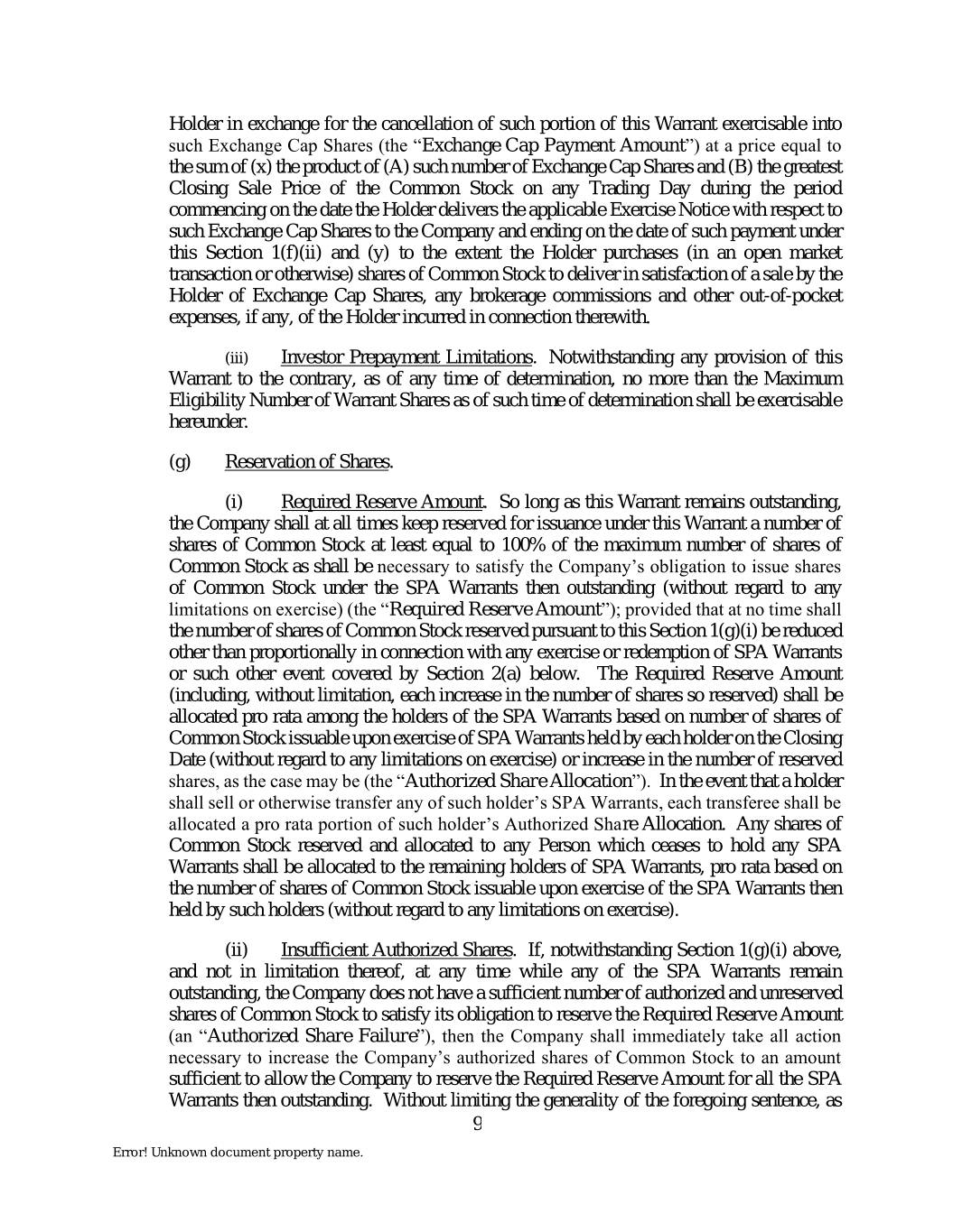 Holder in exchange for the cancellation of such portion of this Warrant exercisable into such Exchange Cap Shares (the “Exchange Cap Payment Amount”) at a price equal to the sum of (x) the product of (A) such number of Exchange Cap Shares and (B) the greatest Closing Sale Price of the Common Stock on any Trading Day during the period commencing on the date the Holder delivers the applicable Exercise Notice with respect to such Exchange Cap Shares to the Company and ending on the date of such payment under this Section 1(f)(ii) and (y) to the extent the Holder purchases (in an open market transaction or otherwise) shares of Common Stock to deliver in satisfaction of a sale by the Holder of Exchange Cap Shares, any brokerage commissions and other out-of-pocket expenses, if any, of the Holder incurred in connection therewith. (iii) Investor Prepayment Limitations. Notwithstanding any provision of this Warrant to the contrary, as of any time of determination, no more than the Maximum Eligibility Number of Warrant Shares as of such time of determination shall be exercisable hereunder. (g) Reservation of Shares. (i) Required Reserve Amount. So long as this Warrant remains outstanding, the Company shall at all times keep reserved for issuance under this Warrant a number of shares of Common Stock at least equal to 100% of the maximum number of shares of Common Stock as shall be necessary to satisfy the Company’s obligation to issue shares of Common Stock under the SPA Warrants then outstanding (without regard to any limitations on exercise) (the “Required Reserve Amount”); provided that at no time shall the number of shares of Common Stock reserved pursuant to this Section 1(g)(i) be reduced other than proportionally in connection with any exercise or redemption of SPA Warrants or such other event covered by Section 2(a) below. The Required Reserve Amount (including, without limitation, each increase in the number of shares so reserved) shall be allocated pro rata among the holders of the SPA Warrants based on number of shares of Common Stock issuable upon exercise of SPA Warrants held by each holder on the Closing Date (without regard to any limitations on exercise) or increase in the number of reserved shares, as the case may be (the “Authorized Share Allocation”). In the event that a holder shall sell or otherwise transfer any of such holder’s SPA Warrants, each transferee shall be allocated a pro rata portion of such holder’s Authorized Share Allocation. Any shares of Common Stock reserved and allocated to any Person which ceases to hold any SPA Warrants shall be allocated to the remaining holders of SPA Warrants, pro rata based on the number of shares of Common Stock issuable upon exercise of the SPA Warrants then held by such holders (without regard to any limitations on exercise). (ii) Insufficient Authorized Shares. If, notwithstanding Section 1(g)(i) above, and not in limitation thereof, at any time while any of the SPA Warrants remain outstanding, the Company does not have a sufficient number of authorized and unreserved shares of Common Stock to satisfy its obligation to reserve the Required Reserve Amount (an “Authorized Share Failure”), then the Company shall immediately take all action necessary to increase the Company’s authorized shares of Common Stock to an amount sufficient to allow the Company to reserve the Required Reserve Amount for all the SPA Warrants then outstanding. Without limiting the generality of the foregoing sentence, as 9 Error! Unknown document property name.