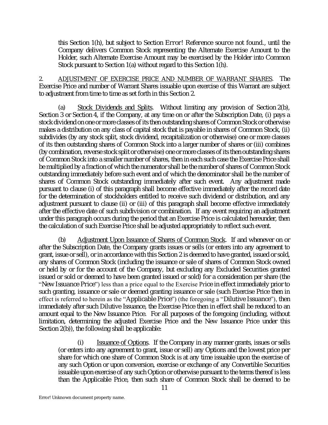 this Section 1(h), but subject to Section Error! Reference source not found., until the Company delivers Common Stock representing the Alternate Exercise Amount to the Holder, such Alternate Exercise Amount may be exercised by the Holder into Common Stock pursuant to Section 1(a) without regard to this Section 1(h). 2. ADJUSTMENT OF EXERCISE PRICE AND NUMBER OF WARRANT SHARES. The Exercise Price and number of Warrant Shares issuable upon exercise of this Warrant are subject to adjustment from time to time as set forth in this Section 2. (a) Stock Dividends and Splits. Without limiting any provision of Section 2(b), Section 3 or Section 4, if the Company, at any time on or after the Subscription Date, (i) pays a stock dividend on one or more classes of its then outstanding shares of Common Stock or otherwise makes a distribution on any class of capital stock that is payable in shares of Common Stock, (ii) subdivides (by any stock split, stock dividend, recapitalization or otherwise) one or more classes of its then outstanding shares of Common Stock into a larger number of shares or (iii) combines (by combination, reverse stock split or otherwise) one or more classes of its then outstanding shares of Common Stock into a smaller number of shares, then in each such case the Exercise Price shall be multiplied by a fraction of which the numerator shall be the number of shares of Common Stock outstanding immediately before such event and of which the denominator shall be the number of shares of Common Stock outstanding immediately after such event. Any adjustment made pursuant to clause (i) of this paragraph shall become effective immediately after the record date for the determination of stockholders entitled to receive such dividend or distribution, and any adjustment pursuant to clause (ii) or (iii) of this paragraph shall become effective immediately after the effective date of such subdivision or combination. If any event requiring an adjustment under this paragraph occurs during the period that an Exercise Price is calculated hereunder, then the calculation of such Exercise Price shall be adjusted appropriately to reflect such event. (b) Adjustment Upon Issuance of Shares of Common Stock. If and whenever on or after the Subscription Date, the Company grants issues or sells (or enters into any agreement to grant, issue or sell), or in accordance with this Section 2 is deemed to have granted, issued or sold, any shares of Common Stock (including the issuance or sale of shares of Common Stock owned or held by or for the account of the Company, but excluding any Excluded Securities granted issued or sold or deemed to have been granted issued or sold) for a consideration per share (the “New Issuance Price”) less than a price equal to the Exercise Price in effect immediately prior to such granting, issuance or sale or deemed granting issuance or sale (such Exercise Price then in effect is referred to herein as the “Applicable Price”) (the foregoing a “Dilutive Issuance”), then immediately after such Dilutive Issuance, the Exercise Price then in effect shall be reduced to an amount equal to the New Issuance Price. For all purposes of the foregoing (including, without limitation, determining the adjusted Exercise Price and the New Issuance Price under this Section 2(b)), the following shall be applicable: (i) Issuance of Options. If the Company in any manner grants, issues or sells (or enters into any agreement to grant, issue or sell) any Options and the lowest price per share for which one share of Common Stock is at any time issuable upon the exercise of any such Option or upon conversion, exercise or exchange of any Convertible Securities issuable upon exercise of any such Option or otherwise pursuant to the terms thereof is less than the Applicable Price, then such share of Common Stock shall be deemed to be 11 Error! Unknown document property name.
