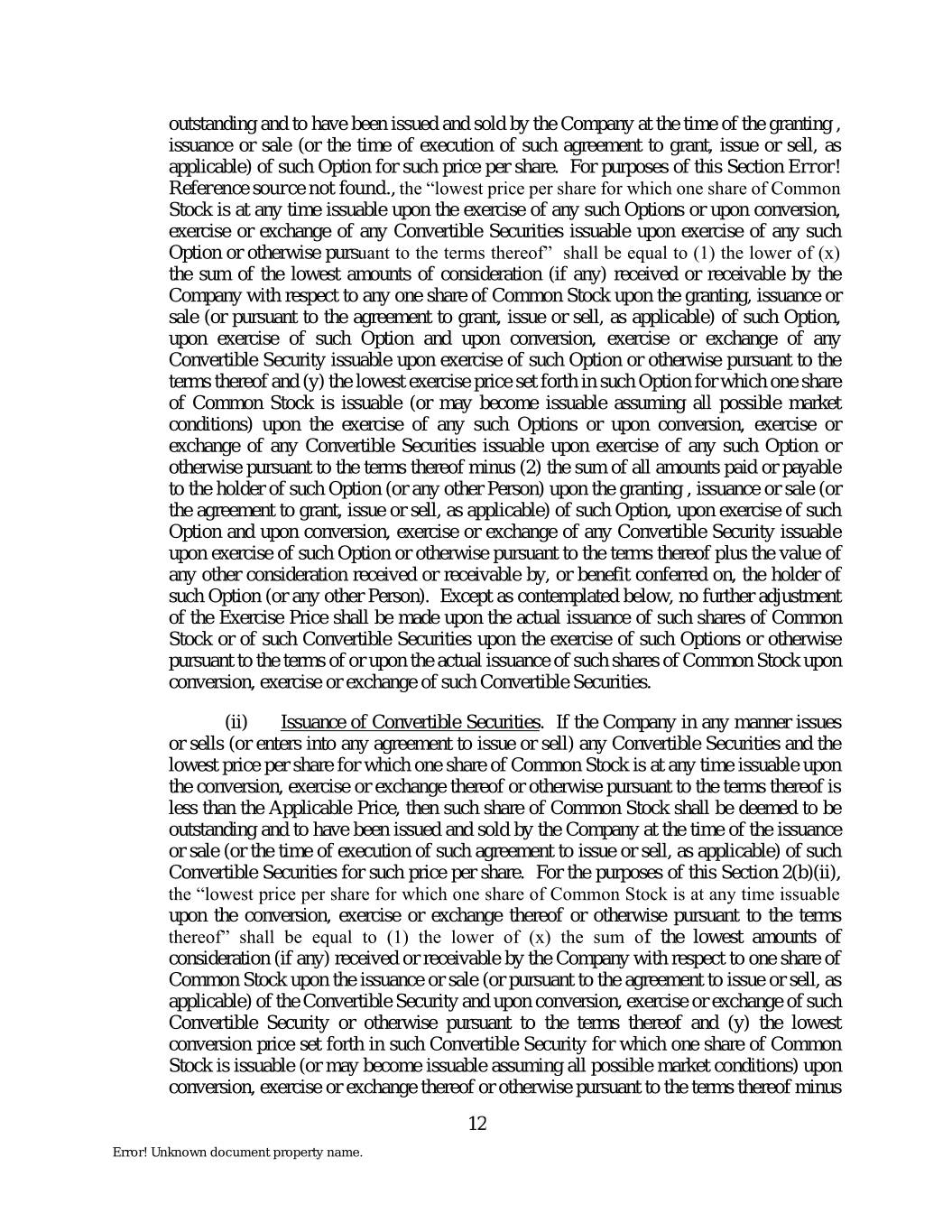 outstanding and to have been issued and sold by the Company at the time of the granting , issuance or sale (or the time of execution of such agreement to grant, issue or sell, as applicable) of such Option for such price per share. For purposes of this Section Error! Reference source not found., the “lowest price per share for which one share of Common Stock is at any time issuable upon the exercise of any such Options or upon conversion, exercise or exchange of any Convertible Securities issuable upon exercise of any such Option or otherwise pursuant to the terms thereof” shall be equal to (1) the lower of (x) the sum of the lowest amounts of consideration (if any) received or receivable by the Company with respect to any one share of Common Stock upon the granting, issuance or sale (or pursuant to the agreement to grant, issue or sell, as applicable) of such Option, upon exercise of such Option and upon conversion, exercise or exchange of any Convertible Security issuable upon exercise of such Option or otherwise pursuant to the terms thereof and (y) the lowest exercise price set forth in such Option for which one share of Common Stock is issuable (or may become issuable assuming all possible market conditions) upon the exercise of any such Options or upon conversion, exercise or exchange of any Convertible Securities issuable upon exercise of any such Option or otherwise pursuant to the terms thereof minus (2) the sum of all amounts paid or payable to the holder of such Option (or any other Person) upon the granting , issuance or sale (or the agreement to grant, issue or sell, as applicable) of such Option, upon exercise of such Option and upon conversion, exercise or exchange of any Convertible Security issuable upon exercise of such Option or otherwise pursuant to the terms thereof plus the value of any other consideration received or receivable by, or benefit conferred on, the holder of such Option (or any other Person). Except as contemplated below, no further adjustment of the Exercise Price shall be made upon the actual issuance of such shares of Common Stock or of such Convertible Securities upon the exercise of such Options or otherwise pursuant to the terms of or upon the actual issuance of such shares of Common Stock upon conversion, exercise or exchange of such Convertible Securities. (ii) Issuance of Convertible Securities. If the Company in any manner issues or sells (or enters into any agreement to issue or sell) any Convertible Securities and the lowest price per share for which one share of Common Stock is at any time issuable upon the conversion, exercise or exchange thereof or otherwise pursuant to the terms thereof is less than the Applicable Price, then such share of Common Stock shall be deemed to be outstanding and to have been issued and sold by the Company at the time of the issuance or sale (or the time of execution of such agreement to issue or sell, as applicable) of such Convertible Securities for such price per share. For the purposes of this Section 2(b)(ii), the “lowest price per share for which one share of Common Stock is at any time issuable upon the conversion, exercise or exchange thereof or otherwise pursuant to the terms thereof” shall be equal to (1) the lower of (x) the sum of the lowest amounts of consideration (if any) received or receivable by the Company with respect to one share of Common Stock upon the issuance or sale (or pursuant to the agreement to issue or sell, as applicable) of the Convertible Security and upon conversion, exercise or exchange of such Convertible Security or otherwise pursuant to the terms thereof and (y) the lowest conversion price set forth in such Convertible Security for which one share of Common Stock is issuable (or may become issuable assuming all possible market conditions) upon conversion, exercise or exchange thereof or otherwise pursuant to the terms thereof minus 12 Error! Unknown document property name.
