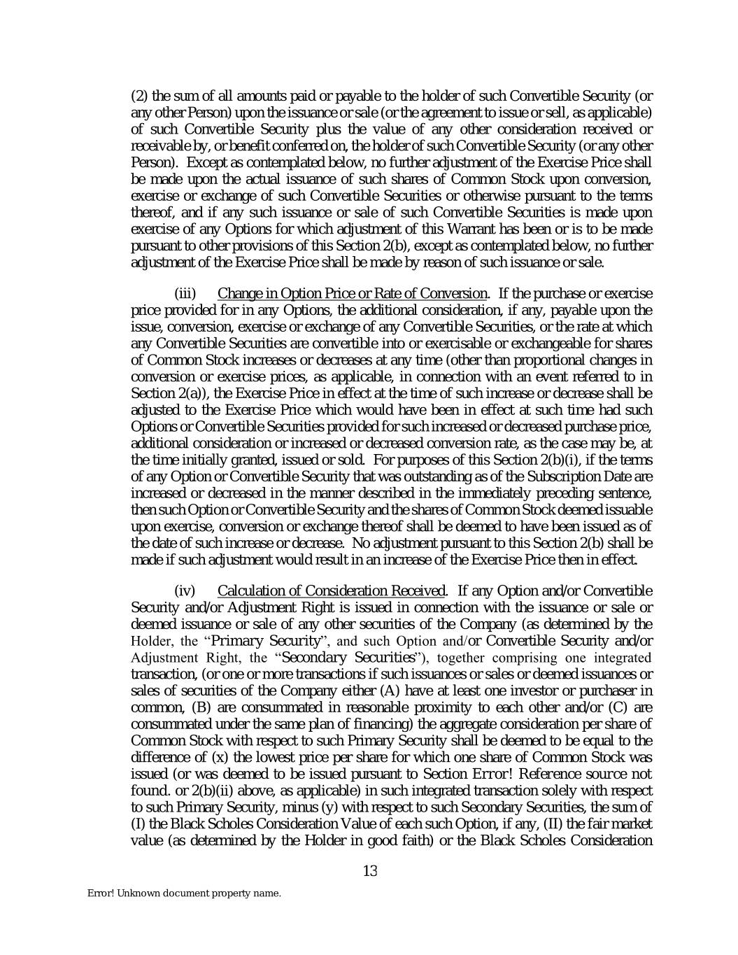 (2) the sum of all amounts paid or payable to the holder of such Convertible Security (or any other Person) upon the issuance or sale (or the agreement to issue or sell, as applicable) of such Convertible Security plus the value of any other consideration received or receivable by, or benefit conferred on, the holder of such Convertible Security (or any other Person). Except as contemplated below, no further adjustment of the Exercise Price shall be made upon the actual issuance of such shares of Common Stock upon conversion, exercise or exchange of such Convertible Securities or otherwise pursuant to the terms thereof, and if any such issuance or sale of such Convertible Securities is made upon exercise of any Options for which adjustment of this Warrant has been or is to be made pursuant to other provisions of this Section 2(b), except as contemplated below, no further adjustment of the Exercise Price shall be made by reason of such issuance or sale. (iii) Change in Option Price or Rate of Conversion. If the purchase or exercise price provided for in any Options, the additional consideration, if any, payable upon the issue, conversion, exercise or exchange of any Convertible Securities, or the rate at which any Convertible Securities are convertible into or exercisable or exchangeable for shares of Common Stock increases or decreases at any time (other than proportional changes in conversion or exercise prices, as applicable, in connection with an event referred to in Section 2(a)), the Exercise Price in effect at the time of such increase or decrease shall be adjusted to the Exercise Price which would have been in effect at such time had such Options or Convertible Securities provided for such increased or decreased purchase price, additional consideration or increased or decreased conversion rate, as the case may be, at the time initially granted, issued or sold. For purposes of this Section 2(b)(i), if the terms of any Option or Convertible Security that was outstanding as of the Subscription Date are increased or decreased in the manner described in the immediately preceding sentence, then such Option or Convertible Security and the shares of Common Stock deemed issuable upon exercise, conversion or exchange thereof shall be deemed to have been issued as of the date of such increase or decrease. No adjustment pursuant to this Section 2(b) shall be made if such adjustment would result in an increase of the Exercise Price then in effect. (iv) Calculation of Consideration Received. If any Option and/or Convertible Security and/or Adjustment Right is issued in connection with the issuance or sale or deemed issuance or sale of any other securities of the Company (as determined by the Holder, the “Primary Security”, and such Option and/or Convertible Security and/or Adjustment Right, the “Secondary Securities”), together comprising one integrated transaction, (or one or more transactions if such issuances or sales or deemed issuances or sales of securities of the Company either (A) have at least one investor or purchaser in common, (B) are consummated in reasonable proximity to each other and/or (C) are consummated under the same plan of financing) the aggregate consideration per share of Common Stock with respect to such Primary Security shall be deemed to be equal to the difference of (x) the lowest price per share for which one share of Common Stock was issued (or was deemed to be issued pursuant to Section Error! Reference source not found. or 2(b)(ii) above, as applicable) in such integrated transaction solely with respect to such Primary Security, minus (y) with respect to such Secondary Securities, the sum of (I) the Black Scholes Consideration Value of each such Option, if any, (II) the fair market value (as determined by the Holder in good faith) or the Black Scholes Consideration 13 Error! Unknown document property name.