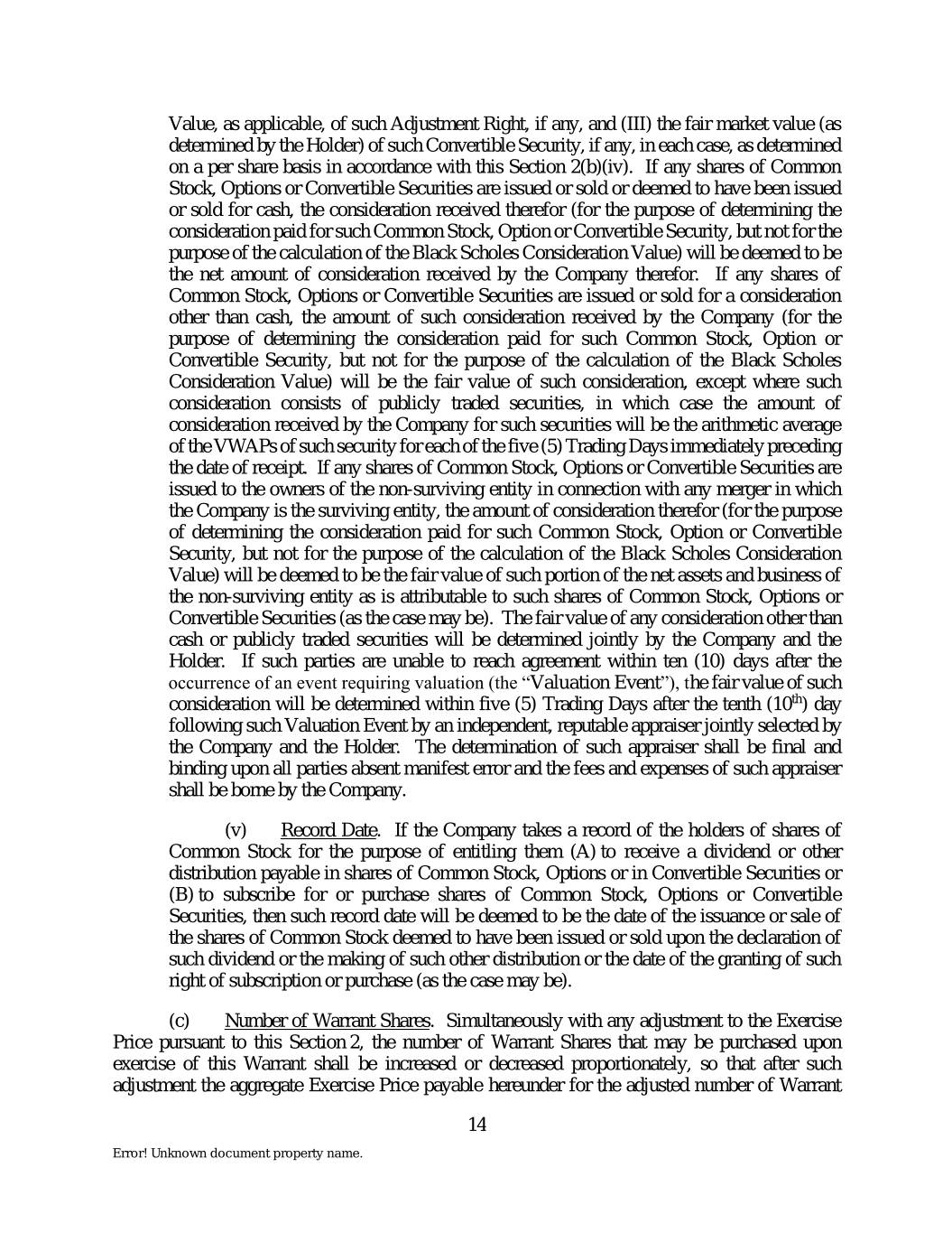 Value, as applicable, of such Adjustment Right, if any, and (III) the fair market value (as determined by the Holder) of such Convertible Security, if any, in each case, as determined on a per share basis in accordance with this Section 2(b)(iv). If any shares of Common Stock, Options or Convertible Securities are issued or sold or deemed to have been issued or sold for cash, the consideration received therefor (for the purpose of determining the consideration paid for such Common Stock, Option or Convertible Security, but not for the purpose of the calculation of the Black Scholes Consideration Value) will be deemed to be the net amount of consideration received by the Company therefor. If any shares of Common Stock, Options or Convertible Securities are issued or sold for a consideration other than cash, the amount of such consideration received by the Company (for the purpose of determining the consideration paid for such Common Stock, Option or Convertible Security, but not for the purpose of the calculation of the Black Scholes Consideration Value) will be the fair value of such consideration, except where such consideration consists of publicly traded securities, in which case the amount of consideration received by the Company for such securities will be the arithmetic average of the VWAPs of such security for each of the five (5) Trading Days immediately preceding the date of receipt. If any shares of Common Stock, Options or Convertible Securities are issued to the owners of the non-surviving entity in connection with any merger in which the Company is the surviving entity, the amount of consideration therefor (for the purpose of determining the consideration paid for such Common Stock, Option or Convertible Security, but not for the purpose of the calculation of the Black Scholes Consideration Value) will be deemed to be the fair value of such portion of the net assets and business of the non-surviving entity as is attributable to such shares of Common Stock, Options or Convertible Securities (as the case may be). The fair value of any consideration other than cash or publicly traded securities will be determined jointly by the Company and the Holder. If such parties are unable to reach agreement within ten (10) days after the occurrence of an event requiring valuation (the “Valuation Event”), the fair value of such consideration will be determined within five (5) Trading Days after the tenth (10th) day following such Valuation Event by an independent, reputable appraiser jointly selected by the Company and the Holder. The determination of such appraiser shall be final and binding upon all parties absent manifest error and the fees and expenses of such appraiser shall be borne by the Company. (v) Record Date. If the Company takes a record of the holders of shares of Common Stock for the purpose of entitling them (A) to receive a dividend or other distribution payable in shares of Common Stock, Options or in Convertible Securities or (B) to subscribe for or purchase shares of Common Stock, Options or Convertible Securities, then such record date will be deemed to be the date of the issuance or sale of the shares of Common Stock deemed to have been issued or sold upon the declaration of such dividend or the making of such other distribution or the date of the granting of such right of subscription or purchase (as the case may be). (c) Number of Warrant Shares. Simultaneously with any adjustment to the Exercise Price pursuant to this Section 2, the number of Warrant Shares that may be purchased upon exercise of this Warrant shall be increased or decreased proportionately, so that after such adjustment the aggregate Exercise Price payable hereunder for the adjusted number of Warrant 14 Error! Unknown document property name.