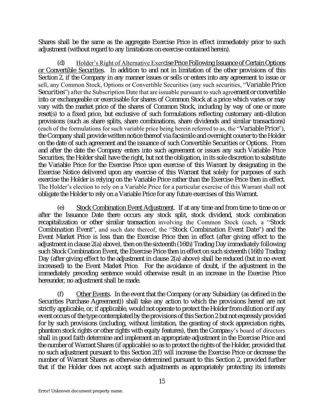 Shares shall be the same as the aggregate Exercise Price in effect immediately prior to such adjustment (without regard to any limitations on exercise contained herein). (d) Holder’s Right of Alternative Exercise Price Following Issuance of Certain Options or Convertible Securities. In addition to and not in limitation of the other provisions of this Section 2, if the Company in any manner issues or sells or enters into any agreement to issue or sell, any Common Stock, Options or Convertible Securities (any such securities, “Variable Price Securities”) after the Subscription Date that are issuable pursuant to such agreement or convertible into or exchangeable or exercisable for shares of Common Stock at a price which varies or may vary with the market price of the shares of Common Stock, including by way of one or more reset(s) to a fixed price, but exclusive of such formulations reflecting customary anti-dilution provisions (such as share splits, share combinations, share dividends and similar transactions) (each of the formulations for such variable price being herein referred to as, the “Variable Price”), the Company shall provide written notice thereof via facsimile and overnight courier to the Holder on the date of such agreement and the issuance of such Convertible Securities or Options. From and after the date the Company enters into such agreement or issues any such Variable Price Securities, the Holder shall have the right, but not the obligation, in its sole discretion to substitute the Variable Price for the Exercise Price upon exercise of this Warrant by designating in the Exercise Notice delivered upon any exercise of this Warrant that solely for purposes of such exercise the Holder is relying on the Variable Price rather than the Exercise Price then in effect. The Holder’s election to rely on a Variable Price for a particular exercise of this Warrant shall not obligate the Holder to rely on a Variable Price for any future exercises of this Warrant. (e) Stock Combination Event Adjustment. If at any time and from time to time on or after the Issuance Date there occurs any stock split, stock dividend, stock combination recapitalization or other similar transaction involving the Common Stock (each, a “Stock Combination Event”, and such date thereof, the “Stock Combination Event Date”) and the Event Market Price is less than the Exercise Price then in effect (after giving effect to the adjustment in clause 2(a) above), then on the sixteenth (16th) Trading Day immediately following such Stock Combination Event, the Exercise Price then in effect on such sixteenth (16th) Trading Day (after giving effect to the adjustment in clause 2(a) above) shall be reduced (but in no event increased) to the Event Market Price. For the avoidance of doubt, if the adjustment in the immediately preceding sentence would otherwise result in an increase in the Exercise Price hereunder, no adjustment shall be made. (f) Other Events. In the event that the Company (or any Subsidiary (as defined in the Securities Purchase Agreement)) shall take any action to which the provisions hereof are not strictly applicable, or, if applicable, would not operate to protect the Holder from dilution or if any event occurs of the type contemplated by the provisions of this Section 2 but not expressly provided for by such provisions (including, without limitation, the granting of stock appreciation rights, phantom stock rights or other rights with equity features), then the Company’s board of directors shall in good faith determine and implement an appropriate adjustment in the Exercise Price and the number of Warrant Shares (if applicable) so as to protect the rights of the Holder, provided that no such adjustment pursuant to this Section 2(f) will increase the Exercise Price or decrease the number of Warrant Shares as otherwise determined pursuant to this Section 2, provided further that if the Holder does not accept such adjustments as appropriately protecting its interests 15 Error! Unknown document property name.