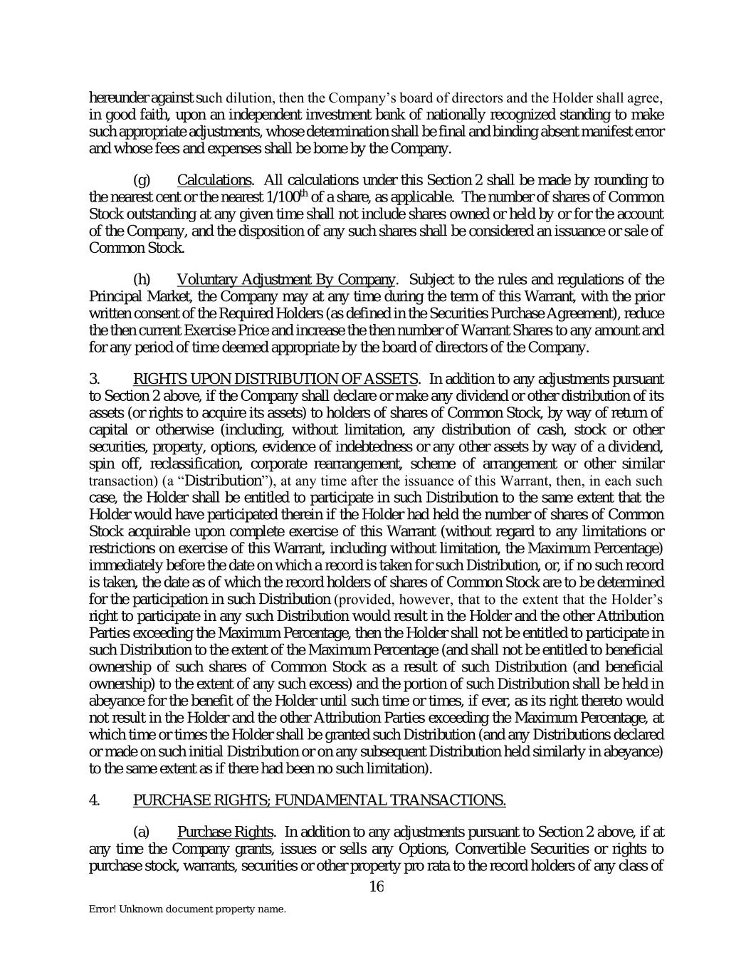 hereunder against such dilution, then the Company’s board of directors and the Holder shall agree, in good faith, upon an independent investment bank of nationally recognized standing to make such appropriate adjustments, whose determination shall be final and binding absent manifest error and whose fees and expenses shall be borne by the Company. (g) Calculations. All calculations under this Section 2 shall be made by rounding to the nearest cent or the nearest 1/100th of a share, as applicable. The number of shares of Common Stock outstanding at any given time shall not include shares owned or held by or for the account of the Company, and the disposition of any such shares shall be considered an issuance or sale of Common Stock. (h) Voluntary Adjustment By Company. Subject to the rules and regulations of the Principal Market, the Company may at any time during the term of this Warrant, with the prior written consent of the Required Holders (as defined in the Securities Purchase Agreement), reduce the then current Exercise Price and increase the then number of Warrant Shares to any amount and for any period of time deemed appropriate by the board of directors of the Company. 3. RIGHTS UPON DISTRIBUTION OF ASSETS. In addition to any adjustments pursuant to Section 2 above, if the Company shall declare or make any dividend or other distribution of its assets (or rights to acquire its assets) to holders of shares of Common Stock, by way of return of capital or otherwise (including, without limitation, any distribution of cash, stock or other securities, property, options, evidence of indebtedness or any other assets by way of a dividend, spin off, reclassification, corporate rearrangement, scheme of arrangement or other similar transaction) (a “Distribution”), at any time after the issuance of this Warrant, then, in each such case, the Holder shall be entitled to participate in such Distribution to the same extent that the Holder would have participated therein if the Holder had held the number of shares of Common Stock acquirable upon complete exercise of this Warrant (without regard to any limitations or restrictions on exercise of this Warrant, including without limitation, the Maximum Percentage) immediately before the date on which a record is taken for such Distribution, or, if no such record is taken, the date as of which the record holders of shares of Common Stock are to be determined for the participation in such Distribution (provided, however, that to the extent that the Holder’s right to participate in any such Distribution would result in the Holder and the other Attribution Parties exceeding the Maximum Percentage, then the Holder shall not be entitled to participate in such Distribution to the extent of the Maximum Percentage (and shall not be entitled to beneficial ownership of such shares of Common Stock as a result of such Distribution (and beneficial ownership) to the extent of any such excess) and the portion of such Distribution shall be held in abeyance for the benefit of the Holder until such time or times, if ever, as its right thereto would not result in the Holder and the other Attribution Parties exceeding the Maximum Percentage, at which time or times the Holder shall be granted such Distribution (and any Distributions declared or made on such initial Distribution or on any subsequent Distribution held similarly in abeyance) to the same extent as if there had been no such limitation). 4. PURCHASE RIGHTS; FUNDAMENTAL TRANSACTIONS. (a) Purchase Rights. In addition to any adjustments pursuant to Section 2 above, if at any time the Company grants, issues or sells any Options, Convertible Securities or rights to purchase stock, warrants, securities or other property pro rata to the record holders of any class of 16 Error! Unknown document property name.