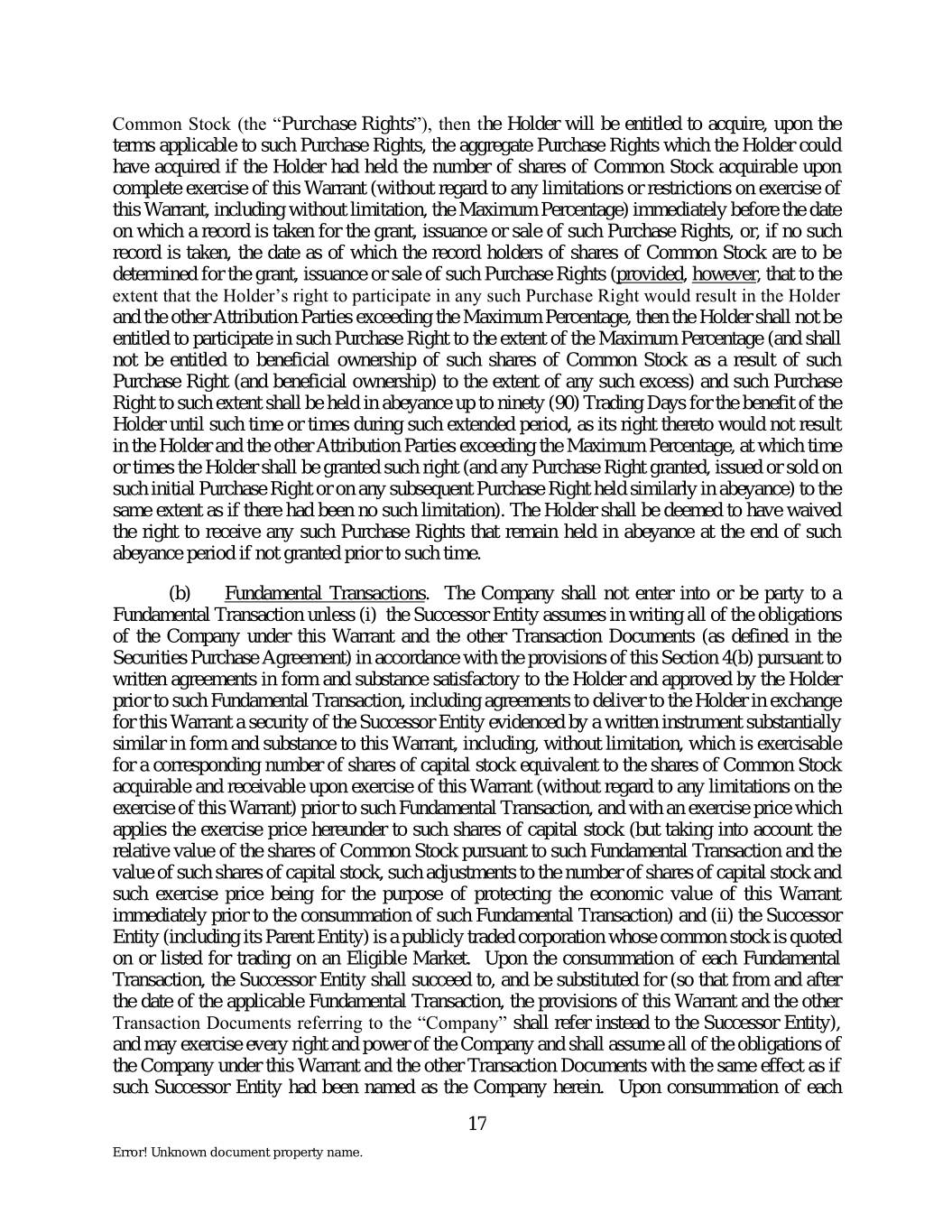 Common Stock (the “Purchase Rights”), then the Holder will be entitled to acquire, upon the terms applicable to such Purchase Rights, the aggregate Purchase Rights which the Holder could have acquired if the Holder had held the number of shares of Common Stock acquirable upon complete exercise of this Warrant (without regard to any limitations or restrictions on exercise of this Warrant, including without limitation, the Maximum Percentage) immediately before the date on which a record is taken for the grant, issuance or sale of such Purchase Rights, or, if no such record is taken, the date as of which the record holders of shares of Common Stock are to be determined for the grant, issuance or sale of such Purchase Rights (provided, however, that to the extent that the Holder’s right to participate in any such Purchase Right would result in the Holder and the other Attribution Parties exceeding the Maximum Percentage, then the Holder shall not be entitled to participate in such Purchase Right to the extent of the Maximum Percentage (and shall not be entitled to beneficial ownership of such shares of Common Stock as a result of such Purchase Right (and beneficial ownership) to the extent of any such excess) and such Purchase Right to such extent shall be held in abeyance up to ninety (90) Trading Days for the benefit of the Holder until such time or times during such extended period, as its right thereto would not result in the Holder and the other Attribution Parties exceeding the Maximum Percentage, at which time or times the Holder shall be granted such right (and any Purchase Right granted, issued or sold on such initial Purchase Right or on any subsequent Purchase Right held similarly in abeyance) to the same extent as if there had been no such limitation). The Holder shall be deemed to have waived the right to receive any such Purchase Rights that remain held in abeyance at the end of such abeyance period if not granted prior to such time. (b) Fundamental Transactions. The Company shall not enter into or be party to a Fundamental Transaction unless (i) the Successor Entity assumes in writing all of the obligations of the Company under this Warrant and the other Transaction Documents (as defined in the Securities Purchase Agreement) in accordance with the provisions of this Section 4(b) pursuant to written agreements in form and substance satisfactory to the Holder and approved by the Holder prior to such Fundamental Transaction, including agreements to deliver to the Holder in exchange for this Warrant a security of the Successor Entity evidenced by a written instrument substantially similar in form and substance to this Warrant, including, without limitation, which is exercisable for a corresponding number of shares of capital stock equivalent to the shares of Common Stock acquirable and receivable upon exercise of this Warrant (without regard to any limitations on the exercise of this Warrant) prior to such Fundamental Transaction, and with an exercise price which applies the exercise price hereunder to such shares of capital stock (but taking into account the relative value of the shares of Common Stock pursuant to such Fundamental Transaction and the value of such shares of capital stock, such adjustments to the number of shares of capital stock and such exercise price being for the purpose of protecting the economic value of this Warrant immediately prior to the consummation of such Fundamental Transaction) and (ii) the Successor Entity (including its Parent Entity) is a publicly traded corporation whose common stock is quoted on or listed for trading on an Eligible Market. Upon the consummation of each Fundamental Transaction, the Successor Entity shall succeed to, and be substituted for (so that from and after the date of the applicable Fundamental Transaction, the provisions of this Warrant and the other Transaction Documents referring to the “Company” shall refer instead to the Successor Entity), and may exercise every right and power of the Company and shall assume all of the obligations of the Company under this Warrant and the other Transaction Documents with the same effect as if such Successor Entity had been named as the Company herein. Upon consummation of each 17 Error! Unknown document property name.
