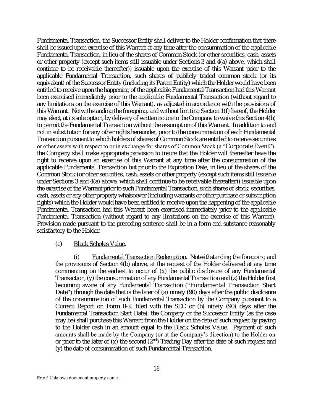 Fundamental Transaction, the Successor Entity shall deliver to the Holder confirmation that there shall be issued upon exercise of this Warrant at any time after the consummation of the applicable Fundamental Transaction, in lieu of the shares of Common Stock (or other securities, cash, assets or other property (except such items still issuable under Sections 3 and 4(a) above, which shall continue to be receivable thereafter)) issuable upon the exercise of this Warrant prior to the applicable Fundamental Transaction, such shares of publicly traded common stock (or its equivalent) of the Successor Entity (including its Parent Entity) which the Holder would have been entitled to receive upon the happening of the applicable Fundamental Transaction had this Warrant been exercised immediately prior to the applicable Fundamental Transaction (without regard to any limitations on the exercise of this Warrant), as adjusted in accordance with the provisions of this Warrant. Notwithstanding the foregoing, and without limiting Section 1(f) hereof, the Holder may elect, at its sole option, by delivery of written notice to the Company to waive this Section 4(b) to permit the Fundamental Transaction without the assumption of this Warrant. In addition to and not in substitution for any other rights hereunder, prior to the consummation of each Fundamental Transaction pursuant to which holders of shares of Common Stock are entitled to receive securities or other assets with respect to or in exchange for shares of Common Stock (a “Corporate Event”), the Company shall make appropriate provision to insure that the Holder will thereafter have the right to receive upon an exercise of this Warrant at any time after the consummation of the applicable Fundamental Transaction but prior to the Expiration Date, in lieu of the shares of the Common Stock (or other securities, cash, assets or other property (except such items still issuable under Sections 3 and 4(a) above, which shall continue to be receivable thereafter)) issuable upon the exercise of the Warrant prior to such Fundamental Transaction, such shares of stock, securities, cash, assets or any other property whatsoever (including warrants or other purchase or subscription rights) which the Holder would have been entitled to receive upon the happening of the applicable Fundamental Transaction had this Warrant been exercised immediately prior to the applicable Fundamental Transaction (without regard to any limitations on the exercise of this Warrant). Provision made pursuant to the preceding sentence shall be in a form and substance reasonably satisfactory to the Holder. (c) Black Scholes Value. (i) Fundamental Transaction Redemption. Notwithstanding the foregoing and the provisions of Section 4(b) above, at the request of the Holder delivered at any time commencing on the earliest to occur of (x) the public disclosure of any Fundamental Transaction, (y) the consummation of any Fundamental Transaction and (z) the Holder first becoming aware of any Fundamental Transaction (“Fundamental Transaction Start Date”) through the date that is the later of (a) ninety (90) days after the public disclosure of the consummation of such Fundamental Transaction by the Company pursuant to a Current Report on Form 8-K filed with the SEC or (b) ninety (90) days after the Fundamental Transaction Start Date), the Company or the Successor Entity (as the case may be) shall purchase this Warrant from the Holder on the date of such request by paying to the Holder cash in an amount equal to the Black Scholes Value. Payment of such amounts shall be made by the Company (or at the Company’s direction) to the Holder on or prior to the later of (x) the second (2nd) Trading Day after the date of such request and (y) the date of consummation of such Fundamental Transaction. 18 Error! Unknown document property name.