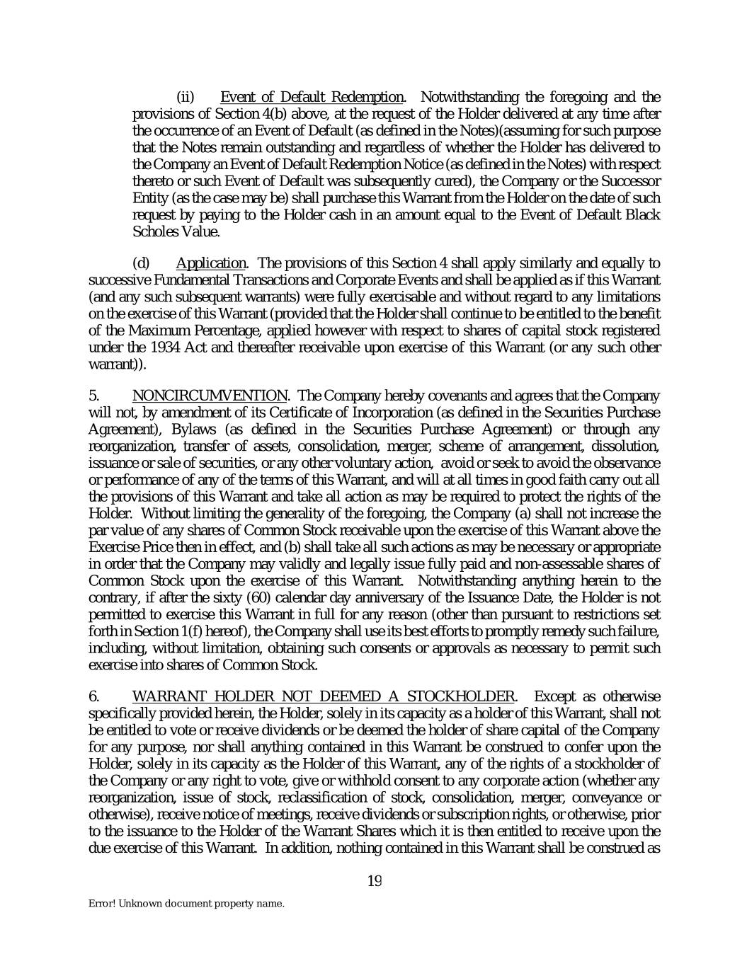 (ii) Event of Default Redemption. Notwithstanding the foregoing and the provisions of Section 4(b) above, at the request of the Holder delivered at any time after the occurrence of an Event of Default (as defined in the Notes)(assuming for such purpose that the Notes remain outstanding and regardless of whether the Holder has delivered to the Company an Event of Default Redemption Notice (as defined in the Notes) with respect thereto or such Event of Default was subsequently cured), the Company or the Successor Entity (as the case may be) shall purchase this Warrant from the Holder on the date of such request by paying to the Holder cash in an amount equal to the Event of Default Black Scholes Value. (d) Application. The provisions of this Section 4 shall apply similarly and equally to successive Fundamental Transactions and Corporate Events and shall be applied as if this Warrant (and any such subsequent warrants) were fully exercisable and without regard to any limitations on the exercise of this Warrant (provided that the Holder shall continue to be entitled to the benefit of the Maximum Percentage, applied however with respect to shares of capital stock registered under the 1934 Act and thereafter receivable upon exercise of this Warrant (or any such other warrant)). 5. NONCIRCUMVENTION. The Company hereby covenants and agrees that the Company will not, by amendment of its Certificate of Incorporation (as defined in the Securities Purchase Agreement), Bylaws (as defined in the Securities Purchase Agreement) or through any reorganization, transfer of assets, consolidation, merger, scheme of arrangement, dissolution, issuance or sale of securities, or any other voluntary action, avoid or seek to avoid the observance or performance of any of the terms of this Warrant, and will at all times in good faith carry out all the provisions of this Warrant and take all action as may be required to protect the rights of the Holder. Without limiting the generality of the foregoing, the Company (a) shall not increase the par value of any shares of Common Stock receivable upon the exercise of this Warrant above the Exercise Price then in effect, and (b) shall take all such actions as may be necessary or appropriate in order that the Company may validly and legally issue fully paid and non-assessable shares of Common Stock upon the exercise of this Warrant. Notwithstanding anything herein to the contrary, if after the sixty (60) calendar day anniversary of the Issuance Date, the Holder is not permitted to exercise this Warrant in full for any reason (other than pursuant to restrictions set forth in Section 1(f) hereof), the Company shall use its best efforts to promptly remedy such failure, including, without limitation, obtaining such consents or approvals as necessary to permit such exercise into shares of Common Stock. 6. WARRANT HOLDER NOT DEEMED A STOCKHOLDER. Except as otherwise specifically provided herein, the Holder, solely in its capacity as a holder of this Warrant, shall not be entitled to vote or receive dividends or be deemed the holder of share capital of the Company for any purpose, nor shall anything contained in this Warrant be construed to confer upon the Holder, solely in its capacity as the Holder of this Warrant, any of the rights of a stockholder of the Company or any right to vote, give or withhold consent to any corporate action (whether any reorganization, issue of stock, reclassification of stock, consolidation, merger, conveyance or otherwise), receive notice of meetings, receive dividends or subscription rights, or otherwise, prior to the issuance to the Holder of the Warrant Shares which it is then entitled to receive upon the due exercise of this Warrant. In addition, nothing contained in this Warrant shall be construed as 19 Error! Unknown document property name.