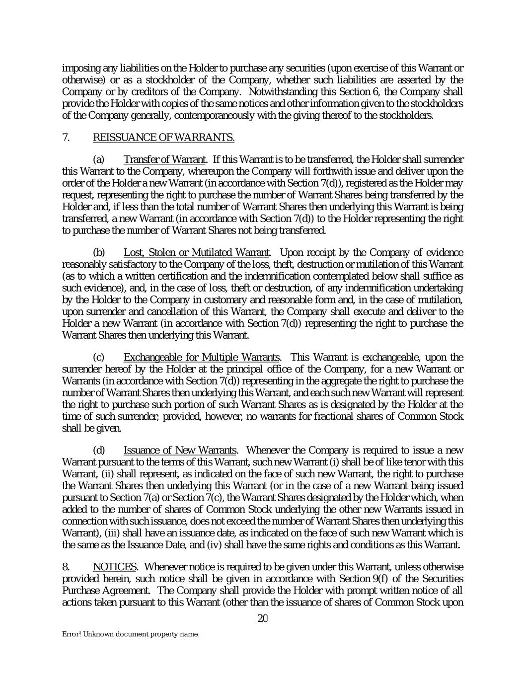 imposing any liabilities on the Holder to purchase any securities (upon exercise of this Warrant or otherwise) or as a stockholder of the Company, whether such liabilities are asserted by the Company or by creditors of the Company. Notwithstanding this Section 6, the Company shall provide the Holder with copies of the same notices and other information given to the stockholders of the Company generally, contemporaneously with the giving thereof to the stockholders. 7. REISSUANCE OF WARRANTS. (a) Transfer of Warrant. If this Warrant is to be transferred, the Holder shall surrender this Warrant to the Company, whereupon the Company will forthwith issue and deliver upon the order of the Holder a new Warrant (in accordance with Section 7(d)), registered as the Holder may request, representing the right to purchase the number of Warrant Shares being transferred by the Holder and, if less than the total number of Warrant Shares then underlying this Warrant is being transferred, a new Warrant (in accordance with Section 7(d)) to the Holder representing the right to purchase the number of Warrant Shares not being transferred. (b) Lost, Stolen or Mutilated Warrant. Upon receipt by the Company of evidence reasonably satisfactory to the Company of the loss, theft, destruction or mutilation of this Warrant (as to which a written certification and the indemnification contemplated below shall suffice as such evidence), and, in the case of loss, theft or destruction, of any indemnification undertaking by the Holder to the Company in customary and reasonable form and, in the case of mutilation, upon surrender and cancellation of this Warrant, the Company shall execute and deliver to the Holder a new Warrant (in accordance with Section 7(d)) representing the right to purchase the Warrant Shares then underlying this Warrant. (c) Exchangeable for Multiple Warrants. This Warrant is exchangeable, upon the surrender hereof by the Holder at the principal office of the Company, for a new Warrant or Warrants (in accordance with Section 7(d)) representing in the aggregate the right to purchase the number of Warrant Shares then underlying this Warrant, and each such new Warrant will represent the right to purchase such portion of such Warrant Shares as is designated by the Holder at the time of such surrender; provided, however, no warrants for fractional shares of Common Stock shall be given. (d) Issuance of New Warrants. Whenever the Company is required to issue a new Warrant pursuant to the terms of this Warrant, such new Warrant (i) shall be of like tenor with this Warrant, (ii) shall represent, as indicated on the face of such new Warrant, the right to purchase the Warrant Shares then underlying this Warrant (or in the case of a new Warrant being issued pursuant to Section 7(a) or Section 7(c), the Warrant Shares designated by the Holder which, when added to the number of shares of Common Stock underlying the other new Warrants issued in connection with such issuance, does not exceed the number of Warrant Shares then underlying this Warrant), (iii) shall have an issuance date, as indicated on the face of such new Warrant which is the same as the Issuance Date, and (iv) shall have the same rights and conditions as this Warrant. 8. NOTICES. Whenever notice is required to be given under this Warrant, unless otherwise provided herein, such notice shall be given in accordance with Section 9(f) of the Securities Purchase Agreement. The Company shall provide the Holder with prompt written notice of all actions taken pursuant to this Warrant (other than the issuance of shares of Common Stock upon 20 Error! Unknown document property name.