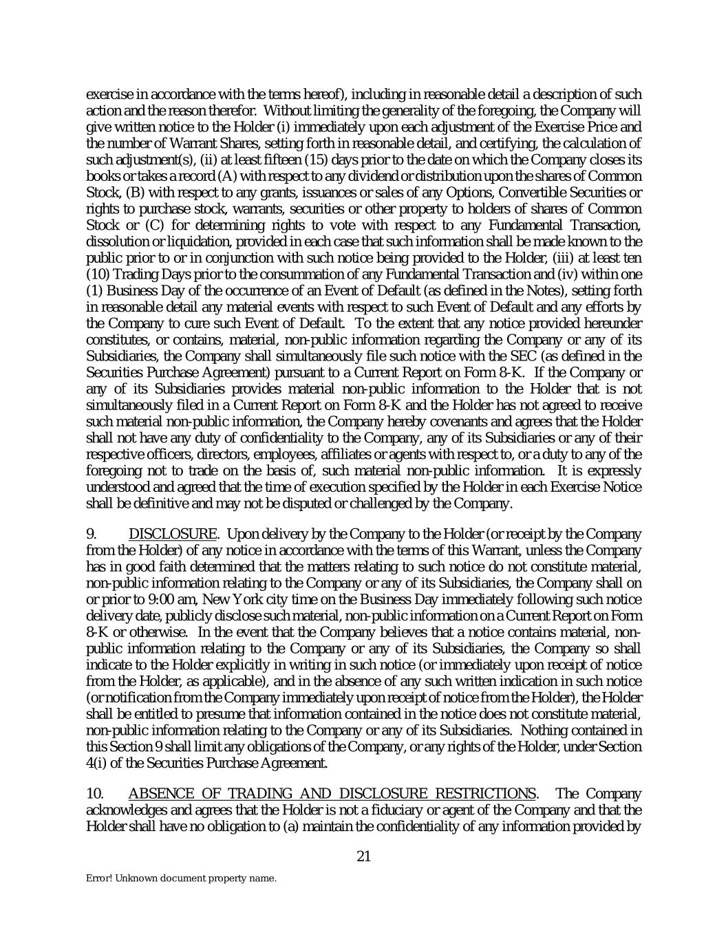 exercise in accordance with the terms hereof), including in reasonable detail a description of such action and the reason therefor. Without limiting the generality of the foregoing, the Company will give written notice to the Holder (i) immediately upon each adjustment of the Exercise Price and the number of Warrant Shares, setting forth in reasonable detail, and certifying, the calculation of such adjustment(s), (ii) at least fifteen (15) days prior to the date on which the Company closes its books or takes a record (A) with respect to any dividend or distribution upon the shares of Common Stock, (B) with respect to any grants, issuances or sales of any Options, Convertible Securities or rights to purchase stock, warrants, securities or other property to holders of shares of Common Stock or (C) for determining rights to vote with respect to any Fundamental Transaction, dissolution or liquidation, provided in each case that such information shall be made known to the public prior to or in conjunction with such notice being provided to the Holder, (iii) at least ten (10) Trading Days prior to the consummation of any Fundamental Transaction and (iv) within one (1) Business Day of the occurrence of an Event of Default (as defined in the Notes), setting forth in reasonable detail any material events with respect to such Event of Default and any efforts by the Company to cure such Event of Default. To the extent that any notice provided hereunder constitutes, or contains, material, non-public information regarding the Company or any of its Subsidiaries, the Company shall simultaneously file such notice with the SEC (as defined in the Securities Purchase Agreement) pursuant to a Current Report on Form 8-K. If the Company or any of its Subsidiaries provides material non-public information to the Holder that is not simultaneously filed in a Current Report on Form 8-K and the Holder has not agreed to receive such material non-public information, the Company hereby covenants and agrees that the Holder shall not have any duty of confidentiality to the Company, any of its Subsidiaries or any of their respective officers, directors, employees, affiliates or agents with respect to, or a duty to any of the foregoing not to trade on the basis of, such material non-public information. It is expressly understood and agreed that the time of execution specified by the Holder in each Exercise Notice shall be definitive and may not be disputed or challenged by the Company. 9. DISCLOSURE. Upon delivery by the Company to the Holder (or receipt by the Company from the Holder) of any notice in accordance with the terms of this Warrant, unless the Company has in good faith determined that the matters relating to such notice do not constitute material, non-public information relating to the Company or any of its Subsidiaries, the Company shall on or prior to 9:00 am, New York city time on the Business Day immediately following such notice delivery date, publicly disclose such material, non-public information on a Current Report on Form 8-K or otherwise. In the event that the Company believes that a notice contains material, non- public information relating to the Company or any of its Subsidiaries, the Company so shall indicate to the Holder explicitly in writing in such notice (or immediately upon receipt of notice from the Holder, as applicable), and in the absence of any such written indication in such notice (or notification from the Company immediately upon receipt of notice from the Holder), the Holder shall be entitled to presume that information contained in the notice does not constitute material, non-public information relating to the Company or any of its Subsidiaries. Nothing contained in this Section 9 shall limit any obligations of the Company, or any rights of the Holder, under Section 4(i) of the Securities Purchase Agreement. 10. ABSENCE OF TRADING AND DISCLOSURE RESTRICTIONS. The Company acknowledges and agrees that the Holder is not a fiduciary or agent of the Company and that the Holder shall have no obligation to (a) maintain the confidentiality of any information provided by 21 Error! Unknown document property name.