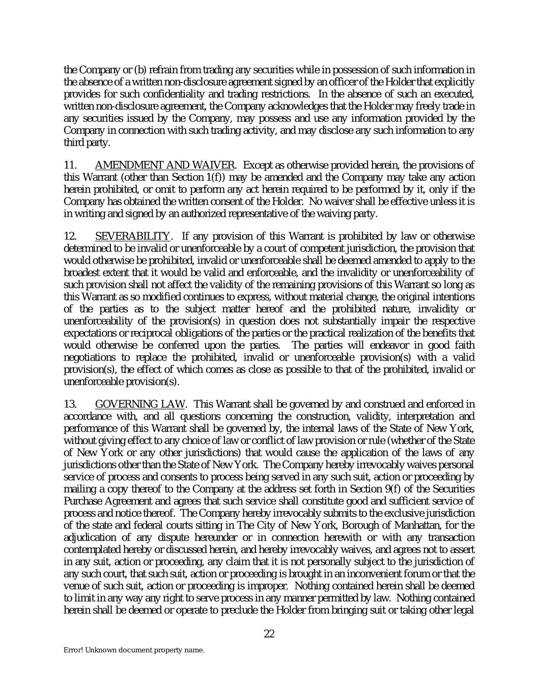 the Company or (b) refrain from trading any securities while in possession of such information in the absence of a written non-disclosure agreement signed by an officer of the Holder that explicitly provides for such confidentiality and trading restrictions. In the absence of such an executed, written non-disclosure agreement, the Company acknowledges that the Holder may freely trade in any securities issued by the Company, may possess and use any information provided by the Company in connection with such trading activity, and may disclose any such information to any third party. 11. AMENDMENT AND WAIVER. Except as otherwise provided herein, the provisions of this Warrant (other than Section 1(f)) may be amended and the Company may take any action herein prohibited, or omit to perform any act herein required to be performed by it, only if the Company has obtained the written consent of the Holder. No waiver shall be effective unless it is in writing and signed by an authorized representative of the waiving party. 12. SEVERABILITY. If any provision of this Warrant is prohibited by law or otherwise determined to be invalid or unenforceable by a court of competent jurisdiction, the provision that would otherwise be prohibited, invalid or unenforceable shall be deemed amended to apply to the broadest extent that it would be valid and enforceable, and the invalidity or unenforceability of such provision shall not affect the validity of the remaining provisions of this Warrant so long as this Warrant as so modified continues to express, without material change, the original intentions of the parties as to the subject matter hereof and the prohibited nature, invalidity or unenforceability of the provision(s) in question does not substantially impair the respective expectations or reciprocal obligations of the parties or the practical realization of the benefits that would otherwise be conferred upon the parties. The parties will endeavor in good faith negotiations to replace the prohibited, invalid or unenforceable provision(s) with a valid provision(s), the effect of which comes as close as possible to that of the prohibited, invalid or unenforceable provision(s). 13. GOVERNING LAW. This Warrant shall be governed by and construed and enforced in accordance with, and all questions concerning the construction, validity, interpretation and performance of this Warrant shall be governed by, the internal laws of the State of New York, without giving effect to any choice of law or conflict of law provision or rule (whether of the State of New York or any other jurisdictions) that would cause the application of the laws of any jurisdictions other than the State of New York. The Company hereby irrevocably waives personal service of process and consents to process being served in any such suit, action or proceeding by mailing a copy thereof to the Company at the address set forth in Section 9(f) of the Securities Purchase Agreement and agrees that such service shall constitute good and sufficient service of process and notice thereof. The Company hereby irrevocably submits to the exclusive jurisdiction of the state and federal courts sitting in The City of New York, Borough of Manhattan, for the adjudication of any dispute hereunder or in connection herewith or with any transaction contemplated hereby or discussed herein, and hereby irrevocably waives, and agrees not to assert in any suit, action or proceeding, any claim that it is not personally subject to the jurisdiction of any such court, that such suit, action or proceeding is brought in an inconvenient forum or that the venue of such suit, action or proceeding is improper. Nothing contained herein shall be deemed to limit in any way any right to serve process in any manner permitted by law. Nothing contained herein shall be deemed or operate to preclude the Holder from bringing suit or taking other legal 22 Error! Unknown document property name.