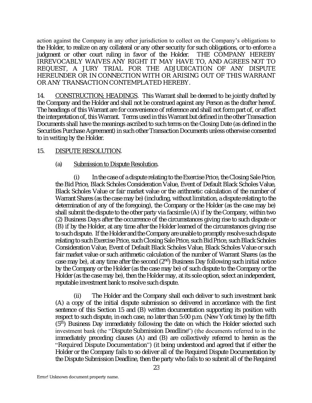action against the Company in any other jurisdiction to collect on the Company’s obligations to the Holder, to realize on any collateral or any other security for such obligations, or to enforce a judgment or other court ruling in favor of the Holder. THE COMPANY HEREBY IRREVOCABLY WAIVES ANY RIGHT IT MAY HAVE TO, AND AGREES NOT TO REQUEST, A JURY TRIAL FOR THE ADJUDICATION OF ANY DISPUTE HEREUNDER OR IN CONNECTION WITH OR ARISING OUT OF THIS WARRANT OR ANY TRANSACTION CONTEMPLATED HEREBY. 14. CONSTRUCTION; HEADINGS. This Warrant shall be deemed to be jointly drafted by the Company and the Holder and shall not be construed against any Person as the drafter hereof. The headings of this Warrant are for convenience of reference and shall not form part of, or affect the interpretation of, this Warrant. Terms used in this Warrant but defined in the other Transaction Documents shall have the meanings ascribed to such terms on the Closing Date (as defined in the Securities Purchase Agreement) in such other Transaction Documents unless otherwise consented to in writing by the Holder. 15. DISPUTE RESOLUTION. (a) Submission to Dispute Resolution. (i) In the case of a dispute relating to the Exercise Price, the Closing Sale Price, the Bid Price, Black Scholes Consideration Value, Event of Default Black Scholes Value, Black Scholes Value or fair market value or the arithmetic calculation of the number of Warrant Shares (as the case may be) (including, without limitation, a dispute relating to the determination of any of the foregoing), the Company or the Holder (as the case may be) shall submit the dispute to the other party via facsimile (A) if by the Company, within two (2) Business Days after the occurrence of the circumstances giving rise to such dispute or (B) if by the Holder, at any time after the Holder learned of the circumstances giving rise to such dispute. If the Holder and the Company are unable to promptly resolve such dispute relating to such Exercise Price, such Closing Sale Price, such Bid Price, such Black Scholes Consideration Value, Event of Default Black Scholes Value, Black Scholes Value or such fair market value or such arithmetic calculation of the number of Warrant Shares (as the case may be), at any time after the second (2nd) Business Day following such initial notice by the Company or the Holder (as the case may be) of such dispute to the Company or the Holder (as the case may be), then the Holder may, at its sole option, select an independent, reputable investment bank to resolve such dispute. (ii) The Holder and the Company shall each deliver to such investment bank (A) a copy of the initial dispute submission so delivered in accordance with the first sentence of this Section 15 and (B) written documentation supporting its position with respect to such dispute, in each case, no later than 5:00 p.m. (New York time) by the fifth (5th) Business Day immediately following the date on which the Holder selected such investment bank (the “Dispute Submission Deadline”) (the documents referred to in the immediately preceding clauses (A) and (B) are collectively referred to herein as the “Required Dispute Documentation”) (it being understood and agreed that if either the Holder or the Company fails to so deliver all of the Required Dispute Documentation by the Dispute Submission Deadline, then the party who fails to so submit all of the Required 23 Error! Unknown document property name.