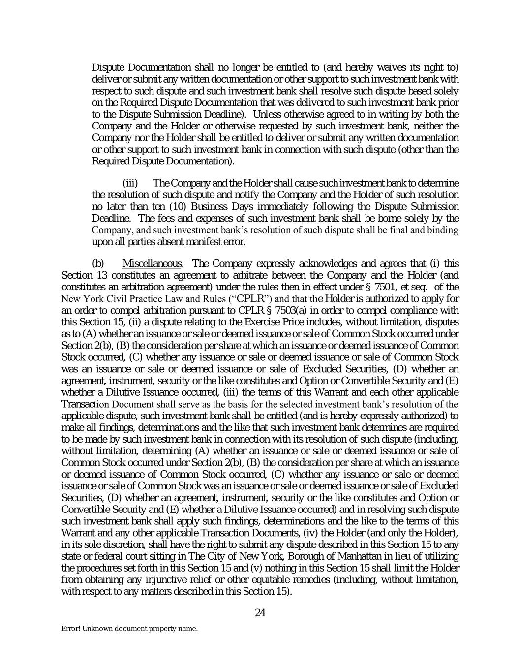 Dispute Documentation shall no longer be entitled to (and hereby waives its right to) deliver or submit any written documentation or other support to such investment bank with respect to such dispute and such investment bank shall resolve such dispute based solely on the Required Dispute Documentation that was delivered to such investment bank prior to the Dispute Submission Deadline). Unless otherwise agreed to in writing by both the Company and the Holder or otherwise requested by such investment bank, neither the Company nor the Holder shall be entitled to deliver or submit any written documentation or other support to such investment bank in connection with such dispute (other than the Required Dispute Documentation). (iii) The Company and the Holder shall cause such investment bank to determine the resolution of such dispute and notify the Company and the Holder of such resolution no later than ten (10) Business Days immediately following the Dispute Submission Deadline. The fees and expenses of such investment bank shall be borne solely by the Company, and such investment bank’s resolution of such dispute shall be final and binding upon all parties absent manifest error. (b) Miscellaneous. The Company expressly acknowledges and agrees that (i) this Section 13 constitutes an agreement to arbitrate between the Company and the Holder (and constitutes an arbitration agreement) under the rules then in effect under § 7501, et seq. of the New York Civil Practice Law and Rules (“CPLR”) and that the Holder is authorized to apply for an order to compel arbitration pursuant to CPLR § 7503(a) in order to compel compliance with this Section 15, (ii) a dispute relating to the Exercise Price includes, without limitation, disputes as to (A) whether an issuance or sale or deemed issuance or sale of Common Stock occurred under Section 2(b), (B) the consideration per share at which an issuance or deemed issuance of Common Stock occurred, (C) whether any issuance or sale or deemed issuance or sale of Common Stock was an issuance or sale or deemed issuance or sale of Excluded Securities, (D) whether an agreement, instrument, security or the like constitutes and Option or Convertible Security and (E) whether a Dilutive Issuance occurred, (iii) the terms of this Warrant and each other applicable Transaction Document shall serve as the basis for the selected investment bank’s resolution of the applicable dispute, such investment bank shall be entitled (and is hereby expressly authorized) to make all findings, determinations and the like that such investment bank determines are required to be made by such investment bank in connection with its resolution of such dispute (including, without limitation, determining (A) whether an issuance or sale or deemed issuance or sale of Common Stock occurred under Section 2(b), (B) the consideration per share at which an issuance or deemed issuance of Common Stock occurred, (C) whether any issuance or sale or deemed issuance or sale of Common Stock was an issuance or sale or deemed issuance or sale of Excluded Securities, (D) whether an agreement, instrument, security or the like constitutes and Option or Convertible Security and (E) whether a Dilutive Issuance occurred) and in resolving such dispute such investment bank shall apply such findings, determinations and the like to the terms of this Warrant and any other applicable Transaction Documents, (iv) the Holder (and only the Holder), in its sole discretion, shall have the right to submit any dispute described in this Section 15 to any state or federal court sitting in The City of New York, Borough of Manhattan in lieu of utilizing the procedures set forth in this Section 15 and (v) nothing in this Section 15 shall limit the Holder from obtaining any injunctive relief or other equitable remedies (including, without limitation, with respect to any matters described in this Section 15). 24 Error! Unknown document property name.