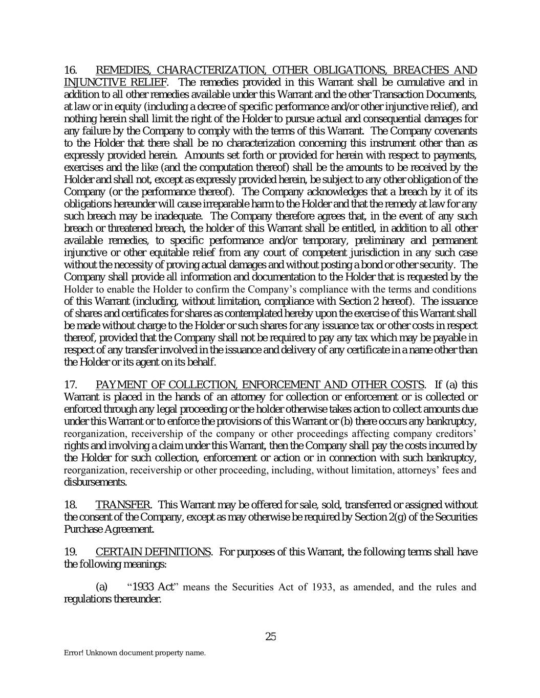 16. REMEDIES, CHARACTERIZATION, OTHER OBLIGATIONS, BREACHES AND INJUNCTIVE RELIEF. The remedies provided in this Warrant shall be cumulative and in addition to all other remedies available under this Warrant and the other Transaction Documents, at law or in equity (including a decree of specific performance and/or other injunctive relief), and nothing herein shall limit the right of the Holder to pursue actual and consequential damages for any failure by the Company to comply with the terms of this Warrant. The Company covenants to the Holder that there shall be no characterization concerning this instrument other than as expressly provided herein. Amounts set forth or provided for herein with respect to payments, exercises and the like (and the computation thereof) shall be the amounts to be received by the Holder and shall not, except as expressly provided herein, be subject to any other obligation of the Company (or the performance thereof). The Company acknowledges that a breach by it of its obligations hereunder will cause irreparable harm to the Holder and that the remedy at law for any such breach may be inadequate. The Company therefore agrees that, in the event of any such breach or threatened breach, the holder of this Warrant shall be entitled, in addition to all other available remedies, to specific performance and/or temporary, preliminary and permanent injunctive or other equitable relief from any court of competent jurisdiction in any such case without the necessity of proving actual damages and without posting a bond or other security. The Company shall provide all information and documentation to the Holder that is requested by the Holder to enable the Holder to confirm the Company’s compliance with the terms and conditions of this Warrant (including, without limitation, compliance with Section 2 hereof). The issuance of shares and certificates for shares as contemplated hereby upon the exercise of this Warrant shall be made without charge to the Holder or such shares for any issuance tax or other costs in respect thereof, provided that the Company shall not be required to pay any tax which may be payable in respect of any transfer involved in the issuance and delivery of any certificate in a name other than the Holder or its agent on its behalf. 17. PAYMENT OF COLLECTION, ENFORCEMENT AND OTHER COSTS. If (a) this Warrant is placed in the hands of an attorney for collection or enforcement or is collected or enforced through any legal proceeding or the holder otherwise takes action to collect amounts due under this Warrant or to enforce the provisions of this Warrant or (b) there occurs any bankruptcy, reorganization, receivership of the company or other proceedings affecting company creditors’ rights and involving a claim under this Warrant, then the Company shall pay the costs incurred by the Holder for such collection, enforcement or action or in connection with such bankruptcy, reorganization, receivership or other proceeding, including, without limitation, attorneys’ fees and disbursements. 18. TRANSFER. This Warrant may be offered for sale, sold, transferred or assigned without the consent of the Company, except as may otherwise be required by Section 2(g) of the Securities Purchase Agreement. 19. CERTAIN DEFINITIONS. For purposes of this Warrant, the following terms shall have the following meanings: (a) “1933 Act” means the Securities Act of 1933, as amended, and the rules and regulations thereunder. 25 Error! Unknown document property name.