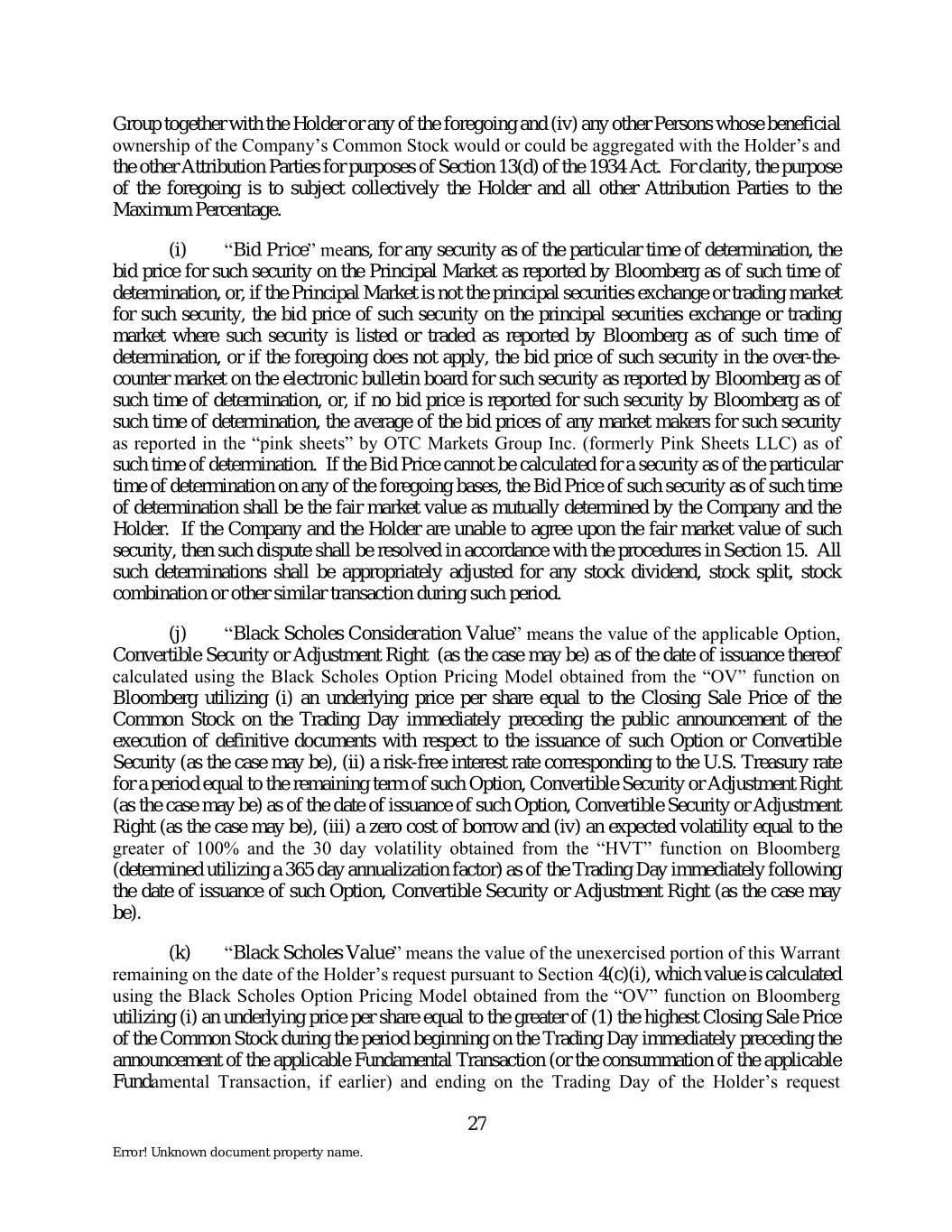 Group together with the Holder or any of the foregoing and (iv) any other Persons whose beneficial ownership of the Company’s Common Stock would or could be aggregated with the Holder’s and the other Attribution Parties for purposes of Section 13(d) of the 1934 Act. For clarity, the purpose of the foregoing is to subject collectively the Holder and all other Attribution Parties to the Maximum Percentage. (i) “Bid Price” means, for any security as of the particular time of determination, the bid price for such security on the Principal Market as reported by Bloomberg as of such time of determination, or, if the Principal Market is not the principal securities exchange or trading market for such security, the bid price of such security on the principal securities exchange or trading market where such security is listed or traded as reported by Bloomberg as of such time of determination, or if the foregoing does not apply, the bid price of such security in the over-the- counter market on the electronic bulletin board for such security as reported by Bloomberg as of such time of determination, or, if no bid price is reported for such security by Bloomberg as of such time of determination, the average of the bid prices of any market makers for such security as reported in the “pink sheets” by OTC Markets Group Inc. (formerly Pink Sheets LLC) as of such time of determination. If the Bid Price cannot be calculated for a security as of the particular time of determination on any of the foregoing bases, the Bid Price of such security as of such time of determination shall be the fair market value as mutually determined by the Company and the Holder. If the Company and the Holder are unable to agree upon the fair market value of such security, then such dispute shall be resolved in accordance with the procedures in Section 15. All such determinations shall be appropriately adjusted for any stock dividend, stock split, stock combination or other similar transaction during such period. (j) “Black Scholes Consideration Value” means the value of the applicable Option, Convertible Security or Adjustment Right (as the case may be) as of the date of issuance thereof calculated using the Black Scholes Option Pricing Model obtained from the “OV” function on Bloomberg utilizing (i) an underlying price per share equal to the Closing Sale Price of the Common Stock on the Trading Day immediately preceding the public announcement of the execution of definitive documents with respect to the issuance of such Option or Convertible Security (as the case may be), (ii) a risk-free interest rate corresponding to the U.S. Treasury rate for a period equal to the remaining term of such Option, Convertible Security or Adjustment Right (as the case may be) as of the date of issuance of such Option, Convertible Security or Adjustment Right (as the case may be), (iii) a zero cost of borrow and (iv) an expected volatility equal to the greater of 100% and the 30 day volatility obtained from the “HVT” function on Bloomberg (determined utilizing a 365 day annualization factor) as of the Trading Day immediately following the date of issuance of such Option, Convertible Security or Adjustment Right (as the case may be). (k) “Black Scholes Value” means the value of the unexercised portion of this Warrant remaining on the date of the Holder’s request pursuant to Section 4(c)(i), which value is calculated using the Black Scholes Option Pricing Model obtained from the “OV” function on Bloomberg utilizing (i) an underlying price per share equal to the greater of (1) the highest Closing Sale Price of the Common Stock during the period beginning on the Trading Day immediately preceding the announcement of the applicable Fundamental Transaction (or the consummation of the applicable Fundamental Transaction, if earlier) and ending on the Trading Day of the Holder’s request 27 Error! Unknown document property name.