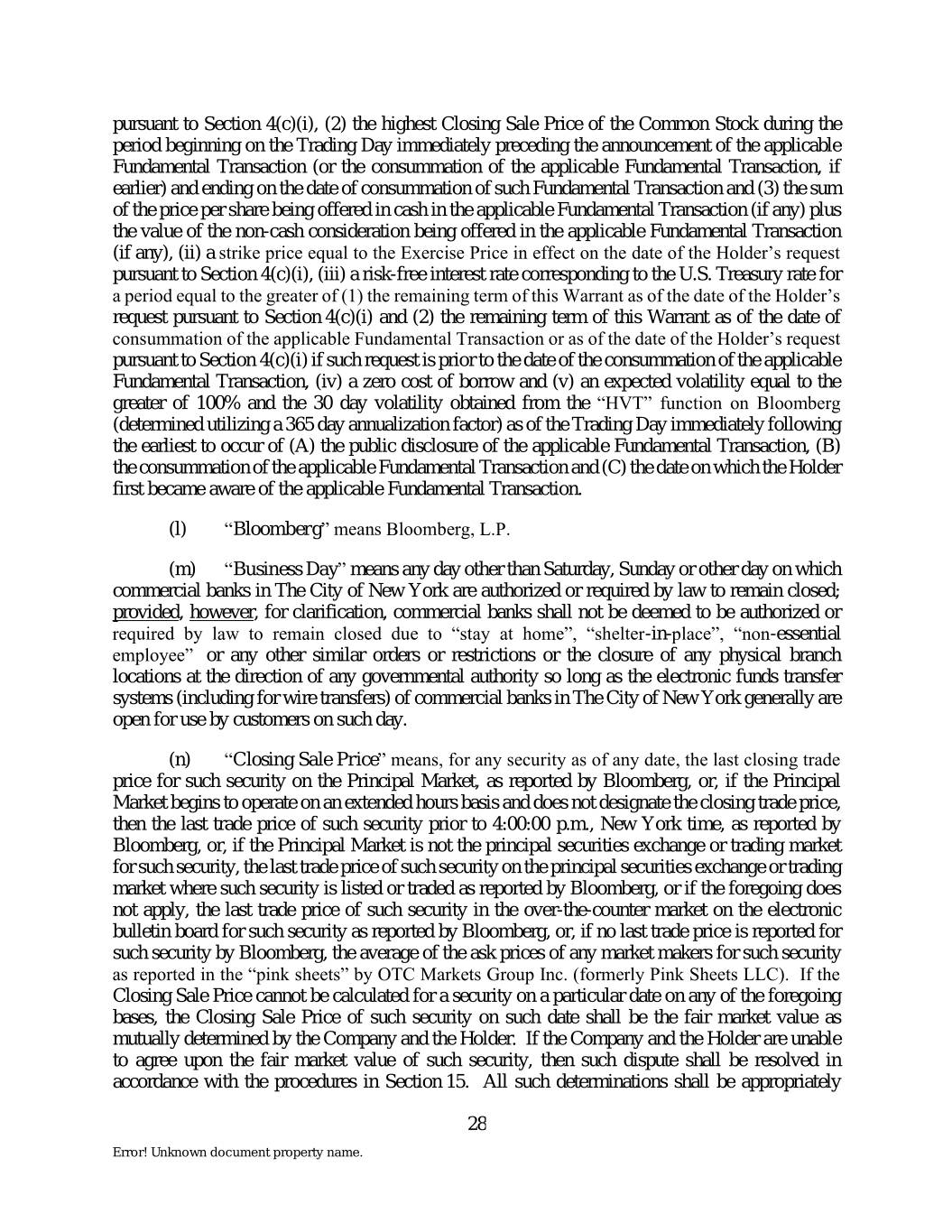 pursuant to Section 4(c)(i), (2) the highest Closing Sale Price of the Common Stock during the period beginning on the Trading Day immediately preceding the announcement of the applicable Fundamental Transaction (or the consummation of the applicable Fundamental Transaction, if earlier) and ending on the date of consummation of such Fundamental Transaction and (3) the sum of the price per share being offered in cash in the applicable Fundamental Transaction (if any) plus the value of the non-cash consideration being offered in the applicable Fundamental Transaction (if any), (ii) a strike price equal to the Exercise Price in effect on the date of the Holder’s request pursuant to Section 4(c)(i), (iii) a risk-free interest rate corresponding to the U.S. Treasury rate for a period equal to the greater of (1) the remaining term of this Warrant as of the date of the Holder’s request pursuant to Section 4(c)(i) and (2) the remaining term of this Warrant as of the date of consummation of the applicable Fundamental Transaction or as of the date of the Holder’s request pursuant to Section 4(c)(i) if such request is prior to the date of the consummation of the applicable Fundamental Transaction, (iv) a zero cost of borrow and (v) an expected volatility equal to the greater of 100% and the 30 day volatility obtained from the “HVT” function on Bloomberg (determined utilizing a 365 day annualization factor) as of the Trading Day immediately following the earliest to occur of (A) the public disclosure of the applicable Fundamental Transaction, (B) the consummation of the applicable Fundamental Transaction and (C) the date on which the Holder first became aware of the applicable Fundamental Transaction. (l) “Bloomberg” means Bloomberg, L.P. (m) “Business Day” means any day other than Saturday, Sunday or other day on which commercial banks in The City of New York are authorized or required by law to remain closed; provided, however, for clarification, commercial banks shall not be deemed to be authorized or required by law to remain closed due to “stay at home”, “shelter-in-place”, “non-essential employee” or any other similar orders or restrictions or the closure of any physical branch locations at the direction of any governmental authority so long as the electronic funds transfer systems (including for wire transfers) of commercial banks in The City of New York generally are open for use by customers on such day. (n) “Closing Sale Price” means, for any security as of any date, the last closing trade price for such security on the Principal Market, as reported by Bloomberg, or, if the Principal Market begins to operate on an extended hours basis and does not designate the closing trade price, then the last trade price of such security prior to 4:00:00 p.m., New York time, as reported by Bloomberg, or, if the Principal Market is not the principal securities exchange or trading market for such security, the last trade price of such security on the principal securities exchange or trading market where such security is listed or traded as reported by Bloomberg, or if the foregoing does not apply, the last trade price of such security in the over-the-counter market on the electronic bulletin board for such security as reported by Bloomberg, or, if no last trade price is reported for such security by Bloomberg, the average of the ask prices of any market makers for such security as reported in the “pink sheets” by OTC Markets Group Inc. (formerly Pink Sheets LLC). If the Closing Sale Price cannot be calculated for a security on a particular date on any of the foregoing bases, the Closing Sale Price of such security on such date shall be the fair market value as mutually determined by the Company and the Holder. If the Company and the Holder are unable to agree upon the fair market value of such security, then such dispute shall be resolved in accordance with the procedures in Section 15. All such determinations shall be appropriately 28 Error! Unknown document property name.