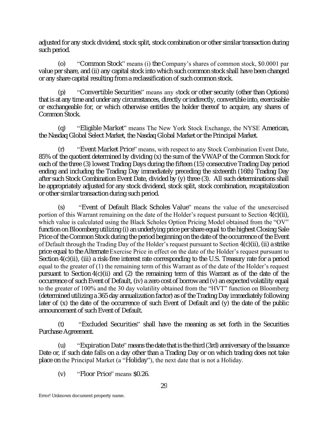 adjusted for any stock dividend, stock split, stock combination or other similar transaction during such period. (o) “Common Stock” means (i) the Company’s shares of common stock, $0.0001 par value per share, and (ii) any capital stock into which such common stock shall have been changed or any share capital resulting from a reclassification of such common stock. (p) “Convertible Securities” means any stock or other security (other than Options) that is at any time and under any circumstances, directly or indirectly, convertible into, exercisable or exchangeable for, or which otherwise entitles the holder thereof to acquire, any shares of Common Stock. (q) “Eligible Market” means The New York Stock Exchange, the NYSE American, the Nasdaq Global Select Market, the Nasdaq Global Market or the Principal Market. (r) “Event Market Price” means, with respect to any Stock Combination Event Date, 85% of the quotient determined by dividing (x) the sum of the VWAP of the Common Stock for each of the three (3) lowest Trading Days during the fifteen (15) consecutive Trading Day period ending and including the Trading Day immediately preceding the sixteenth (16th) Trading Day after such Stock Combination Event Date, divided by (y) three (3). All such determinations shall be appropriately adjusted for any stock dividend, stock split, stock combination, recapitalization or other similar transaction during such period. (s) “Event of Default Black Scholes Value” means the value of the unexercised portion of this Warrant remaining on the date of the Holder’s request pursuant to Section 4(c)(ii), which value is calculated using the Black Scholes Option Pricing Model obtained from the “OV” function on Bloomberg utilizing (i) an underlying price per share equal to the highest Closing Sale Price of the Common Stock during the period beginning on the date of the occurrence of the Event of Default through the Trading Day of the Holder’s request pursuant to Section 4(c)(ii), (ii) a strike price equal to the Alternate Exercise Price in effect on the date of the Holder’s request pursuant to Section 4(c)(ii), (iii) a risk-free interest rate corresponding to the U.S. Treasury rate for a period equal to the greater of (1) the remaining term of this Warrant as of the date of the Holder’s request pursuant to Section 4(c)(ii) and (2) the remaining term of this Warrant as of the date of the occurrence of such Event of Default, (iv) a zero cost of borrow and (v) an expected volatility equal to the greater of 100% and the 30 day volatility obtained from the “HVT” function on Bloomberg (determined utilizing a 365 day annualization factor) as of the Trading Day immediately following later of (x) the date of the occurrence of such Event of Default and (y) the date of the public announcement of such Event of Default. (t) “Excluded Securities” shall have the meaning as set forth in the Securities Purchase Agreement. (u) “Expiration Date” means the date that is the third (3rd) anniversary of the Issuance Date or, if such date falls on a day other than a Trading Day or on which trading does not take place on the Principal Market (a “Holiday”), the next date that is not a Holiday. (v) “Floor Price” means $0.26. 29 Error! Unknown document property name.