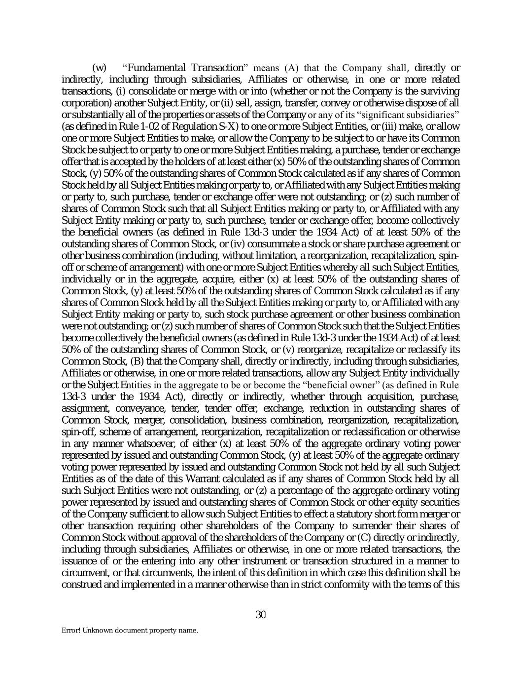 (w) “Fundamental Transaction” means (A) that the Company shall, directly or indirectly, including through subsidiaries, Affiliates or otherwise, in one or more related transactions, (i) consolidate or merge with or into (whether or not the Company is the surviving corporation) another Subject Entity, or (ii) sell, assign, transfer, convey or otherwise dispose of all or substantially all of the properties or assets of the Company or any of its “significant subsidiaries” (as defined in Rule 1-02 of Regulation S-X) to one or more Subject Entities, or (iii) make, or allow one or more Subject Entities to make, or allow the Company to be subject to or have its Common Stock be subject to or party to one or more Subject Entities making, a purchase, tender or exchange offer that is accepted by the holders of at least either (x) 50% of the outstanding shares of Common Stock, (y) 50% of the outstanding shares of Common Stock calculated as if any shares of Common Stock held by all Subject Entities making or party to, or Affiliated with any Subject Entities making or party to, such purchase, tender or exchange offer were not outstanding; or (z) such number of shares of Common Stock such that all Subject Entities making or party to, or Affiliated with any Subject Entity making or party to, such purchase, tender or exchange offer, become collectively the beneficial owners (as defined in Rule 13d-3 under the 1934 Act) of at least 50% of the outstanding shares of Common Stock, or (iv) consummate a stock or share purchase agreement or other business combination (including, without limitation, a reorganization, recapitalization, spin- off or scheme of arrangement) with one or more Subject Entities whereby all such Subject Entities, individually or in the aggregate, acquire, either (x) at least 50% of the outstanding shares of Common Stock, (y) at least 50% of the outstanding shares of Common Stock calculated as if any shares of Common Stock held by all the Subject Entities making or party to, or Affiliated with any Subject Entity making or party to, such stock purchase agreement or other business combination were not outstanding; or (z) such number of shares of Common Stock such that the Subject Entities become collectively the beneficial owners (as defined in Rule 13d-3 under the 1934 Act) of at least 50% of the outstanding shares of Common Stock, or (v) reorganize, recapitalize or reclassify its Common Stock, (B) that the Company shall, directly or indirectly, including through subsidiaries, Affiliates or otherwise, in one or more related transactions, allow any Subject Entity individually or the Subject Entities in the aggregate to be or become the “beneficial owner” (as defined in Rule 13d-3 under the 1934 Act), directly or indirectly, whether through acquisition, purchase, assignment, conveyance, tender, tender offer, exchange, reduction in outstanding shares of Common Stock, merger, consolidation, business combination, reorganization, recapitalization, spin-off, scheme of arrangement, reorganization, recapitalization or reclassification or otherwise in any manner whatsoever, of either (x) at least 50% of the aggregate ordinary voting power represented by issued and outstanding Common Stock, (y) at least 50% of the aggregate ordinary voting power represented by issued and outstanding Common Stock not held by all such Subject Entities as of the date of this Warrant calculated as if any shares of Common Stock held by all such Subject Entities were not outstanding, or (z) a percentage of the aggregate ordinary voting power represented by issued and outstanding shares of Common Stock or other equity securities of the Company sufficient to allow such Subject Entities to effect a statutory short form merger or other transaction requiring other shareholders of the Company to surrender their shares of Common Stock without approval of the shareholders of the Company or (C) directly or indirectly, including through subsidiaries, Affiliates or otherwise, in one or more related transactions, the issuance of or the entering into any other instrument or transaction structured in a manner to circumvent, or that circumvents, the intent of this definition in which case this definition shall be construed and implemented in a manner otherwise than in strict conformity with the terms of this 30 Error! Unknown document property name.