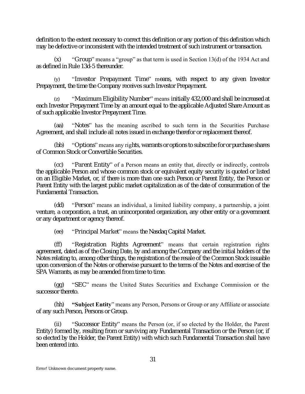 definition to the extent necessary to correct this definition or any portion of this definition which may be defective or inconsistent with the intended treatment of such instrument or transaction. (x) “Group” means a “group” as that term is used in Section 13(d) of the 1934 Act and as defined in Rule 13d-5 thereunder. (y) “Investor Prepayment Time” means, with respect to any given Investor Prepayment, the time the Company receives such Investor Prepayment. (z) “Maximum Eligibility Number” means initially 432,000 and shall be increased at each Investor Prepayment Time by an amount equal to the applicable Adjusted Share Amount as of such applicable Investor Prepayment Time. (aa) “Notes” has the meaning ascribed to such term in the Securities Purchase Agreement, and shall include all notes issued in exchange therefor or replacement thereof. (bb) “Options” means any rights, warrants or options to subscribe for or purchase shares of Common Stock or Convertible Securities. (cc) “Parent Entity” of a Person means an entity that, directly or indirectly, controls the applicable Person and whose common stock or equivalent equity security is quoted or listed on an Eligible Market, or, if there is more than one such Person or Parent Entity, the Person or Parent Entity with the largest public market capitalization as of the date of consummation of the Fundamental Transaction. (dd) “Person” means an individual, a limited liability company, a partnership, a joint venture, a corporation, a trust, an unincorporated organization, any other entity or a government or any department or agency thereof. (ee) “Principal Market” means the Nasdaq Capital Market. (ff) “Registration Rights Agreement” means that certain registration rights agreement, dated as of the Closing Date, by and among the Company and the initial holders of the Notes relating to, among other things, the registration of the resale of the Common Stock issuable upon conversion of the Notes or otherwise pursuant to the terms of the Notes and exercise of the SPA Warrants, as may be amended from time to time. (gg) “SEC” means the United States Securities and Exchange Commission or the successor thereto. (hh) “Subject Entity” means any Person, Persons or Group or any Affiliate or associate of any such Person, Persons or Group. (ii) “Successor Entity” means the Person (or, if so elected by the Holder, the Parent Entity) formed by, resulting from or surviving any Fundamental Transaction or the Person (or, if so elected by the Holder, the Parent Entity) with which such Fundamental Transaction shall have been entered into. 31 Error! Unknown document property name.