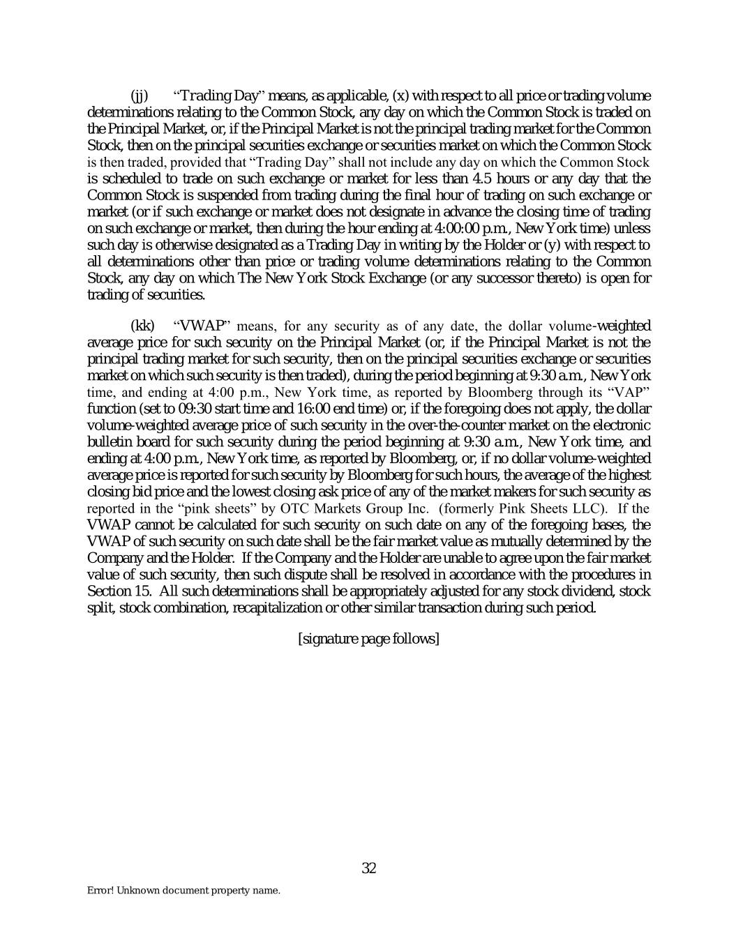 (jj) “Trading Day” means, as applicable, (x) with respect to all price or trading volume determinations relating to the Common Stock, any day on which the Common Stock is traded on the Principal Market, or, if the Principal Market is not the principal trading market for the Common Stock, then on the principal securities exchange or securities market on which the Common Stock is then traded, provided that “Trading Day” shall not include any day on which the Common Stock is scheduled to trade on such exchange or market for less than 4.5 hours or any day that the Common Stock is suspended from trading during the final hour of trading on such exchange or market (or if such exchange or market does not designate in advance the closing time of trading on such exchange or market, then during the hour ending at 4:00:00 p.m., New York time) unless such day is otherwise designated as a Trading Day in writing by the Holder or (y) with respect to all determinations other than price or trading volume determinations relating to the Common Stock, any day on which The New York Stock Exchange (or any successor thereto) is open for trading of securities. (kk) “VWAP” means, for any security as of any date, the dollar volume-weighted average price for such security on the Principal Market (or, if the Principal Market is not the principal trading market for such security, then on the principal securities exchange or securities market on which such security is then traded), during the period beginning at 9:30 a.m., New York time, and ending at 4:00 p.m., New York time, as reported by Bloomberg through its “VAP” function (set to 09:30 start time and 16:00 end time) or, if the foregoing does not apply, the dollar volume-weighted average price of such security in the over-the-counter market on the electronic bulletin board for such security during the period beginning at 9:30 a.m., New York time, and ending at 4:00 p.m., New York time, as reported by Bloomberg, or, if no dollar volume-weighted average price is reported for such security by Bloomberg for such hours, the average of the highest closing bid price and the lowest closing ask price of any of the market makers for such security as reported in the “pink sheets” by OTC Markets Group Inc. (formerly Pink Sheets LLC). If the VWAP cannot be calculated for such security on such date on any of the foregoing bases, the VWAP of such security on such date shall be the fair market value as mutually determined by the Company and the Holder. If the Company and the Holder are unable to agree upon the fair market value of such security, then such dispute shall be resolved in accordance with the procedures in Section 15. All such determinations shall be appropriately adjusted for any stock dividend, stock split, stock combination, recapitalization or other similar transaction during such period. [signature page follows] 32 Error! Unknown document property name.