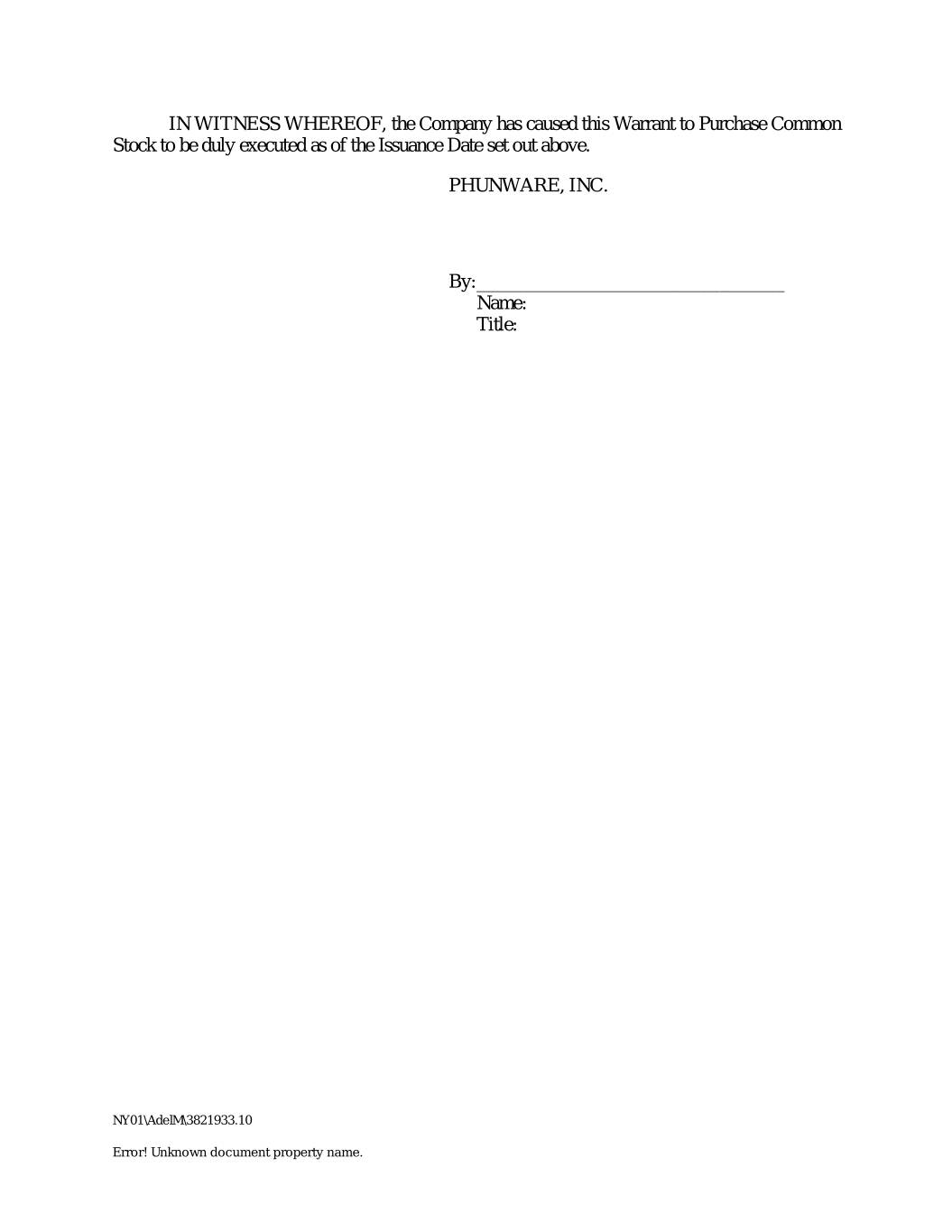 IN WITNESS WHEREOF, the Company has caused this Warrant to Purchase Common Stock to be duly executed as of the Issuance Date set out above. PHUNWARE, INC. By: _________________________________ Name: Title: NY01\AdelM\3821933.10 Error! Unknown document property name.