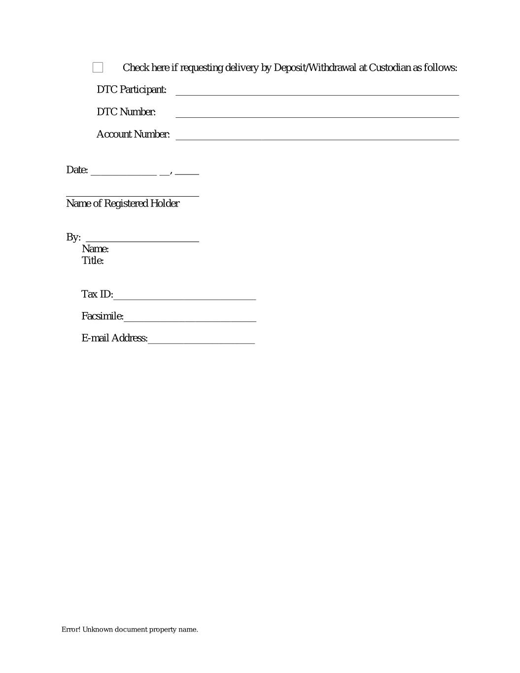 Check here if requesting delivery by Deposit/Withdrawal at Custodian as follows: DTC Participant: DTC Number: Account Number: Date: _____________ __, Name of Registered Holder By: Name: Title: Tax ID:____________________________ Facsimile:__________________________ E-mail Address:_____________________ Error! Unknown document property name.