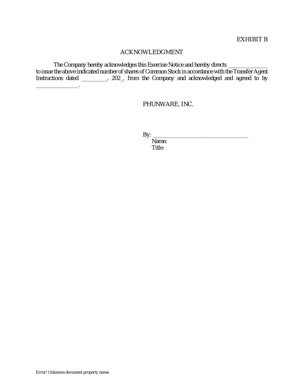 EXHIBIT B ACKNOWLEDGMENT The Company hereby acknowledges this Exercise Notice and hereby directs ______________ to issue the above indicated number of shares of Common Stock in accordance with the Transfer Agent Instructions dated _________, 202_, from the Company and acknowledged and agreed to by _______________. PHUNWARE, INC. By: _________________________________ Name: Title: Error! Unknown document property name.