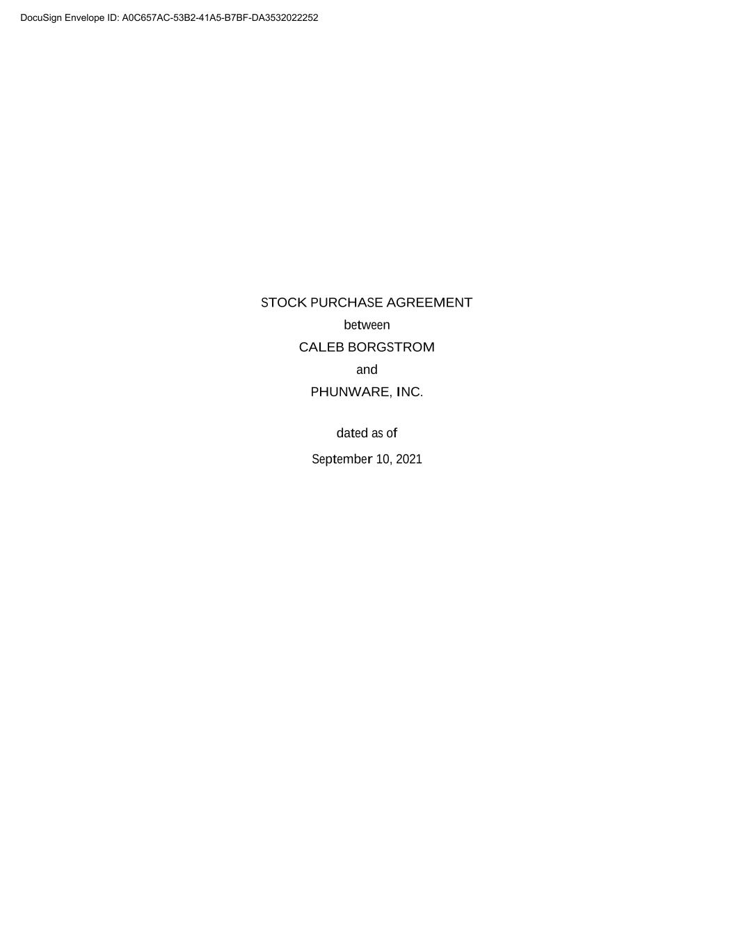 STOCK PURCHASE AGREEMENT between CALEB BORGSTROM and PHUNWARE, INC. dated as of September 10, 2021 DocuSign Envelope ID: A0C657AC-53B2-41A5-B7BF-DA3532022252